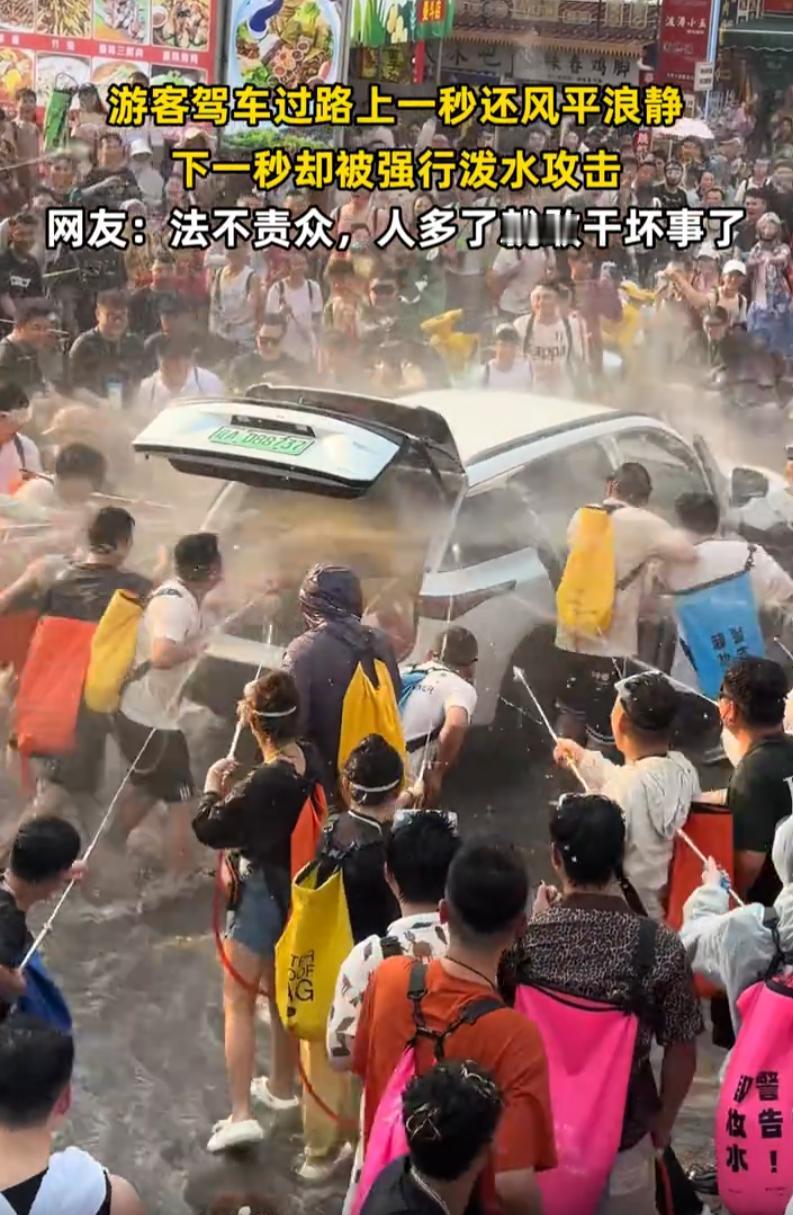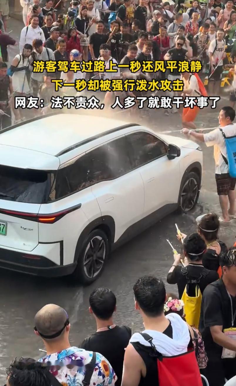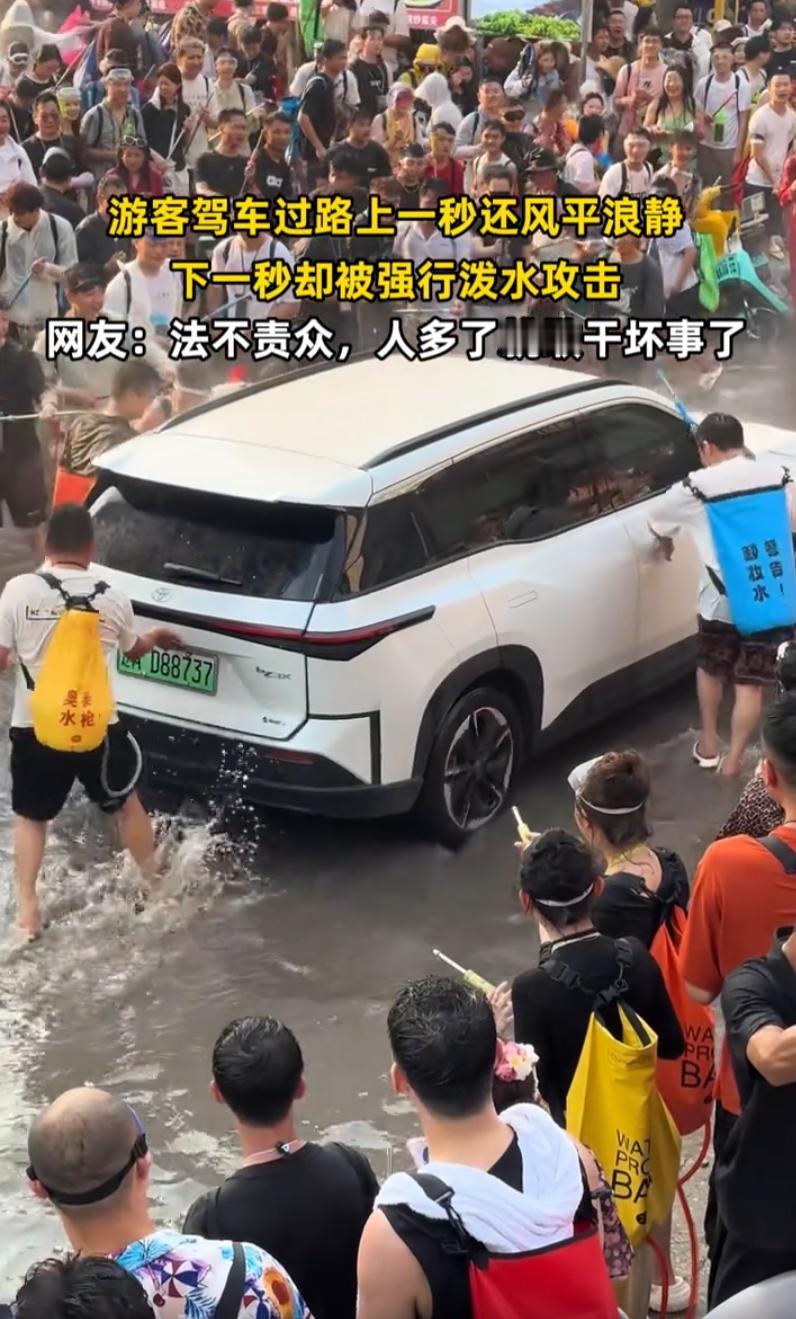 这样的泼水节已经变味了!云南泼水节,一辆辽A的白色新能源车路过,前一秒大家还只是往车上呲水,下一秒画风突变,几名男子竟然直接把车子车门和后备箱打开,随后强行泼水攻击,网友怒了:这泡水了算谁的? 视频里,两名男子觉得光往车上呲水不过瘾。一个直接去拉副驾驶的门把手,另一个按下了后备箱的开关。后备箱一打开,一群人围上去,对着车里就是一顿猛泼 车主是什么感受,虽然屏幕外的人不知道。但可以想象到,车子里直接泡了水,换谁遇到这种事,心里都不会舒服 现场有人觉得不合适,就把这一幕发到了网上,不少网友看到后也觉得气愤,有网友说:法不责众,人多了就敢干坏事了 这话听着刺耳,但想想也不是没道理。几个人凑在一起,胆子就大了,平时不会做的事,在人群里就觉得无所谓。反正大家都在闹,谁也不好意思较真 问题是,热闹归热闹,别拿别人的东西不当回事 泼水节的核心是好客和祝福,不是借着节日的名头撒欢。车是人家真金白银买的,不是道具。你把人家后备箱打开往里泼水的时候,考虑过车主的感受吗? 这几年每到泼水节,都会有一些类似的争议。有人拿高压水枪对着人脸喷,有人追着骑电动车的泼,现在又来了开人家车门、后备箱的操作 说到底,节日气氛不是挡箭牌。人多不是胡来的理由,图开心也不能不管不顾 这位外地牌照的车主,或许还是专门赶过来的,可能就是想体验一下不一样的风土人情。结果被人把车当成了泼水靶子,祝福没收到,倒是收到了一后备箱的水