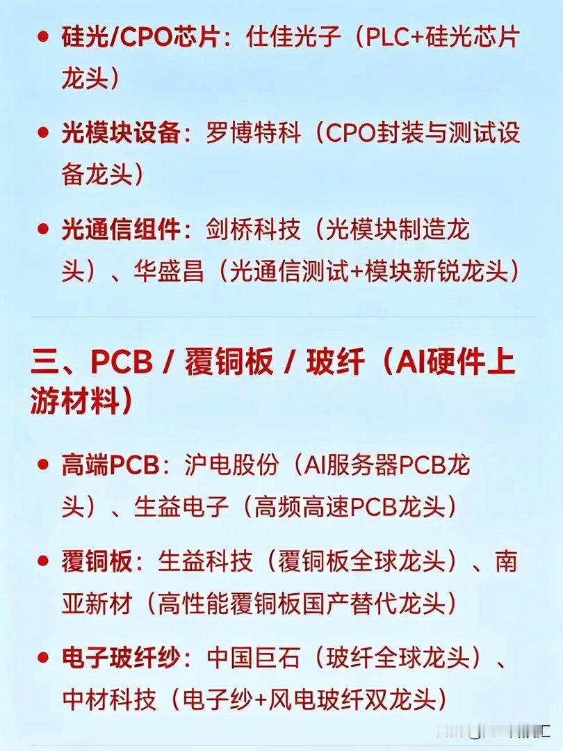 覆铜板:生益科技(覆铜板全球龙头)、南亚新材(高性能覆铜板国产替代龙头)