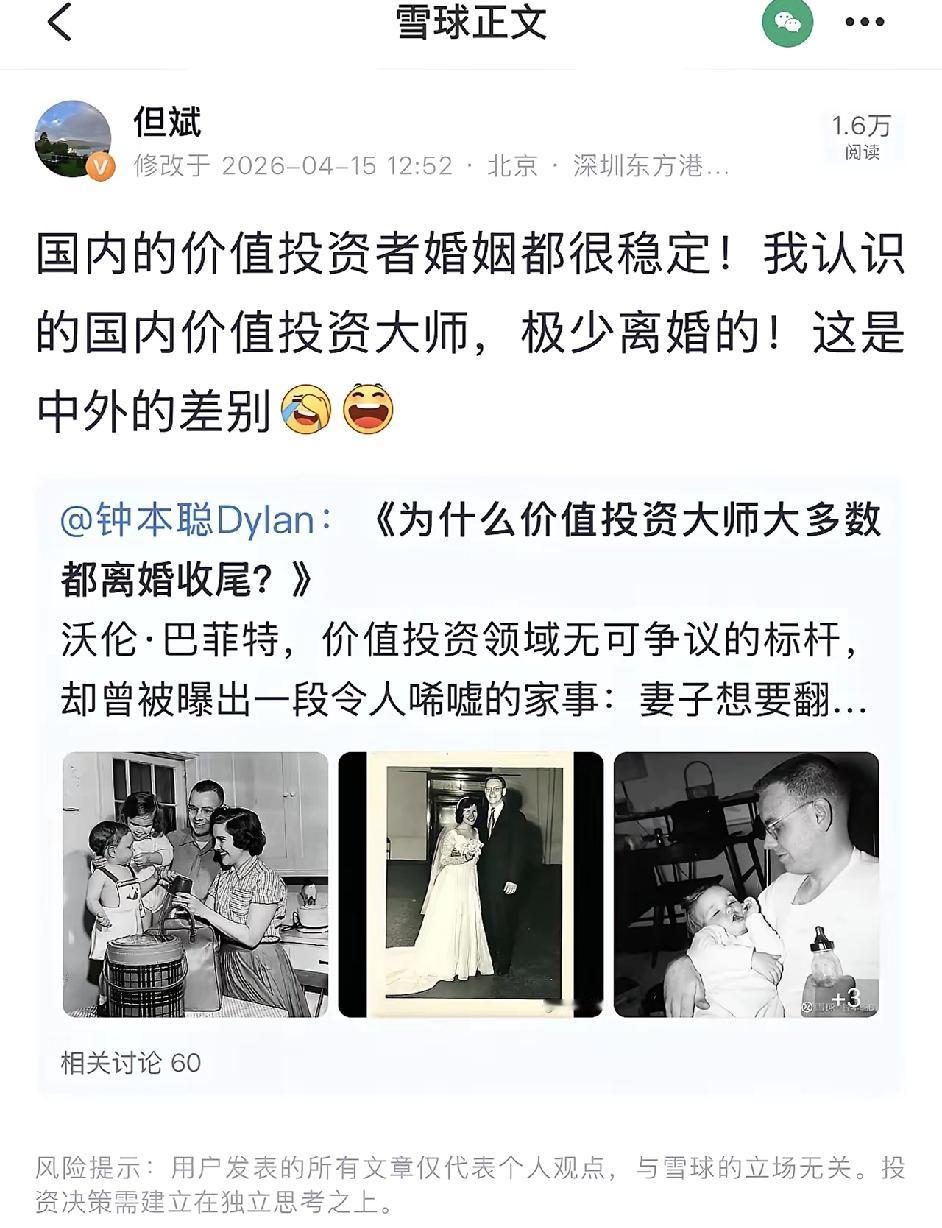 但斌说“国内的价值投资者婚姻都很稳定”,明显是想对价投派的褒和粉,变相对量化乃至炒作派的否定,我估计他因此要被绝大多数股民喷。[捂脸] 一方面,他这话可能直接引发非价投派的不满而被喷; 另一方面,都知道夫妻共患难易共富贵难,价投者婚姻稳定的主要原因,可能正是投资不挣钱甚至还亏本,没钱就不用争财产,还离哪门子婚?这一下就戳到痛点,让价投派也不高兴,不得不喷。[捂脸][捂脸] 不知但总自己是哪个派别的股民?