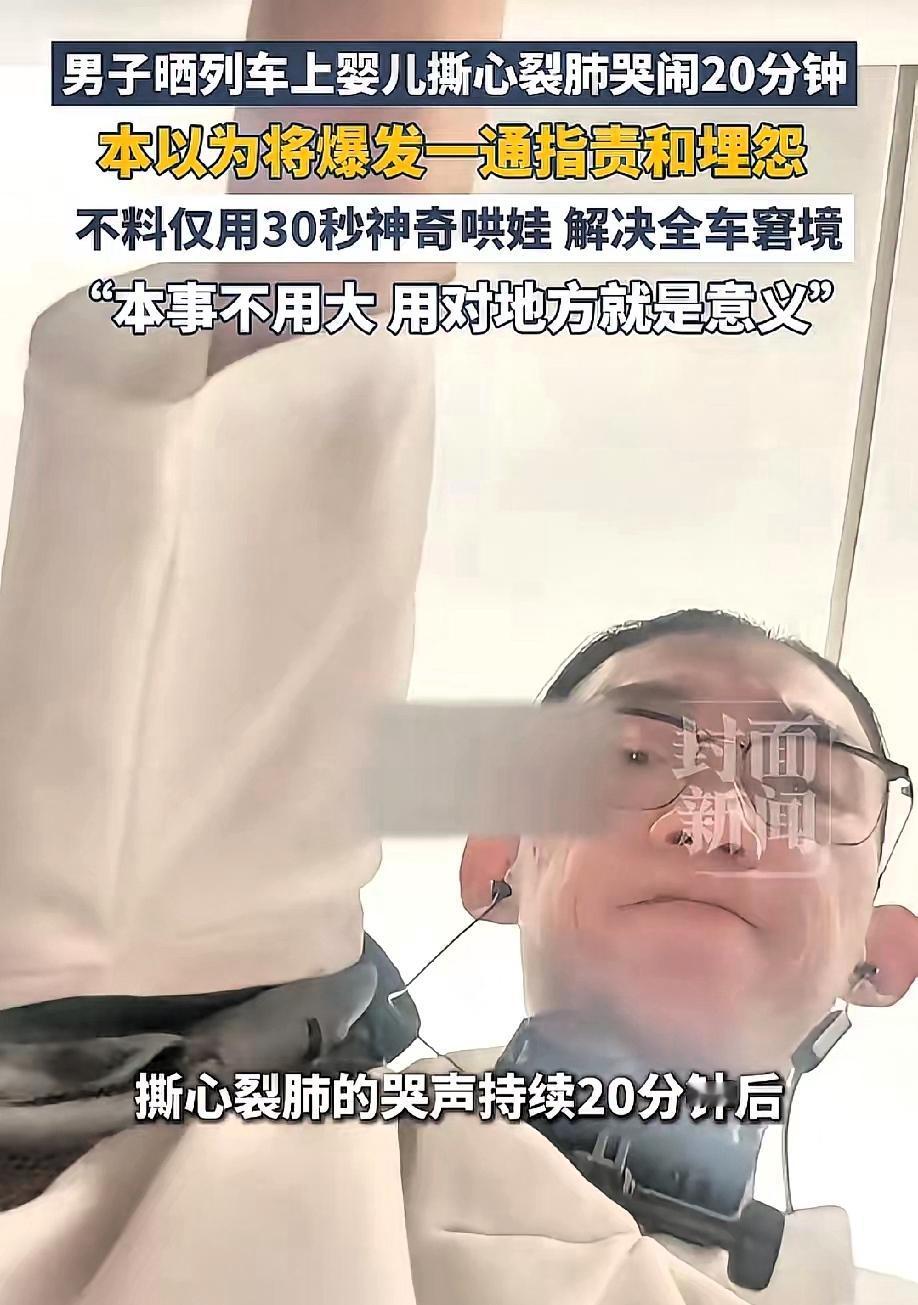 婴儿在车厢里撕心裂肺的哭了20分钟,男子忍无可忍,放下手机朝婴儿走过去,他没有表现出不满,而是温和地告诉宝妈,自己有安抚孩子的经验,可以试着帮忙。 宝妈在慌乱之中将孩子递给了他,男子先轻柔地顺着孩子身体检查,排除身体不适的情况,随后用常用的团抱姿势调整抱法,很快就让孩子平静了下来。 据了解,这名男子是一名儿童摄影师,日常工作中经常接触婴幼儿,因此熟悉一些常见的安抚方式。他后续也说明,当时听到孩子长时间哭闹,心里更多的是心疼孩子,也体谅独自带孩子的母亲不容易,所以才主动上前帮忙,整个过程简单且自然。 这件事在网上传开后,很多人都表达了认可。大家普遍觉得,在公共场合遇到孩子哭闹,指责与抱怨很容易,真正难的是理解与伸手帮忙。带娃出行本身就有很多突发情况,宝妈一个人应对时常常手忙脚乱,陌生人的一点善意,就能缓解很大的压力。 真正的教养,往往体现在对他人处境的体谅上。不随意评判他人,不轻易宣泄情绪,在力所能及的范围内伸出援手,这才是更值得提倡的行为。生活中多一些包容,少一些苛责,公共环境也会变得更加舒心。 其实哄娃也有不少实用方法,排除饥饿、大小便等问题后,适当更换抱姿、使用白噪音等,都能起到一定效果。