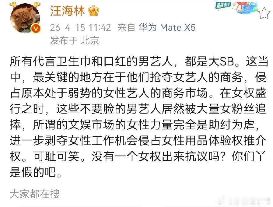 汪海林这波属实有点激动过头了😂汪海林老师又双叒叕开炮了,这次直接把代言口红的男星一锅端,连杨洋、千玺、肖战这些顶流全点名,用词还这么冲,属实没必要啊!咱就说,男星代言口红哪是抢女艺人商务啊?明明是品牌和市场双向奔赴!顶流男星一官宣,粉丝直接把口红买断货,给品牌赚麻了,市场盘子越做越大,女艺人的美妆资源只会更多,哪来的“侵占机会”一说?口红就是个商品,谁能带销量谁就代言,现在消费市场早就不搞“性别绑定”那套了,男星带美妆货本来就是行业常态。把正常商业合作扯到对立上,还骂得这么难听,属实是为了博眼球硬引战了~