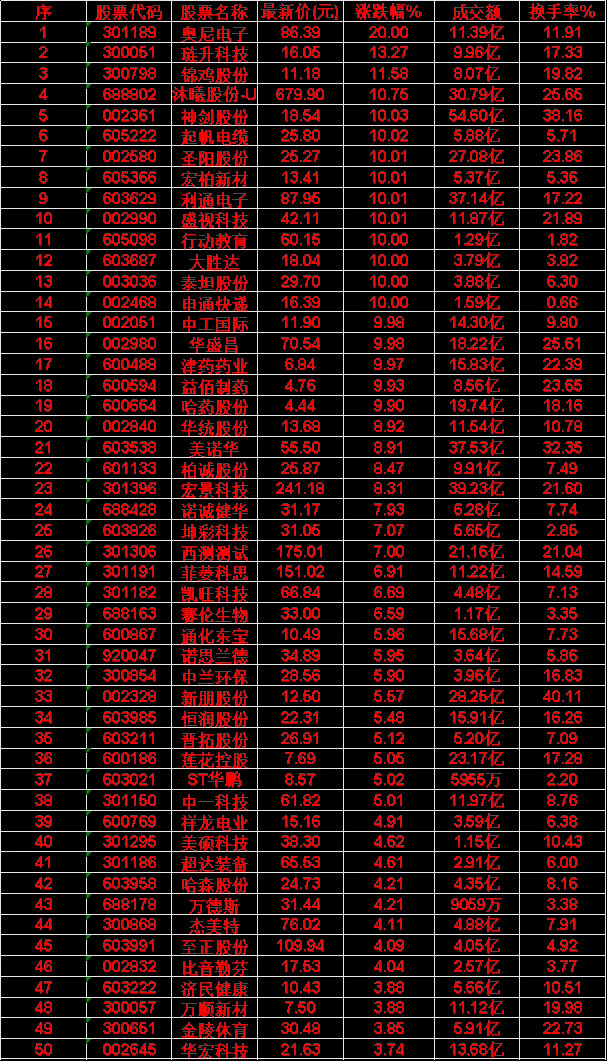奥尼电子:最新价 86.39 元,涨跌幅 +20.00%琏升科技:最新价 16.05 元,涨跌幅 +13.27%锦鸡股份:最新价 11.18 元,涨跌幅 +11.58%沐曦股份-U:最新价 679.90 元,涨跌幅 +10.75%神剑股份:最新价 18.54 元,涨跌幅 +10.03%起帆电缆:最新价 25.80 元,涨跌幅 +10.02%