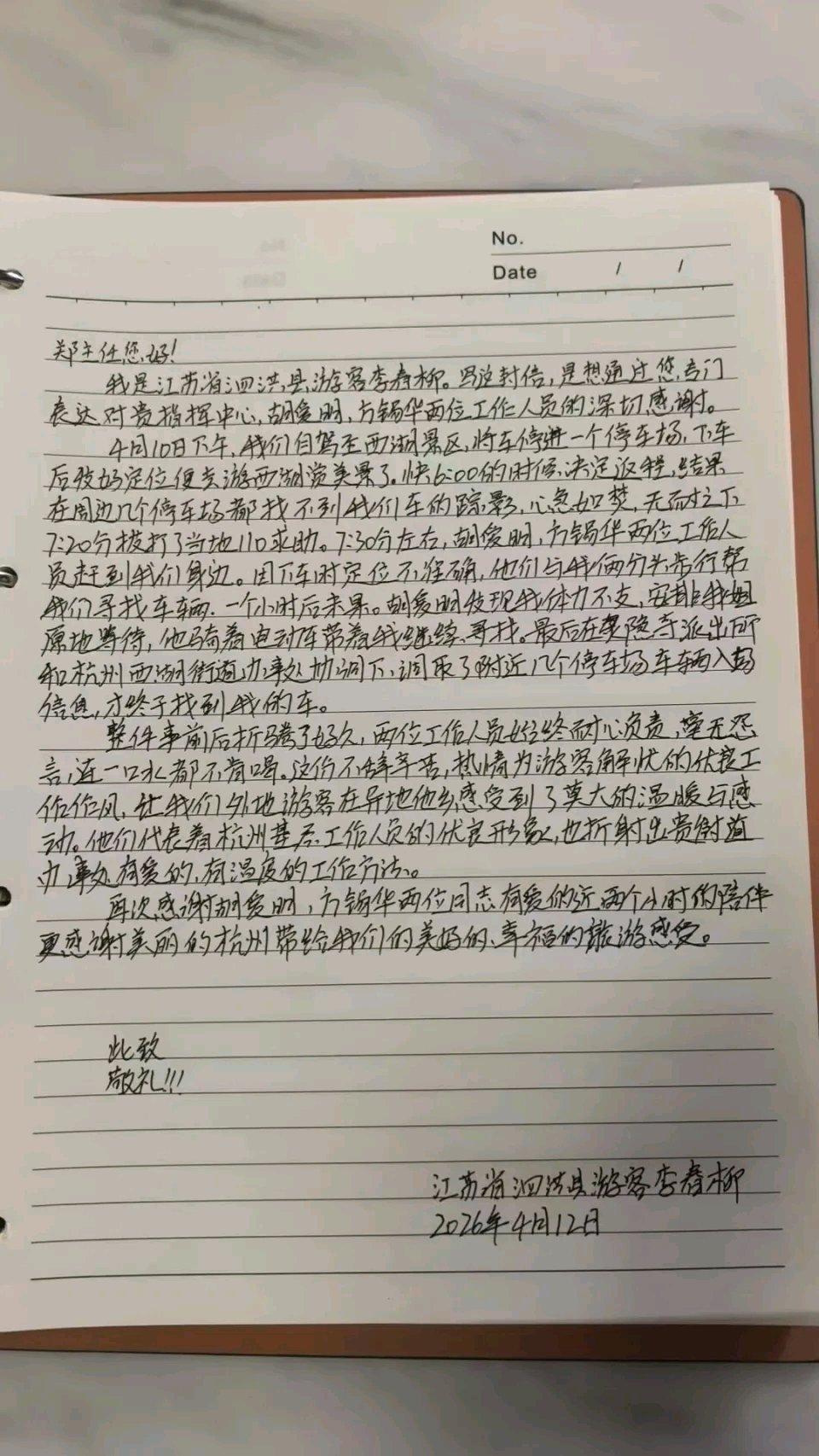 杭州辅警真是暖心担当!江苏姐妹俩在西湖边停车后忘了位置,体力透支都没找到车,辅警一连帮忙找了7个停车场,这耐心和热心太让人感动,妹妹手写感谢信也是实至名归。 其实杭州辅警暖心事儿可不少。“兔子警官”李语蔚,用“哄孩子式执法”,让处罚也能让司机心悦诚服,还入围了2025年最美“浙警”。还有辅警在游客母亲摔伤时,奔跑在白堤上引导救护车,让其4分钟就到达现场。杭州辅警们在西湖这个复杂区域,用行动诠释着温暖与责任。
