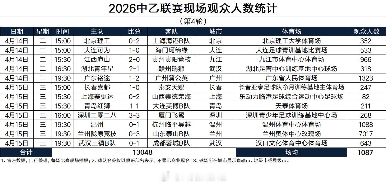 2026中乙联赛现场观众人数统计(第4轮)