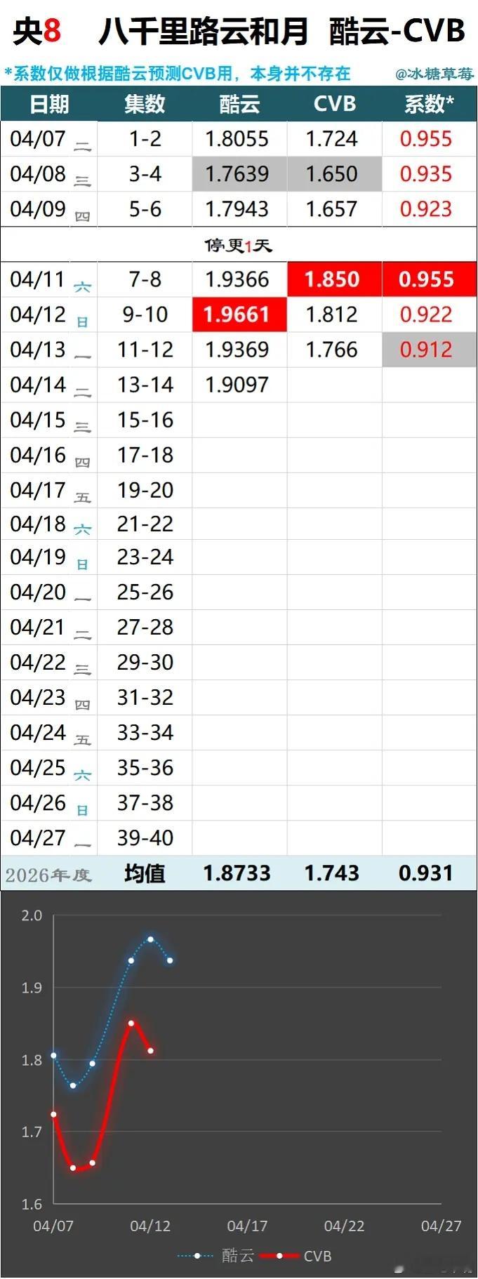 八千里路云和月 已播8天,基本上就这样了吧!cvb集均恐怕会低于《小城大事》!即使后面能涨也拉升不了多少!cvb集均1.80还是有难度的(接下来每天cvb1.838才行)