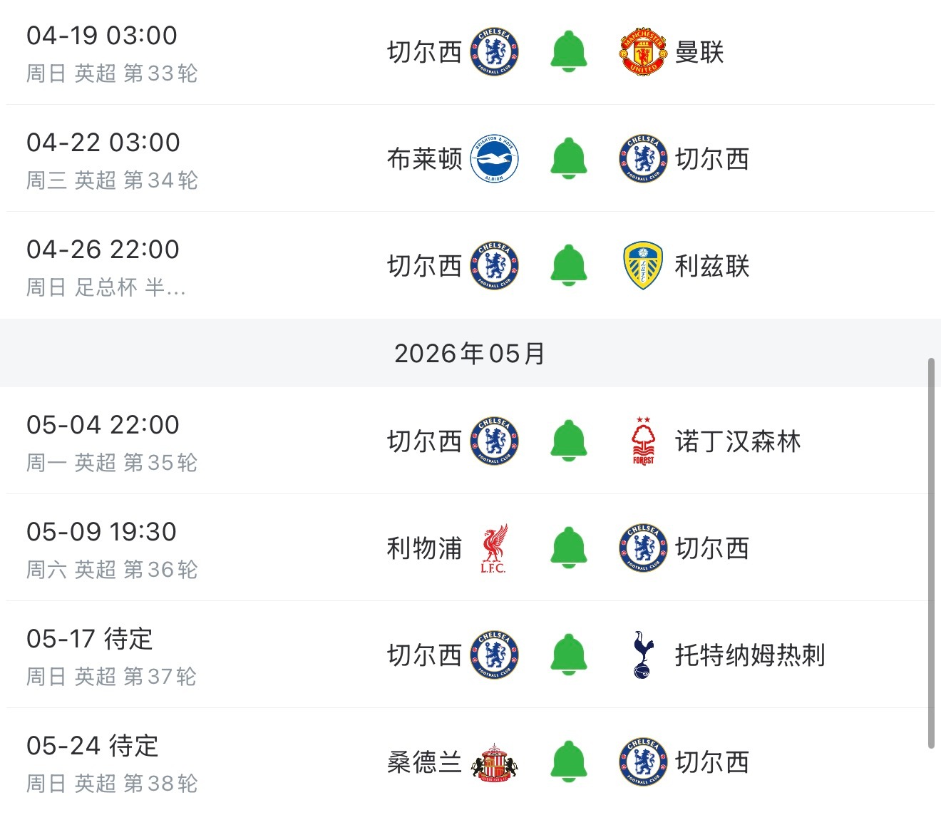 第五名 利物浦 52分第六名 切尔西 48分双方未来的赛程英超切尔西