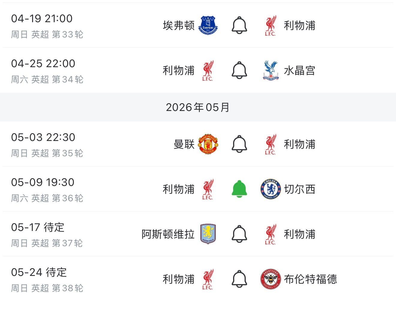 第五名 利物浦 52分第六名 切尔西 48分双方未来的赛程