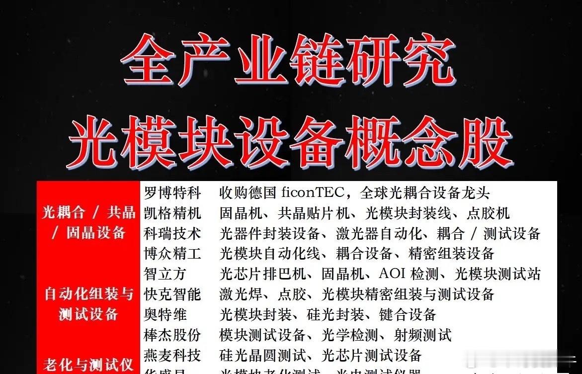 光模块设备核心股2026年潜力排名1. 科瑞技术(002957)- 2026E净利润:3.5~4.0亿元(光模块设备3~4亿,净利率20%)- 光模块业务占比:15%~20%- 2026E PE:28~32倍(AI设备+NV供应链溢价)- 弹性逻辑:绑定Lumentum/Finisar/NV,耦合+共晶+封装全流程,订单确定性最强2. 博众精工(688097)- 2026E净利润:8.3~8.6亿元(光模块设备5亿+,占比约10%)- 光模块业务占比:8%~12%- 2026E PE:30~33倍(自动化+新能源+光模块三重驱动) - 弹性逻辑:共晶贴片机+耦合机海内外龙头供货,NV服务器机柜设备爆发 3. 凯格精机(301338)- 2026E净利润:3.7~4.0亿元(光模块产线+CPO设备放量)- 光模块业务占比:30%~40%- 2026E PE:33~38倍(AI产线设备高景气)- 弹性逻辑:CPO共晶+耦合+点锡机全布局,海外产线自动化0→1爆发4. 奥特维(688516)- 2026E净利润:6.0~6.5亿元(光模块AOI+半导体设备高增)- 光模块业务占比:10%~15%- 2026E PE:34~38倍(光伏+锂电+半导体三足鼎立)- 弹性逻辑:光模块AOI唯一量产出海,获美国头部客户复购5. 普源精电(688337)- 2026E净利润:1.4~1.5亿元(光模块测试+高端示波器)- 光模块业务占比:25%~35%- 2026E PE:50~55倍(测试仪器+国产替代溢价)- 弹性逻辑:800G/1.6T/3.2T迭代,测试价值量翻倍6. 快克智能(603203)- 2026E净利润:3.1~3.2亿元(AOI+固晶+热压键合)- 光模块业务占比:15%~20%- 2026E PE:25~28倍(精密焊接+半导体封装双轮)- 弹性逻辑:光模块设备上半年订单落地,HBM热压键合同步放量7. 奥普特(688686)- 2026E净利润:2.5~2.8亿元(视觉部件+光模块设备配套) - 光模块业务占比:15%~20%- 2026E PE:40~45倍(机器视觉龙头+AI设备配套) - 弹性逻辑:AOI/耦合/固晶机核心视觉供应商,渗透率持续提升8. 埃科光电(688610)- 2026E净利润:1.0~1.2亿元(工业相机+光模块设备配套)- 光模块业务占比:10%~15%- 2026E PE:48~52倍(高端工业视觉+小市值弹性)- 弹性逻辑:线扫相机配套光模块设备,客户覆盖科瑞/博众/奥特维