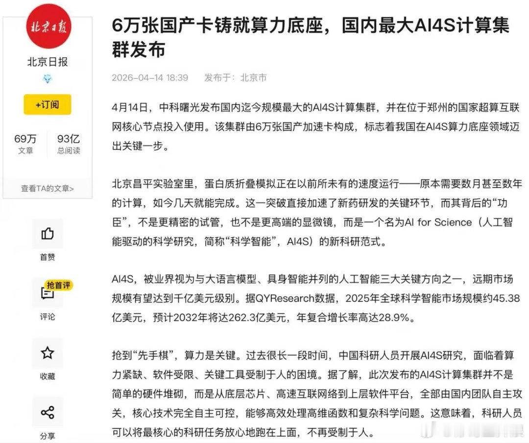 对于整天泡在实验室里的科研人员来说,昨天郑州这个6万卡AI4S集群的投用,可能比任何一场学术会议都来得实在。
