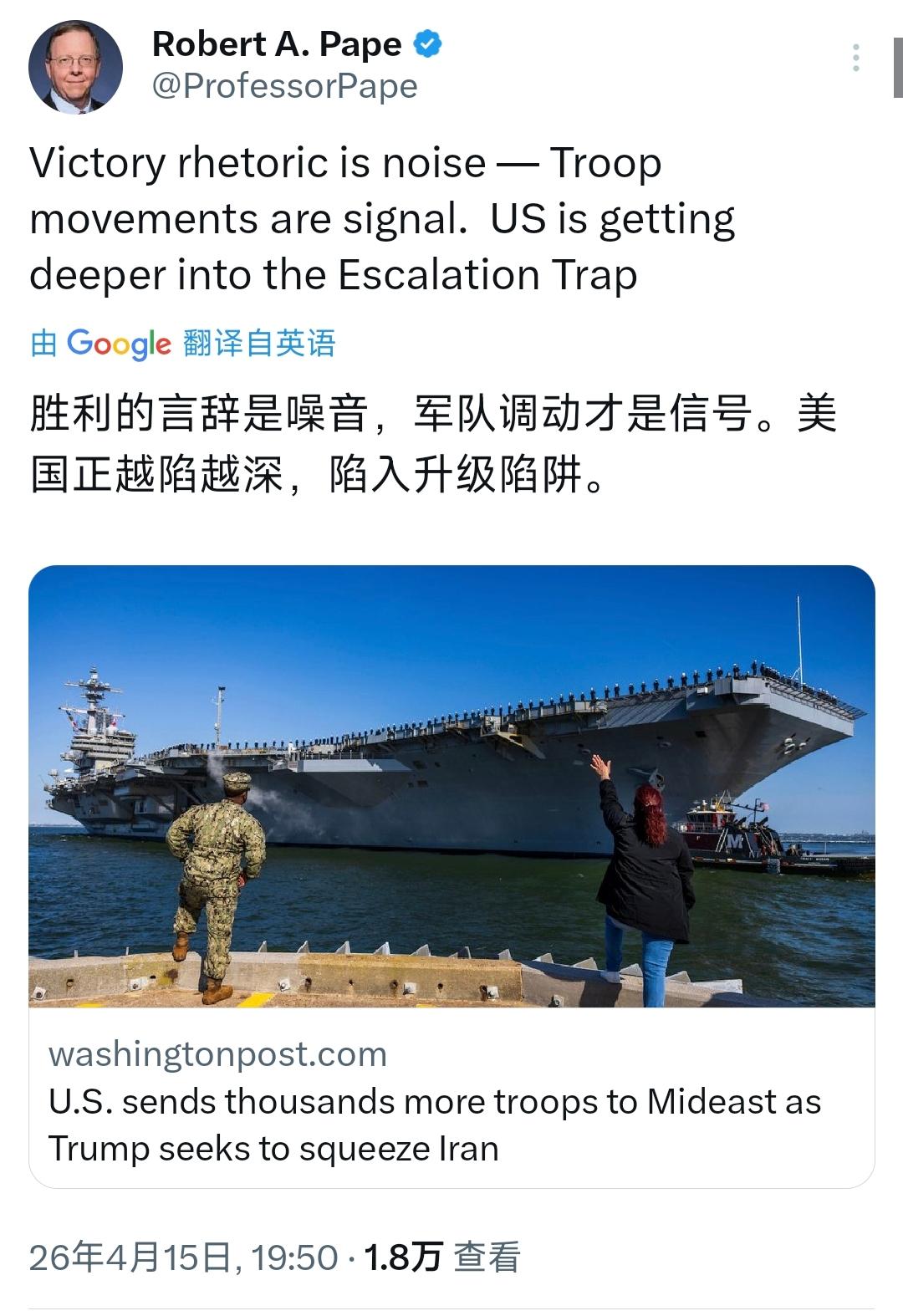芝加哥大学国际政治教授罗伯特·佩普今晚(北京时间4月15日晚)写道:“胜利的言辞是噪音,军队调动才是信号。美国正越陷越深,陷入升级陷阱。” 【罗伯特·佩普转发了华盛顿邮报的报道:“特朗普试图对伊朗施压,美国向中东增派数千名士兵”。】 [机智]评两句:美国越陷越深,特朗普是否会发动地面战争呢?增兵数千、三航母齐聚中东的调兵遣将,究竟是虚张声势以增加谈判筹码,还是以谈判为幌子企图发起地面军事行动?最快两周,布什号航母将抵达中东,届时可能会更清晰一些。