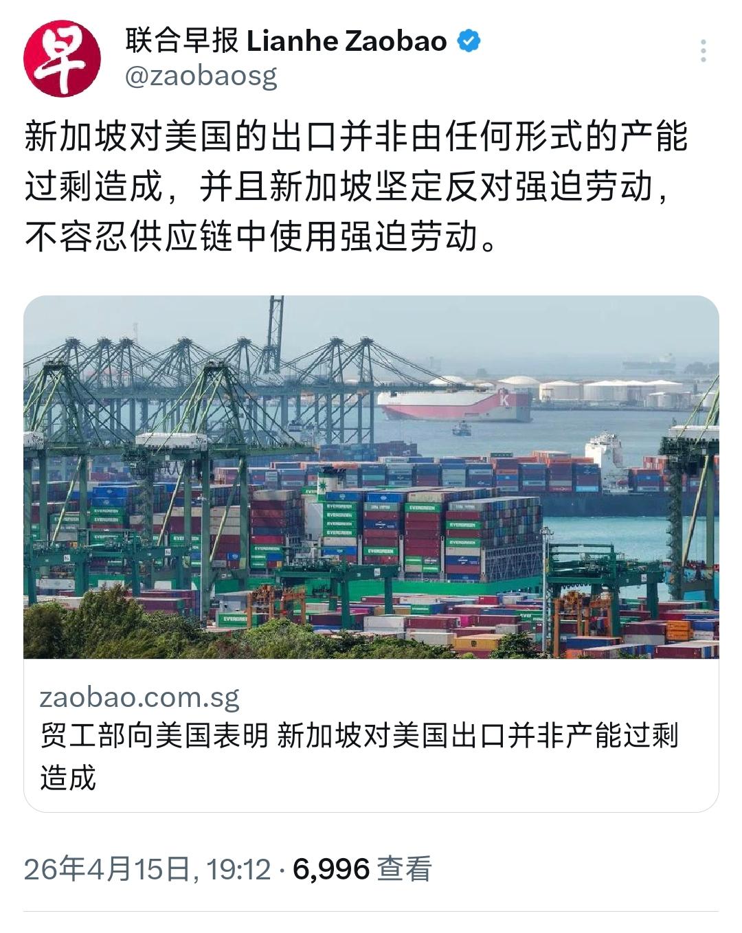 新加坡联合早报今晚(4月15日晚)报道:“新加坡贸工部向美国表明,新加坡对美国的出口并非由任何形式的产能过剩造成,并且新加坡坚定反对强迫劳动,不容忍供应链中使用强迫劳动。” [机智]评几句:新加坡不断讨好特朗普,但是也没有躲过。上个月,美国的301调查大棒也挥向了新加坡,美国还指责新加坡存在“结构性产能过剩与生产过剩”。美式霸权的双标嘴脸再次暴露无遗,一边将贸易调查当作地缘博弈工具,对盟友伙伴也动辄挥舞制裁大棒,一边无视自身产业保护主义行径,肆意给别国扣上莫须有的帽子。所谓“产能过剩”不过是美国打压他国产业的借口,而拿“强迫劳动”说事,更是无底线的政治操弄。连长期紧跟美国的新加坡都难逃敲打,足见美国眼中只有利益没有盟友伙伴。