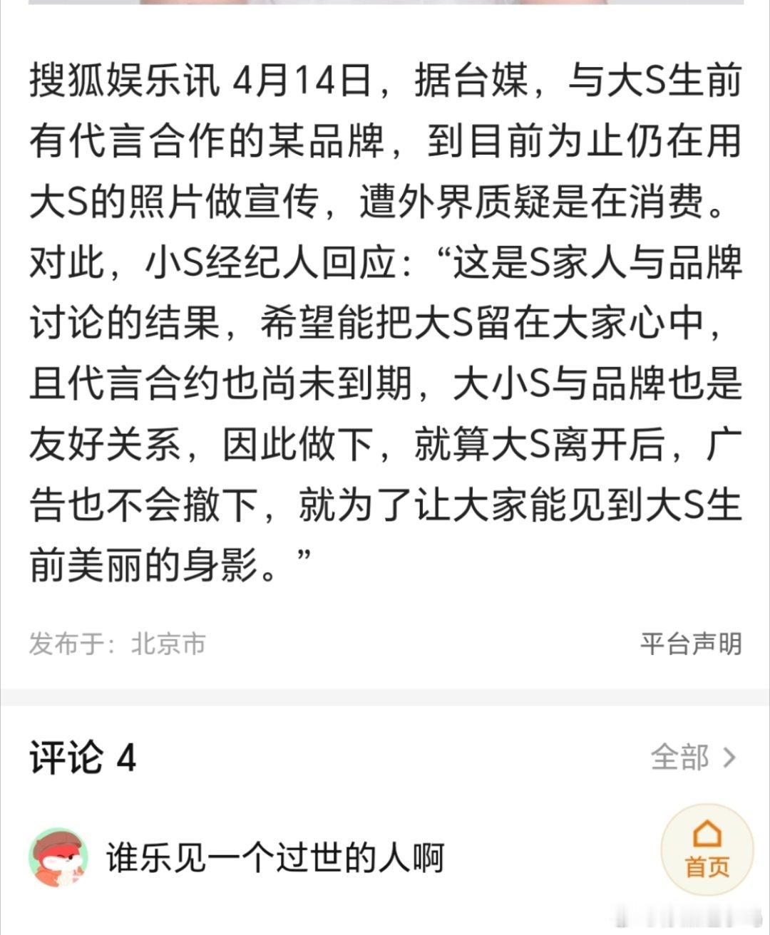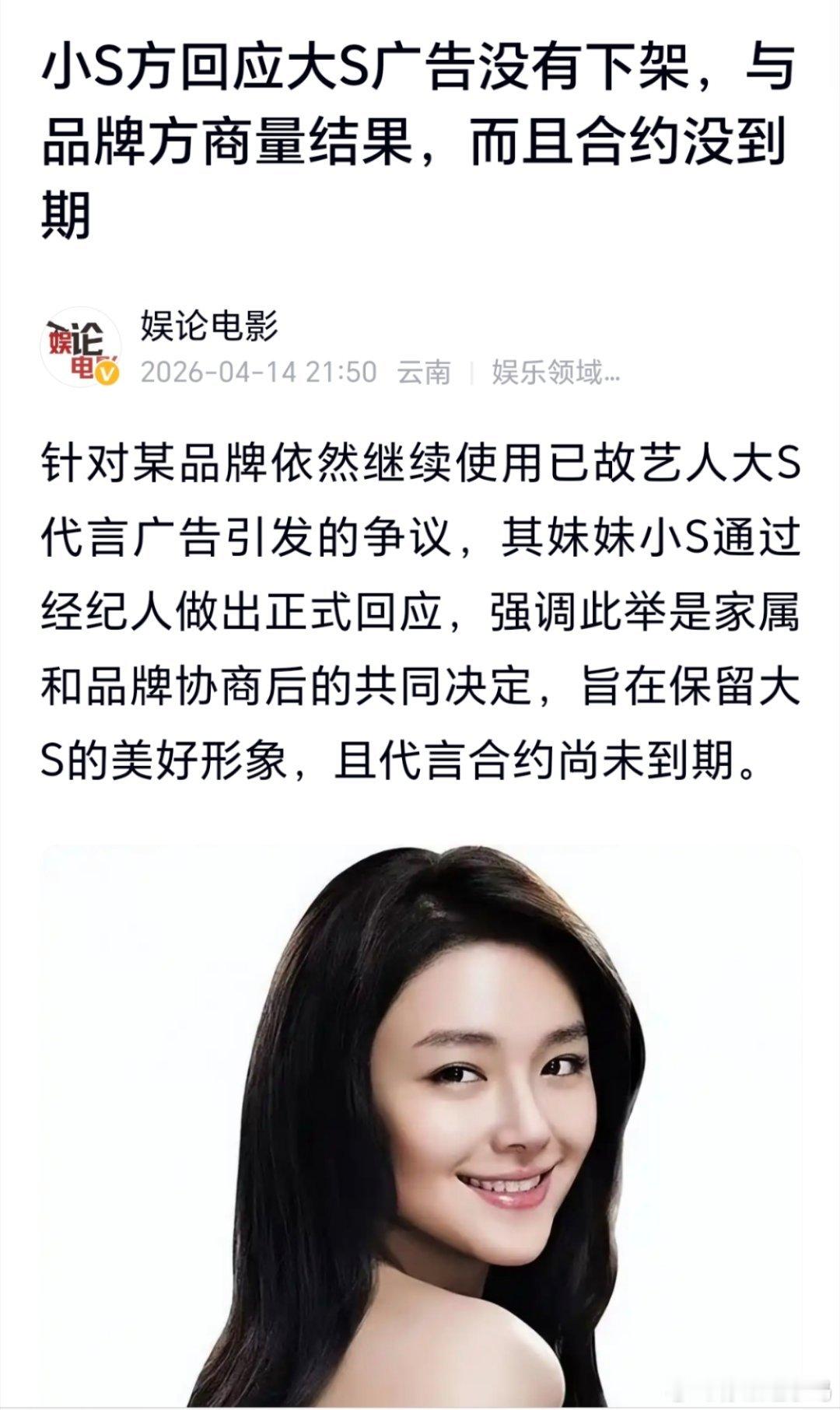 大S逝世一周年,她代言的广告没有被撤下,有人说这是在消费逝者,小S出来回应:“由于合约未到期,是家属与品牌方达成的合作,合约到期再撤下,在这期间也给大s粉丝们留下怀念的空间,用广告作为纪念的特殊方式,希望把大S美丽的形象留在公众心中。”