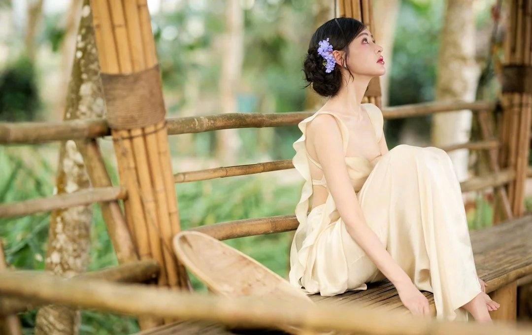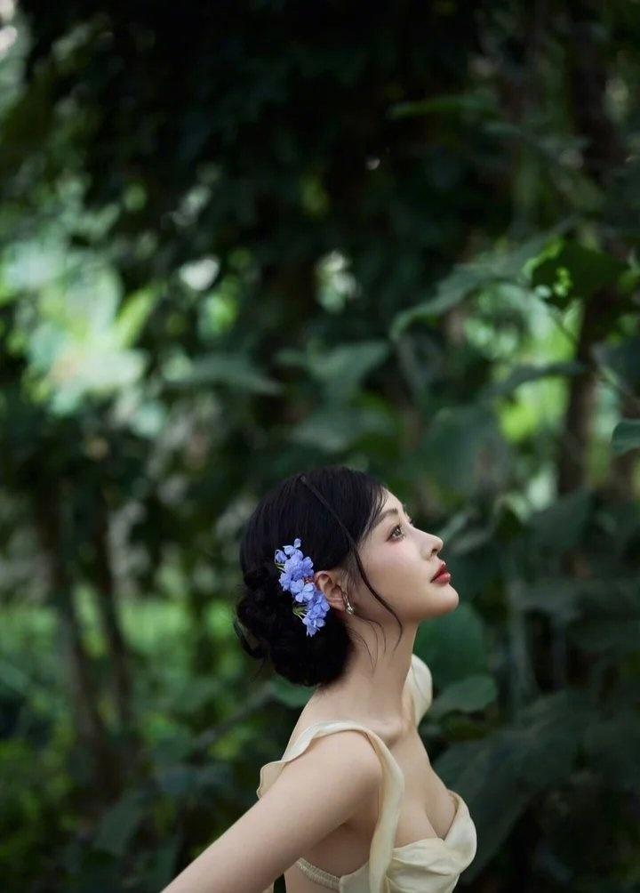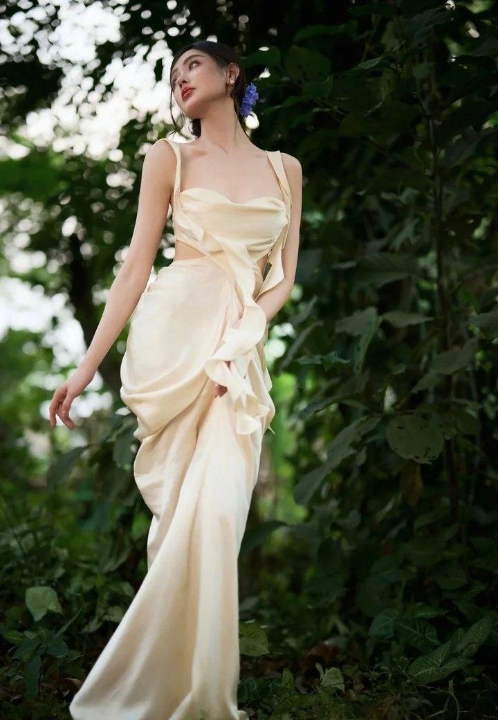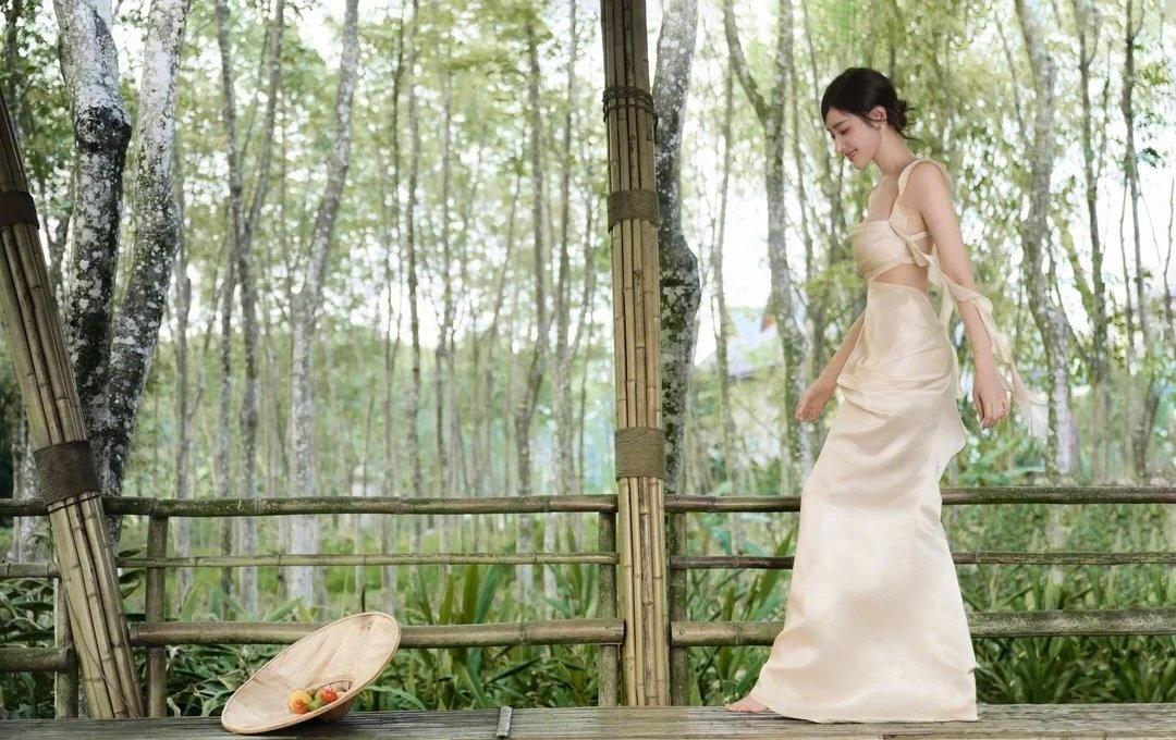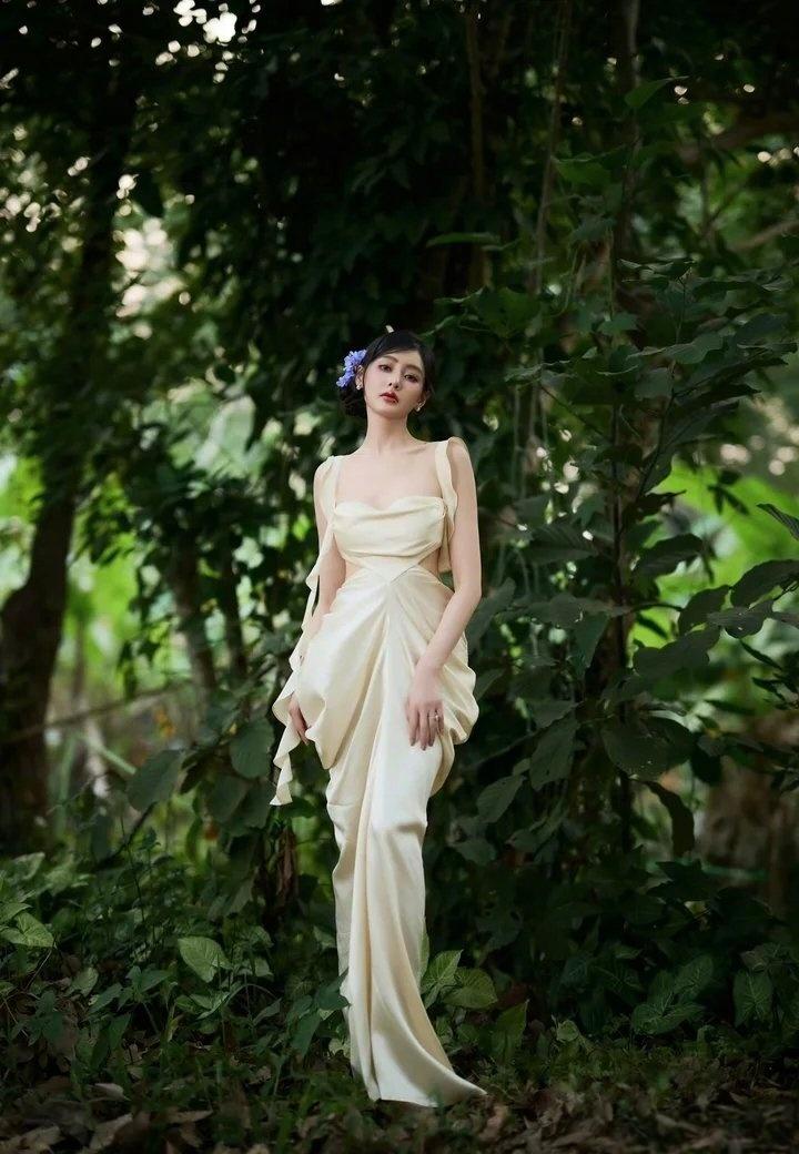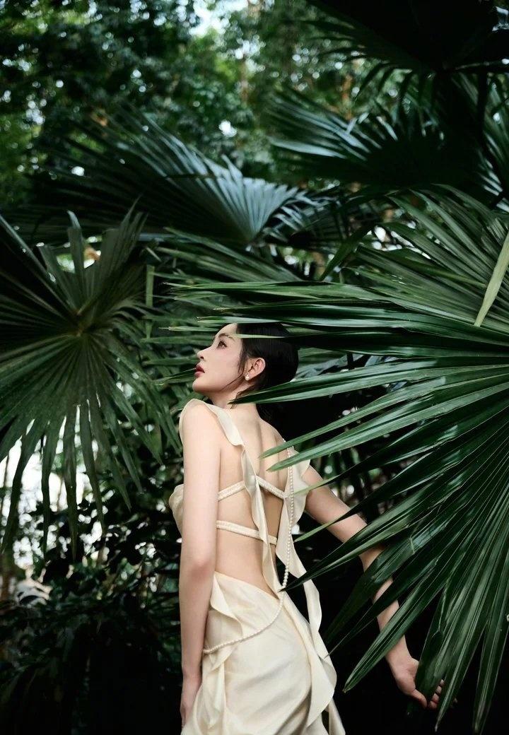 张天爱这组森系造型,把“松弛感”焊在身上了 张天爱这组林间大片真的美到失语。一身奶杏色缎面长裙,把温柔与性感平衡得恰到好处。露背设计勾勒出流畅的背部线条,荷叶边飘带又添了几分灵动,腰腹的小心机剪裁更是把好身材藏得恰到好处。 盘发点缀蓝花,搭配清透的晒伤妆,整个人像从森林里走出来的精灵,慵懒又贵气。缎面的光泽感在光影里流转,把东方女性的柔美与力量感完美融合,不刻意、不张扬,却每一处都透着高级。这种松弛又精致的穿搭,才是真正的氛围感天花板。