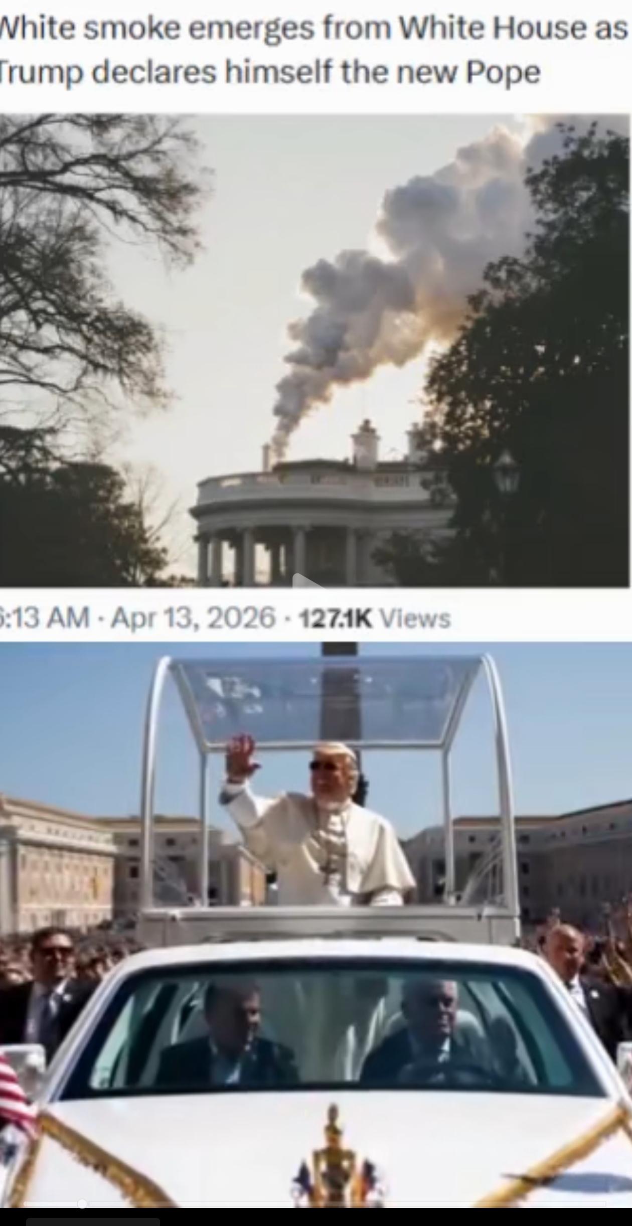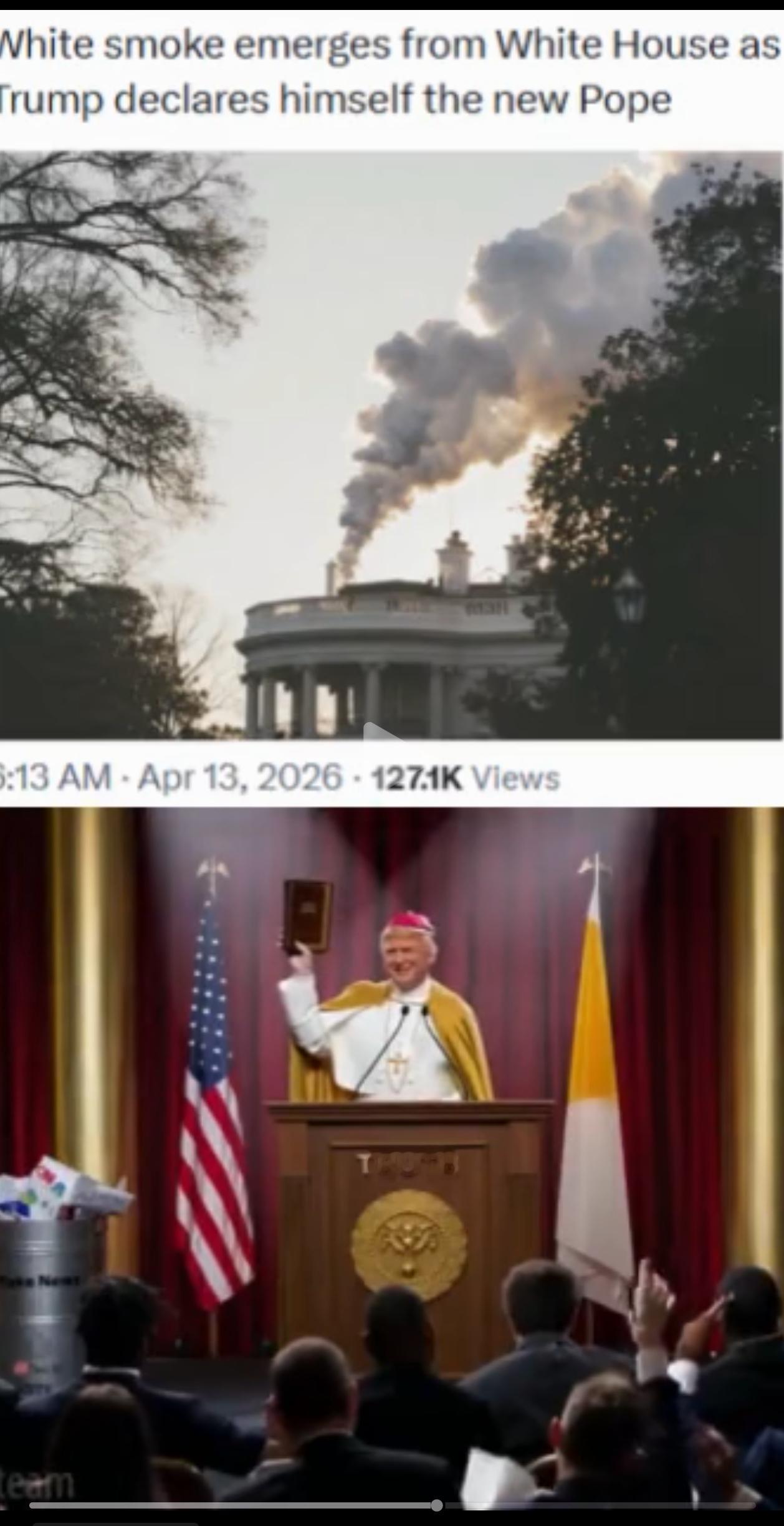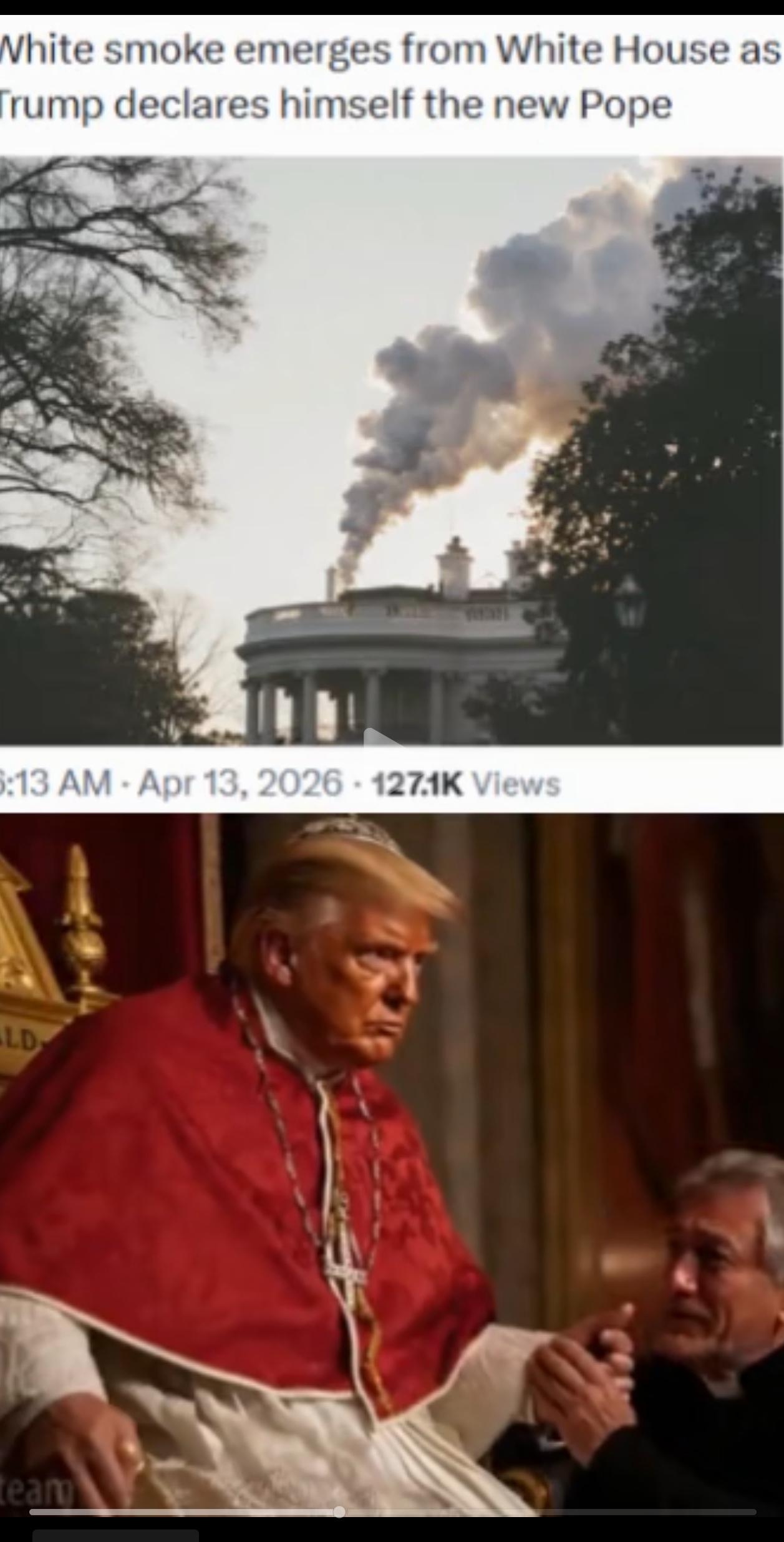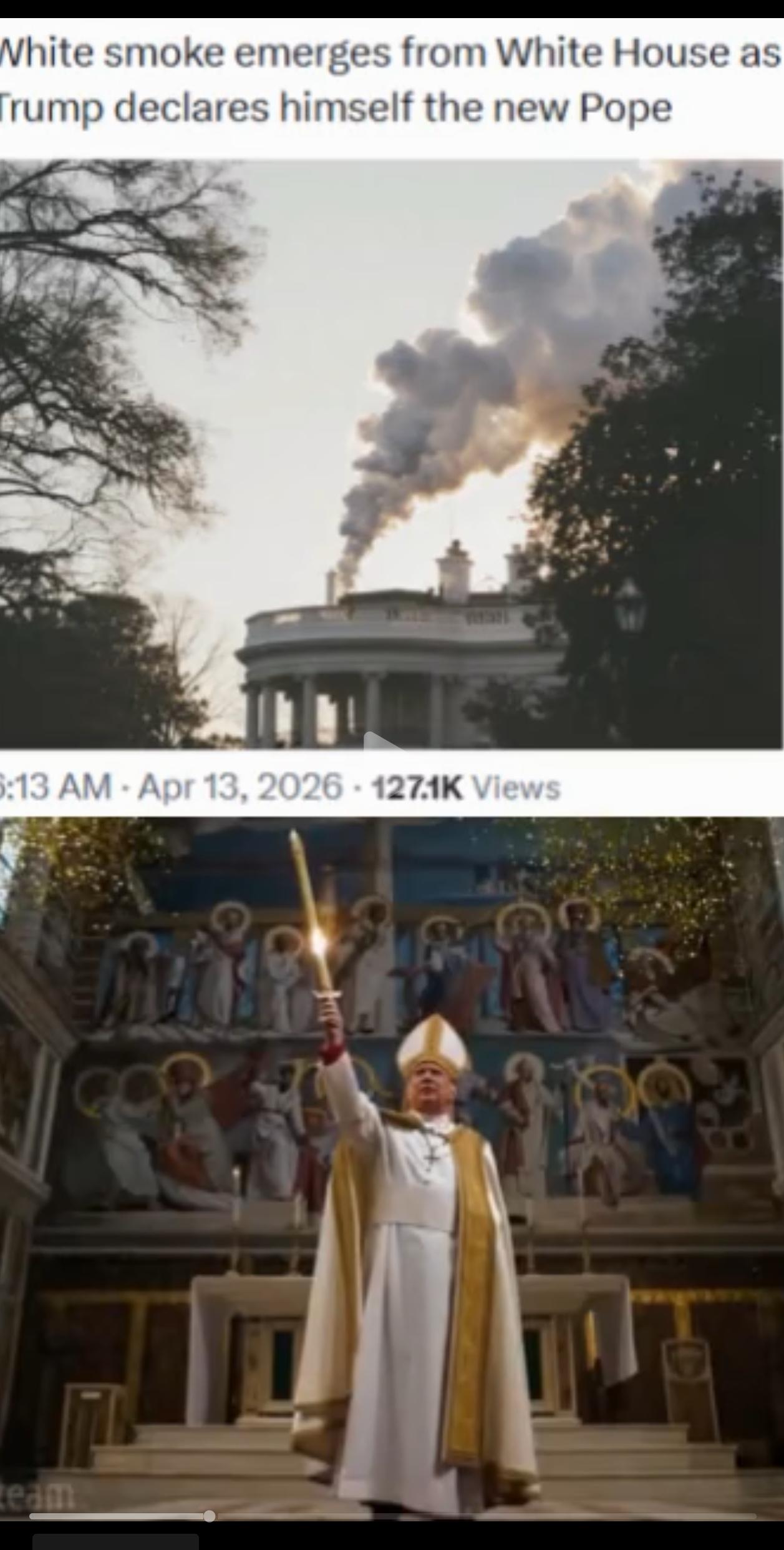 特朗普今晚(4月15日)写道:“中国对我永久开放霍尔木兹海峡感到非常高兴。我这样做,是为了中国,也是为了全世界。这种封锁、动荡局面再也不会发生了。他们已经同意不再向伊朗运送武器。几周后我到访中国时,中方给我一个大大的热情的拥抱。我们合作得很巧妙、非常好!这难道不比打仗强吗???但要记住:真要打起来,我们也非常擅于打仗,比任何人强得多!!!” 在特朗普发此帖后,又随即发布一则他13日制作的、将自己AI成教皇的视频(截图2~13),意在向全世界宣告,特朗普活在梦游之中,天天自说自话,大家不要信以为真,如有雷同纯属巧合。特朗普并非天主教信徒,却几次把自己Al成教皇模样,也在告诉大家,他的话都是信口雌黄,一派胡言乱语!!!