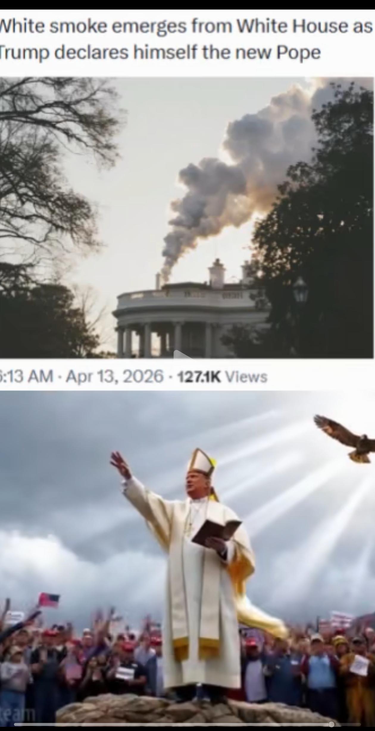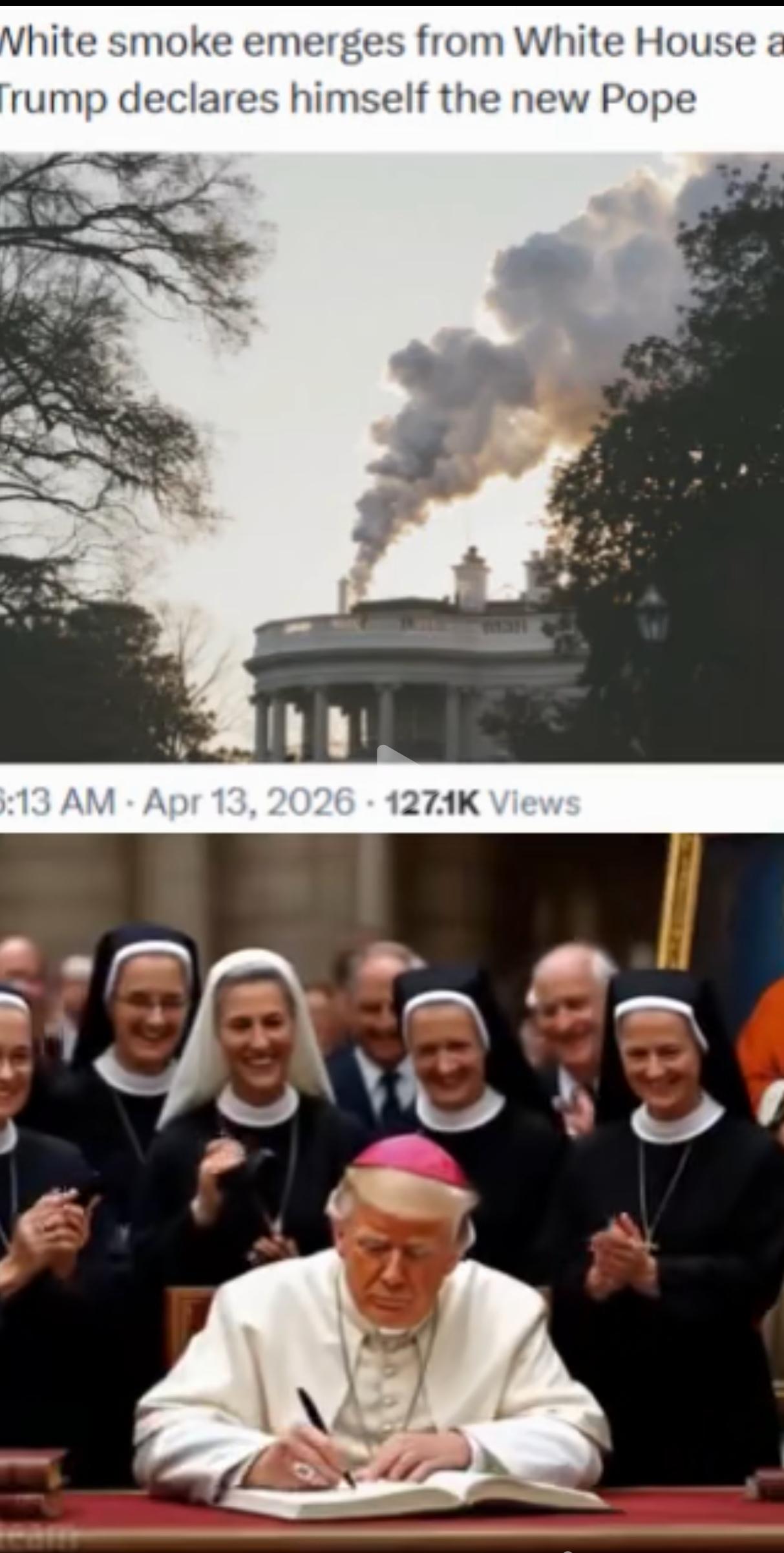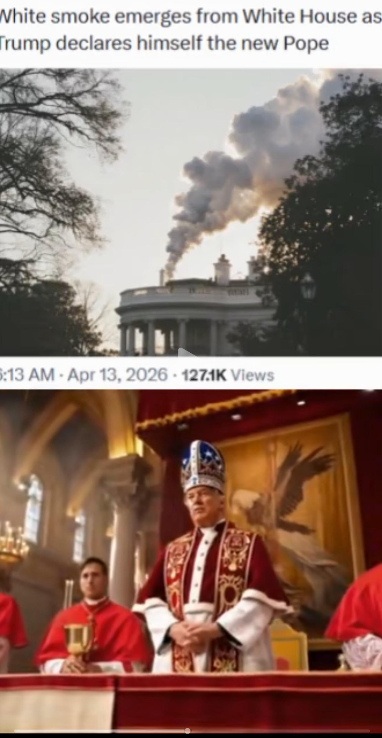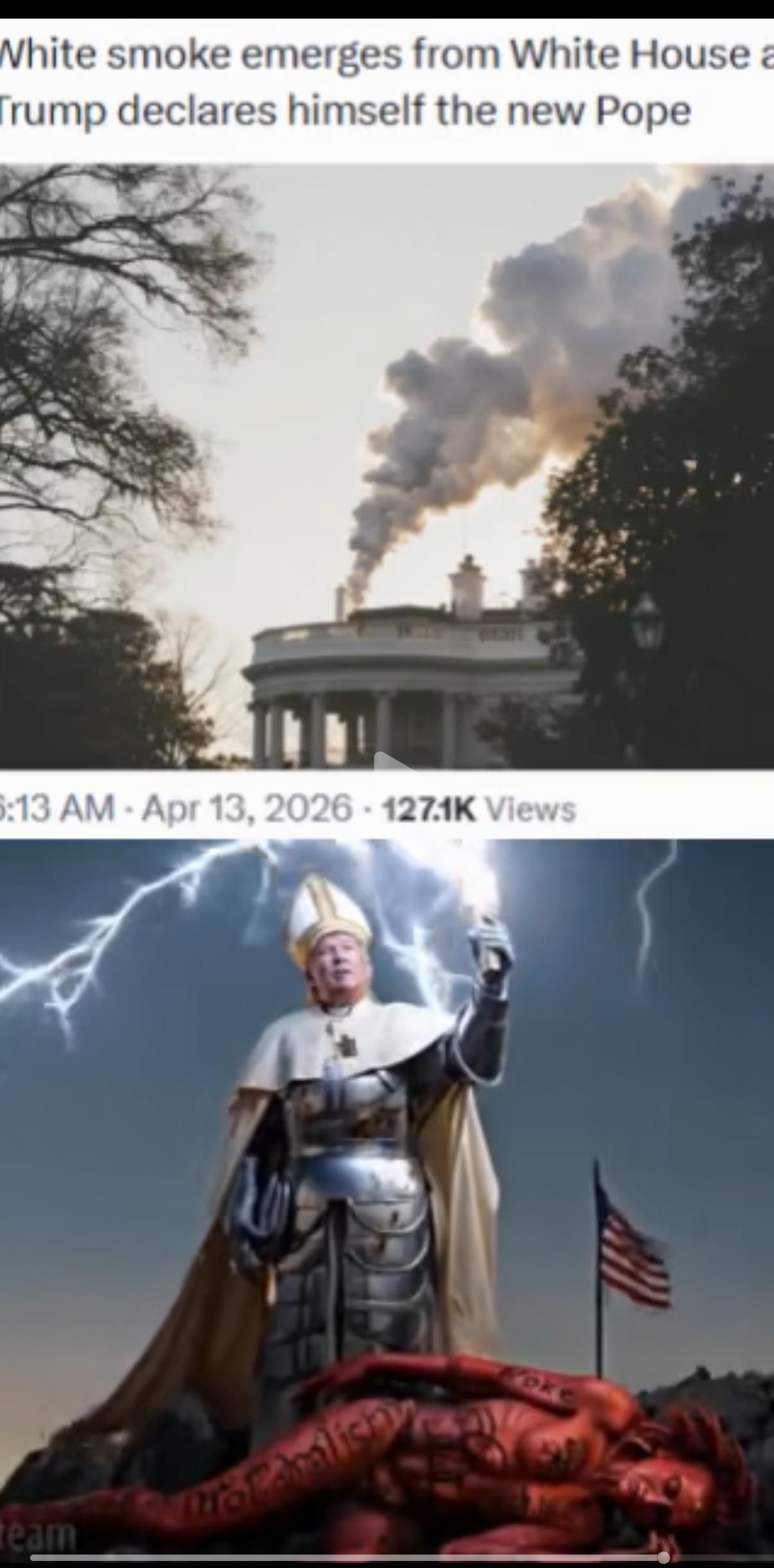 特朗普今晚(4月15日)写道:“中国对我永久开放霍尔木兹海峡感到非常高兴。我这样做,是为了中国,也是为了全世界。这种封锁、动荡局面再也不会发生了。他们已经同意不再向伊朗运送武器。几周后我到访中国时,中方给我一个大大的热情的拥抱。我们合作得很巧妙、非常好!这难道不比打仗强吗???但要记住:真要打起来,我们也非常擅于打仗,比任何人强得多!!!” 在特朗普发此帖后,又随即发布一则他13日制作的、将自己AI成教皇的视频(截图2~13),意在向全世界宣告,特朗普活在梦游之中,天天自说自话,大家不要信以为真,如有雷同纯属巧合。特朗普并非天主教信徒,却几次把自己Al成教皇模样,也在告诉大家,他的话都是信口雌黄,一派胡言乱语!!!