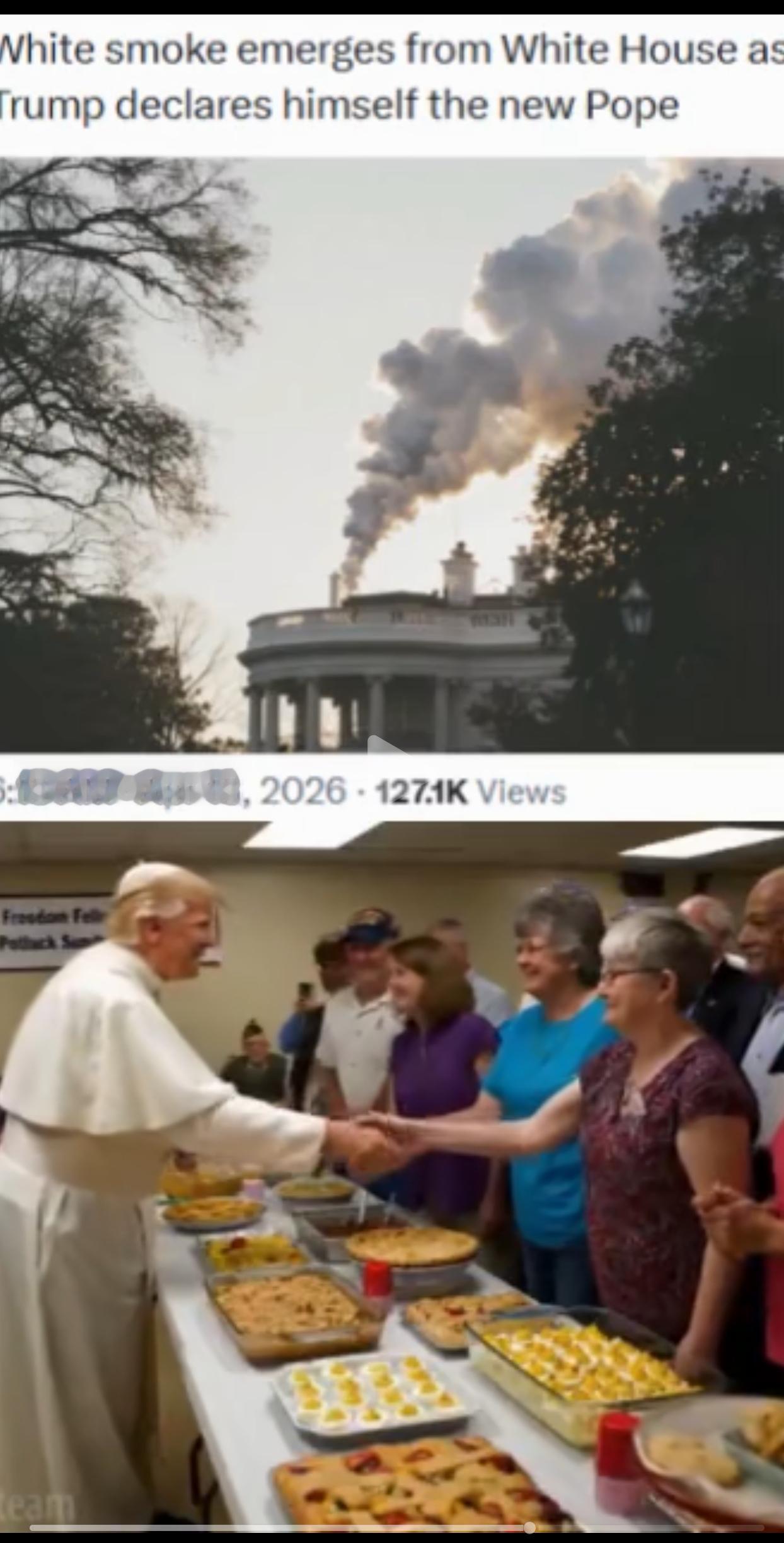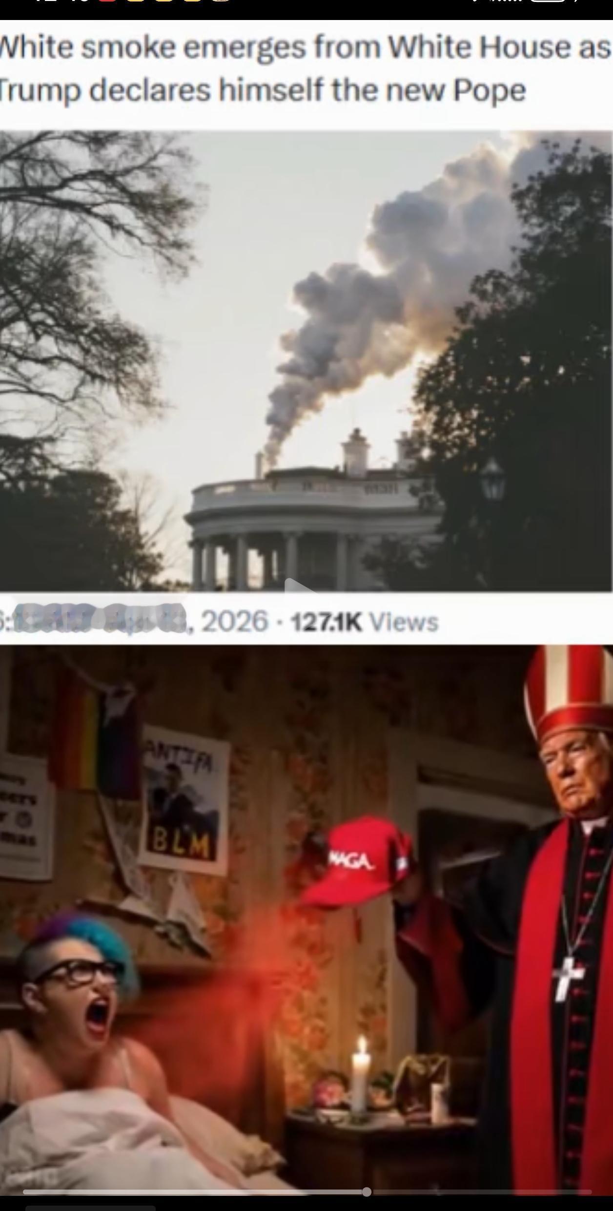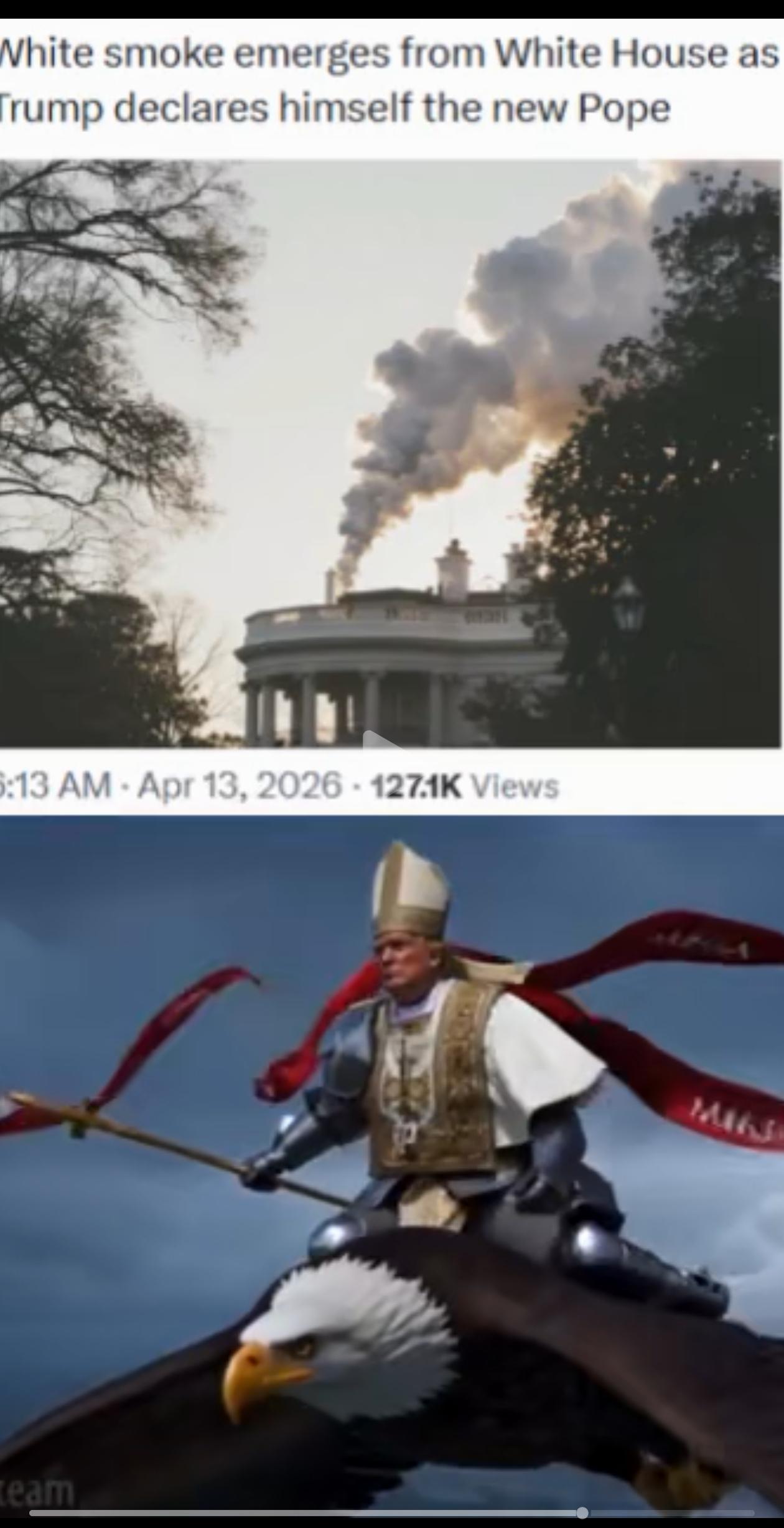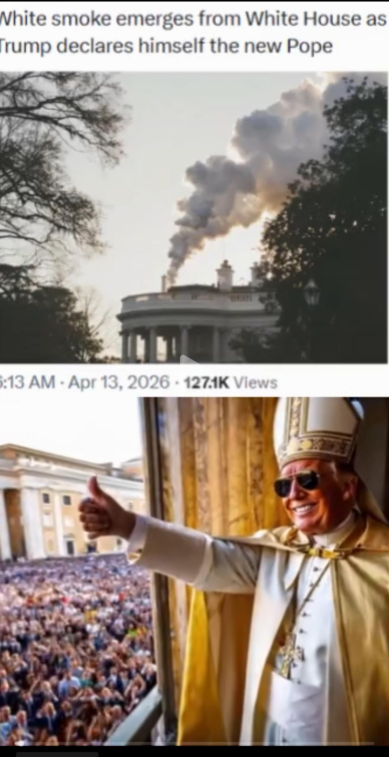 特朗普今晚(4月15日)写道:“中国对我永久开放霍尔木兹海峡感到非常高兴。我这样做,是为了中国,也是为了全世界。这种封锁、动荡局面再也不会发生了。他们已经同意不再向伊朗运送武器。几周后我到访中国时,中方给我一个大大的热情的拥抱。我们合作得很巧妙、非常好!这难道不比打仗强吗???但要记住:真要打起来,我们也非常擅于打仗,比任何人强得多!!!” 在特朗普发此帖后,又随即发布一则他13日制作的、将自己AI成教皇的视频(截图2~13),意在向全世界宣告,特朗普活在梦游之中,天天自说自话,大家不要信以为真,如有雷同纯属巧合。特朗普并非天主教信徒,却几次把自己Al成教皇模样,也在告诉大家,他的话都是信口雌黄,一派胡言乱语!!!