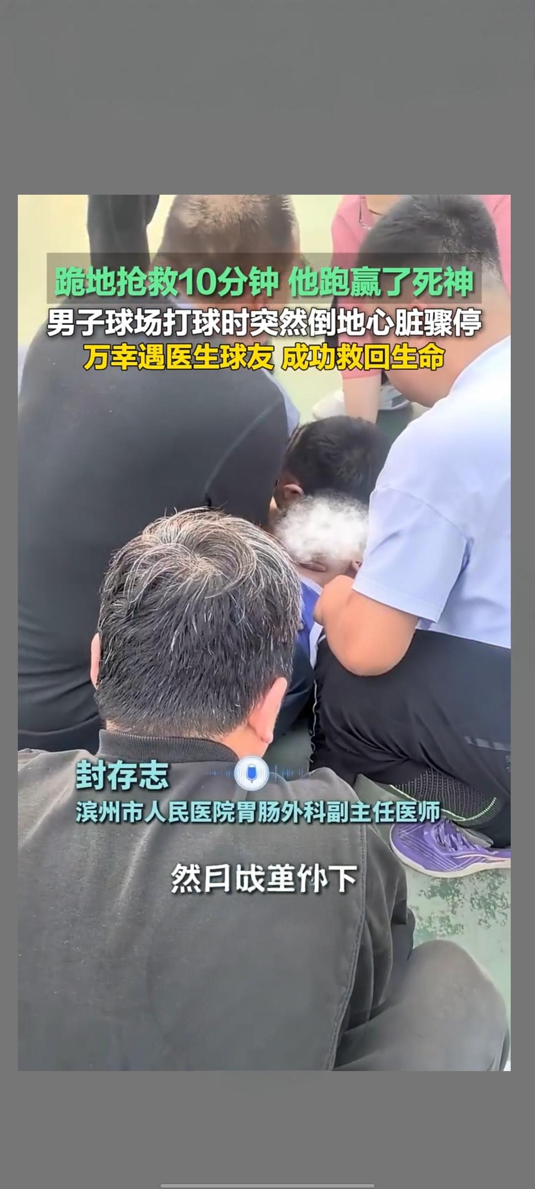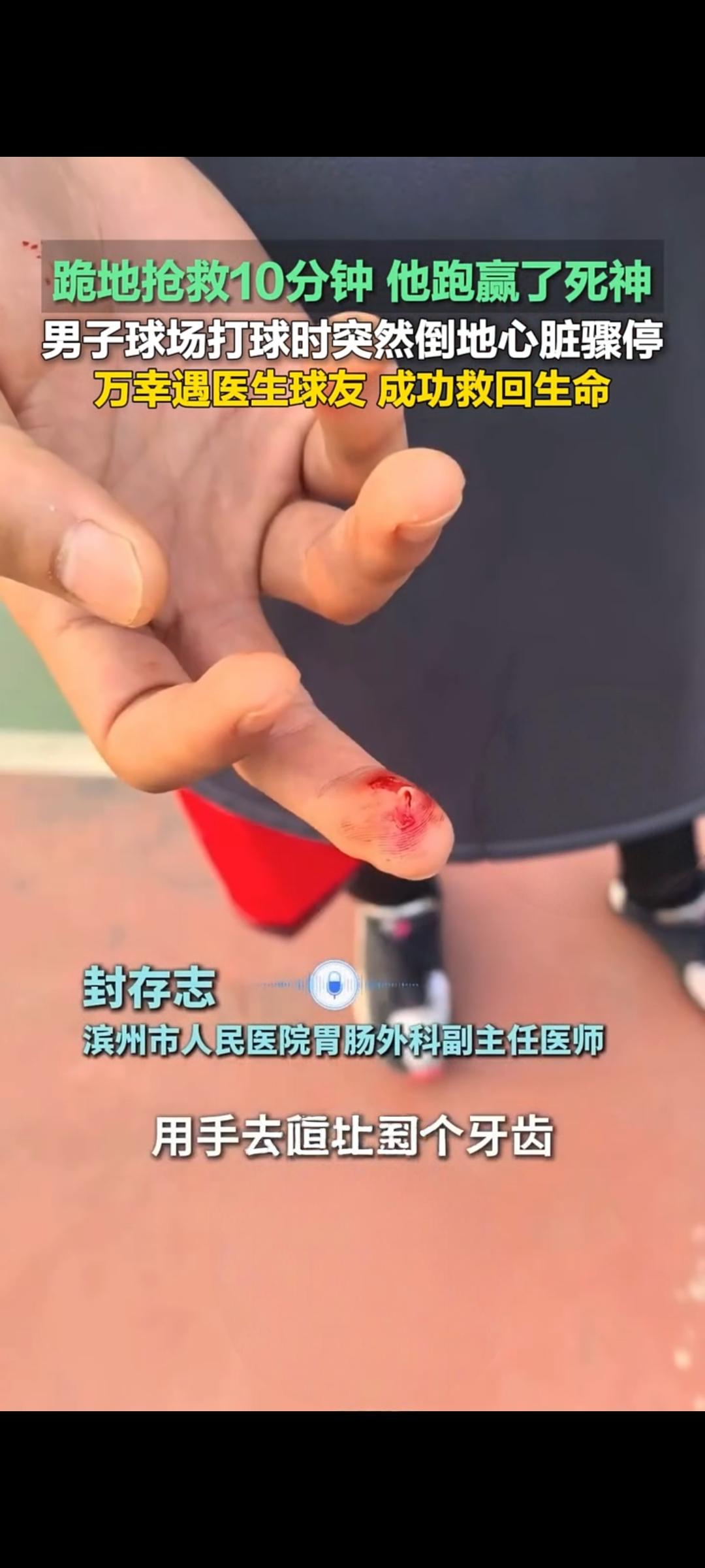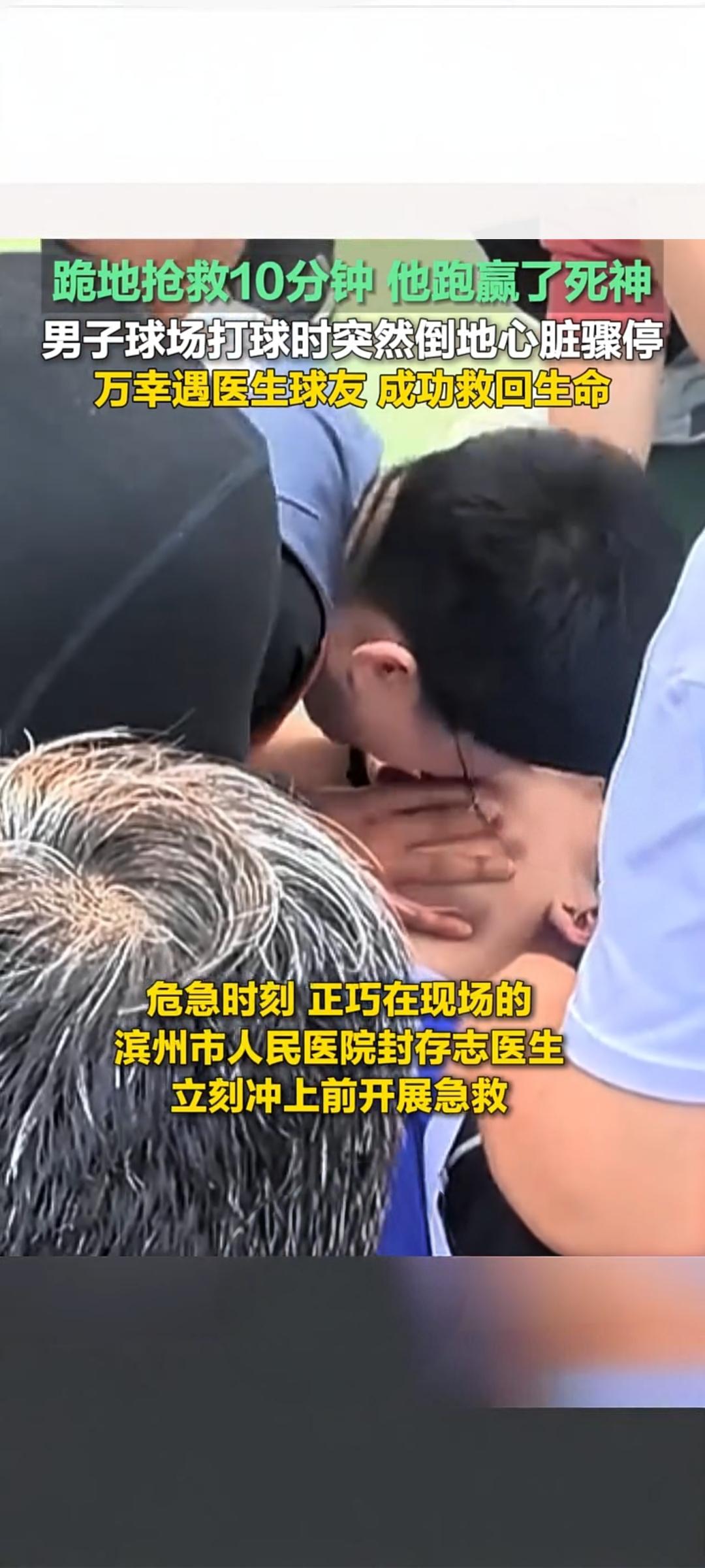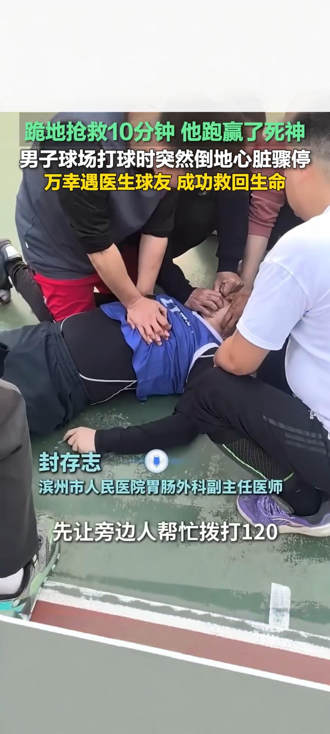 山东滨州:球场突发心脏骤停 医生球友跪地十分钟跑赢死神 4月15日,一段发生在山东滨州的急救视频在快手传播,播放量超1.1万次,记录了一场与死神赛跑的生命救援。 事发于当地一处球场,一名男子打球时突然倒地,出现心脏骤停、意识丧失,情况万分危急。心脏骤停黄金抢救时间仅数分钟,每一秒都关乎生死。就在众人慌乱之际,同为球友的医生封存志挺身而出,迅速判断病情,立即跪地开展急救 。 他一边指导旁人拨打120,一边持续进行胸外按压与人工呼吸。施救中男子牙关紧闭,他徒手掰开气道,手指被咬伤也浑然不觉,全程坚持近十分钟,不曾停歇 。高强度按压让他大汗淋漓、手臂酸痛,却始终保持规范动作,牢牢守住生命防线。 直至120急救人员抵达,封医生才放心交接。凭借及时专业的急救,男子成功脱离危险,转危为安 。 这场十分钟的跪地抢救,是医者仁心的生动写照。意外面前,专业与担当为生命赢得宝贵时间,也让更多人看到急救知识的重要性。 心脏猝死急救 外源性心脏骤停 医生封存志跪地施救 男子成功脱险