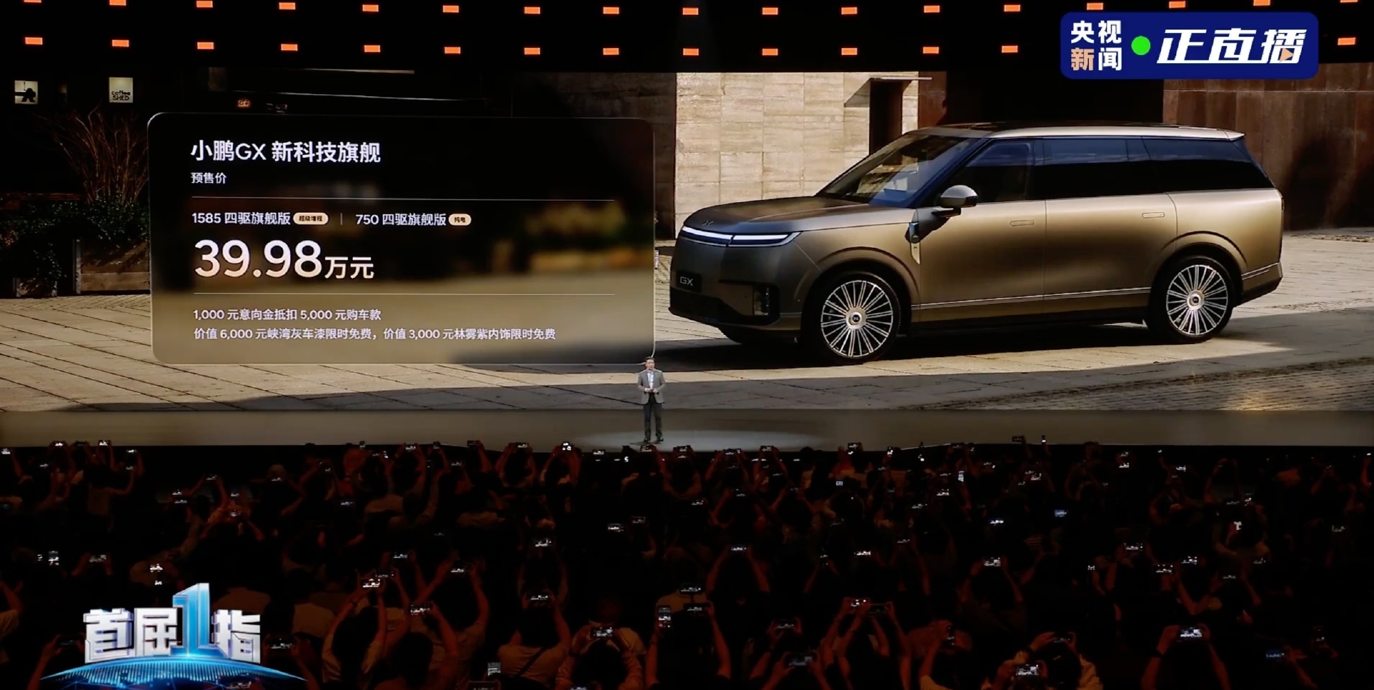 新科技旗舰小鹏GX今晚预售央视称小鹏GX为科技大成之作小鹏GX,科技豪华,格局自成。游艇式流线造型,5265mm车长配合3115mm同级领先轴距,勾勒全尺寸磅礴体量。750余轮次优化与50小时风洞打磨,风阻系数低至0.25Cd,续航提升30公里。隐藏式水切侧窗、22英寸宽胎鸳鸯设计,细节处演绎豪华高级;寰宇天地前后贯穿灯、AI光影科技赋予专属交互表达;百万像素级AI数字投影大灯、行业首创跟车距离预警,带来独属科技旗舰尊贵感。全系提供五款外观色,采用巴斯夫顶级哑光清漆,辅以太空陶瓷24K金标,尽显豪华质感。