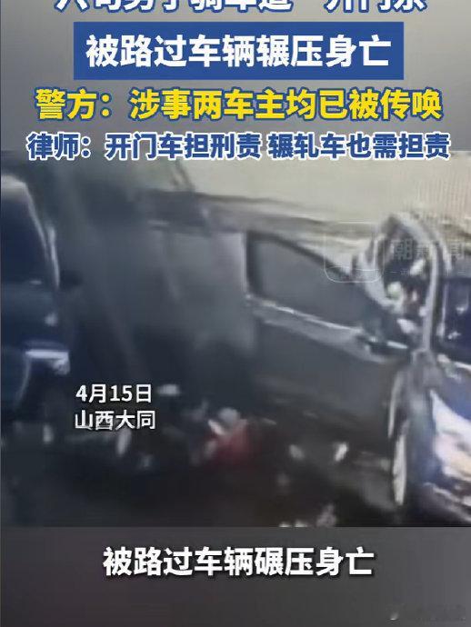 🚗 骑车遭开门杀致1人被碾压身亡 山西大同这起开门杀事故,一死一伤。路边停车突然开门,骑车人避让不及摔倒,又被后方车辆碾压,两个司机都已被传唤。