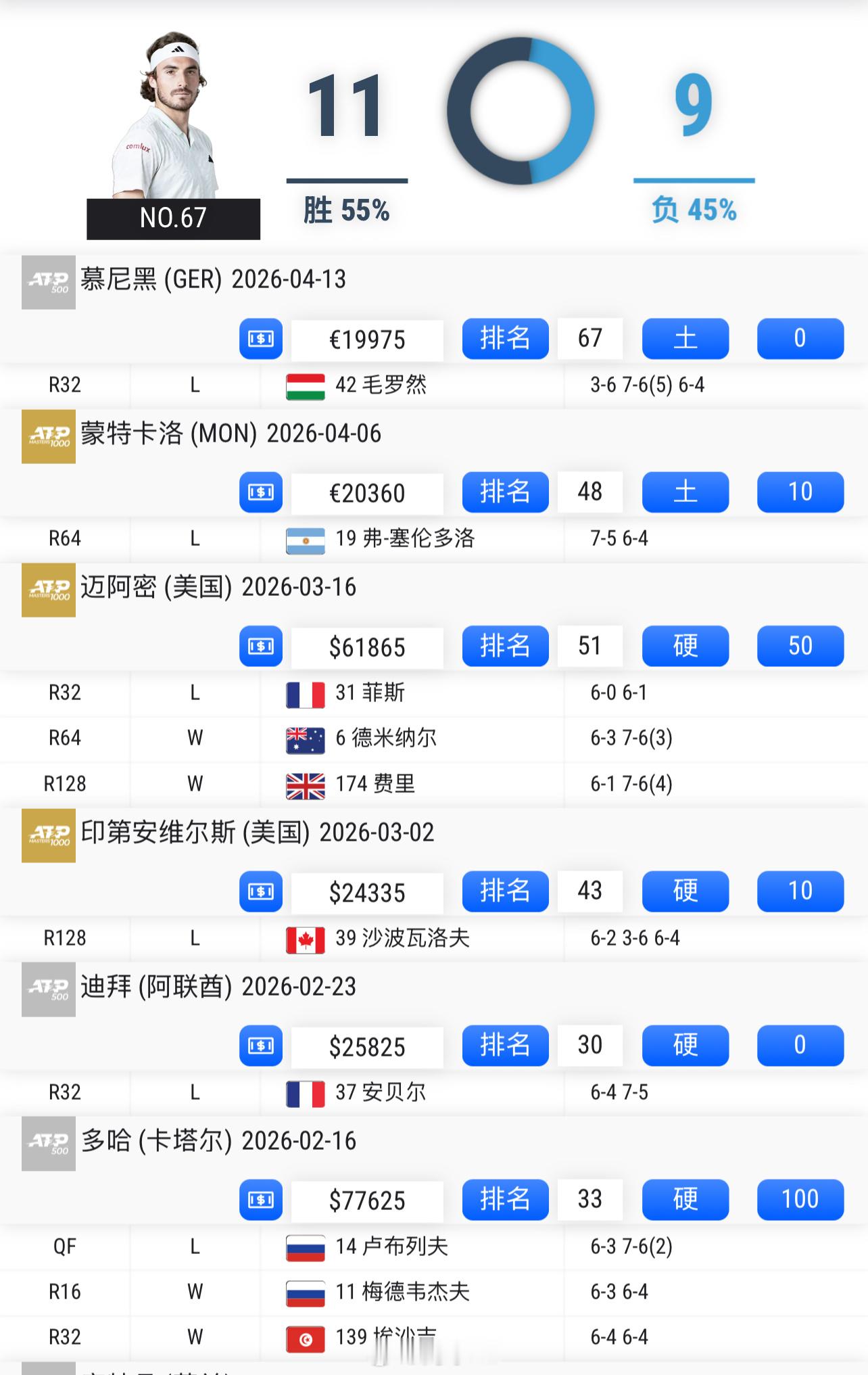西西帕斯慕尼黑一轮游,即时排名跌到了No.79