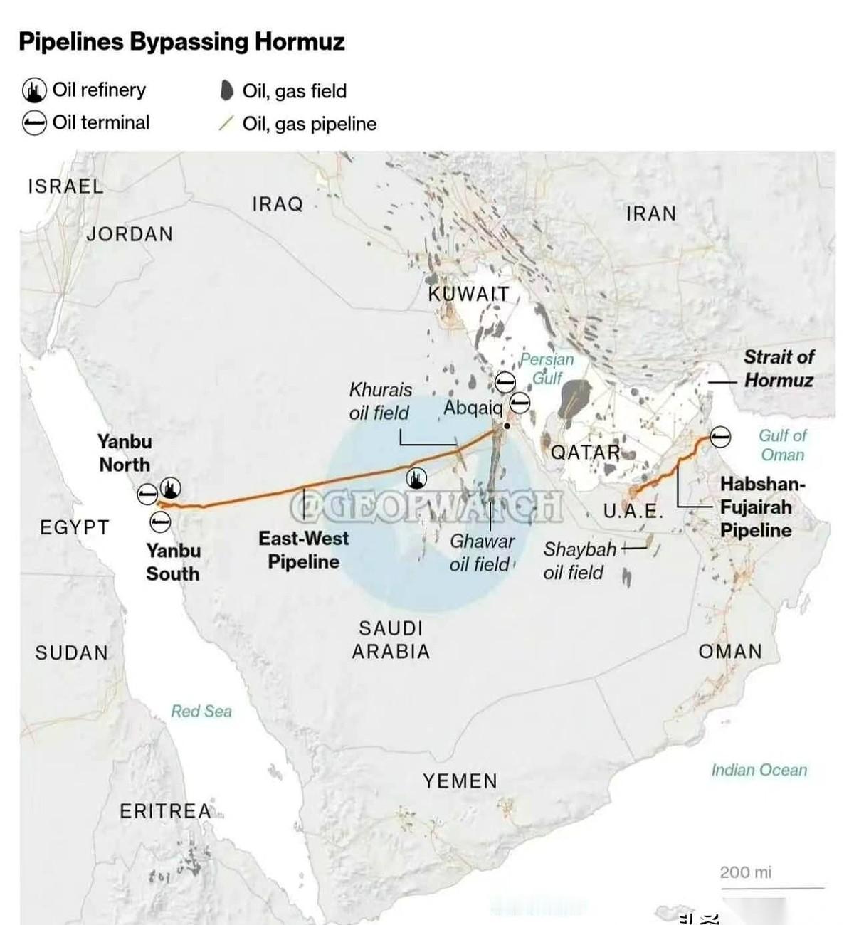 都以为霍尔木兹海峡是命门,结果沙特一声不吭,直接在背后开了个天窗。 一条横贯东西的超级管道,修好了。每天700万桶原油,哗哗地绕过海峡,直接从西海岸的延布港装船,走红海。 这意味着什么?意味着一旦海峡有事,所有邻居的油轮都趴在港里动弹不得,只有沙特的船还能扬帆出海。别人断气,他恰好能开席。 但别急着喊高明。 这条几千公里长的管子,就像一根暴露在外的血管,明晃晃地摆在沙漠上。伊朗那边几架小无人机飞过来,就能让它瞬间瘫痪。 这还不算完。 油轮出了红海,还得过曼德海峡。那边,胡塞武装正盯着呢。只要把那道窄门一堵,沙特这条新路,立马就断了。 所以,这到底是沙特棋高一着,还是给自己画了个更大的靶子?