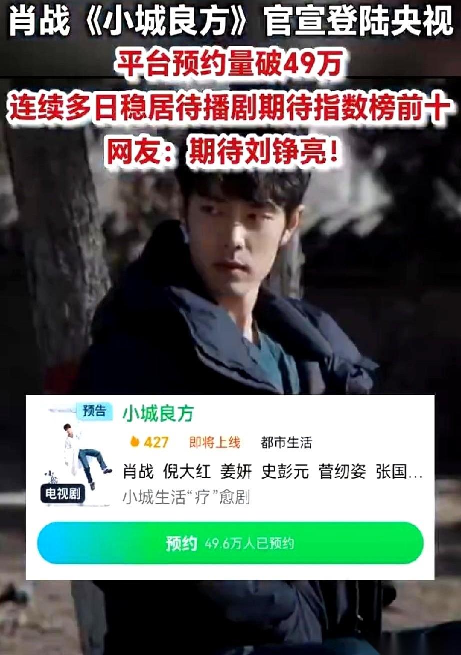 肖战这回不搞玄幻,不去谍战,直接被央视“摁”回了小县城当医生。 新剧《小城良方》,官宣空降央视。 讲的是一个天才医生从云端跌落,回到老家,在街坊邻里的鸡毛蒜皮里,重新把手术刀拿稳的故事。 消息刚放出来,预约平台那边的数字,一晚上就冲着50万去了,直接把这部剧死死钉在了待播榜前排,好多天都没挪过窝。 但这事儿最让人咂摸出味儿的,不是新剧本身,而是央视这个动作。 掰着指头数数,这根本不是第一次了。从《斗罗大陆》到《梦中的那片海》,再到《骄阳伴我》,央视的黄金档,简直快成了他的“常驻窗口”。 更绝的是,连两年后的日程都给安排得明明白白。2026年的重点片单里,一部《谍报上不封顶》,一部就是这个《小城良方》,两部剧的名字并排躺在那儿,直接锁死。 所以说,真正的顶流,从来不是看数据有多花哨,而是看最主流的那个平台,到底愿意为他留几盏灯。