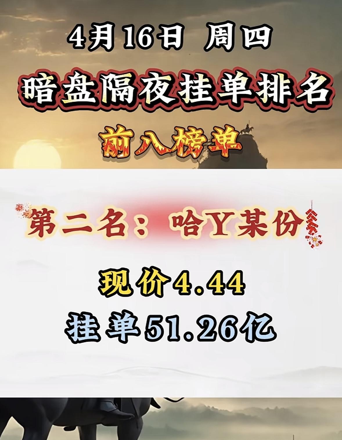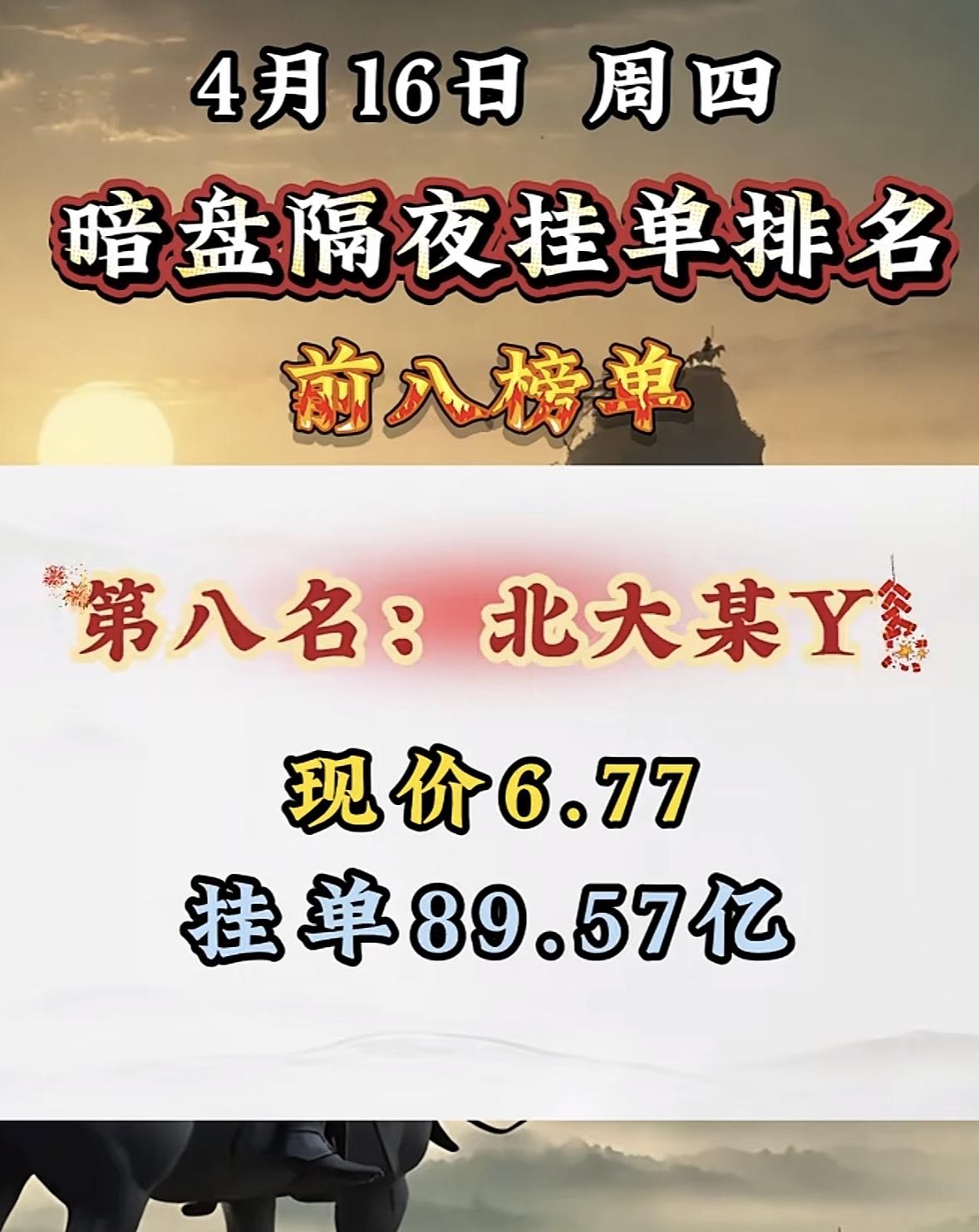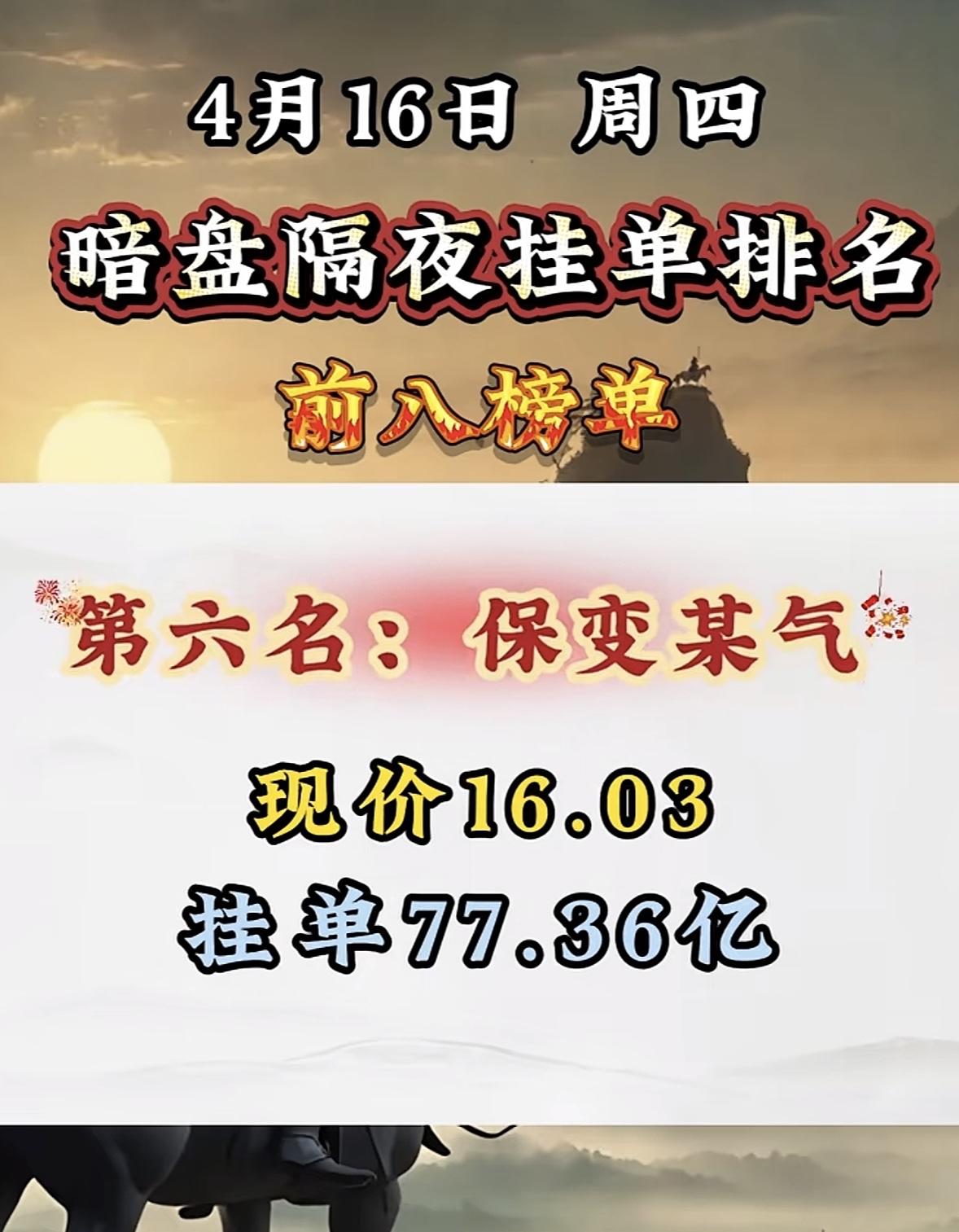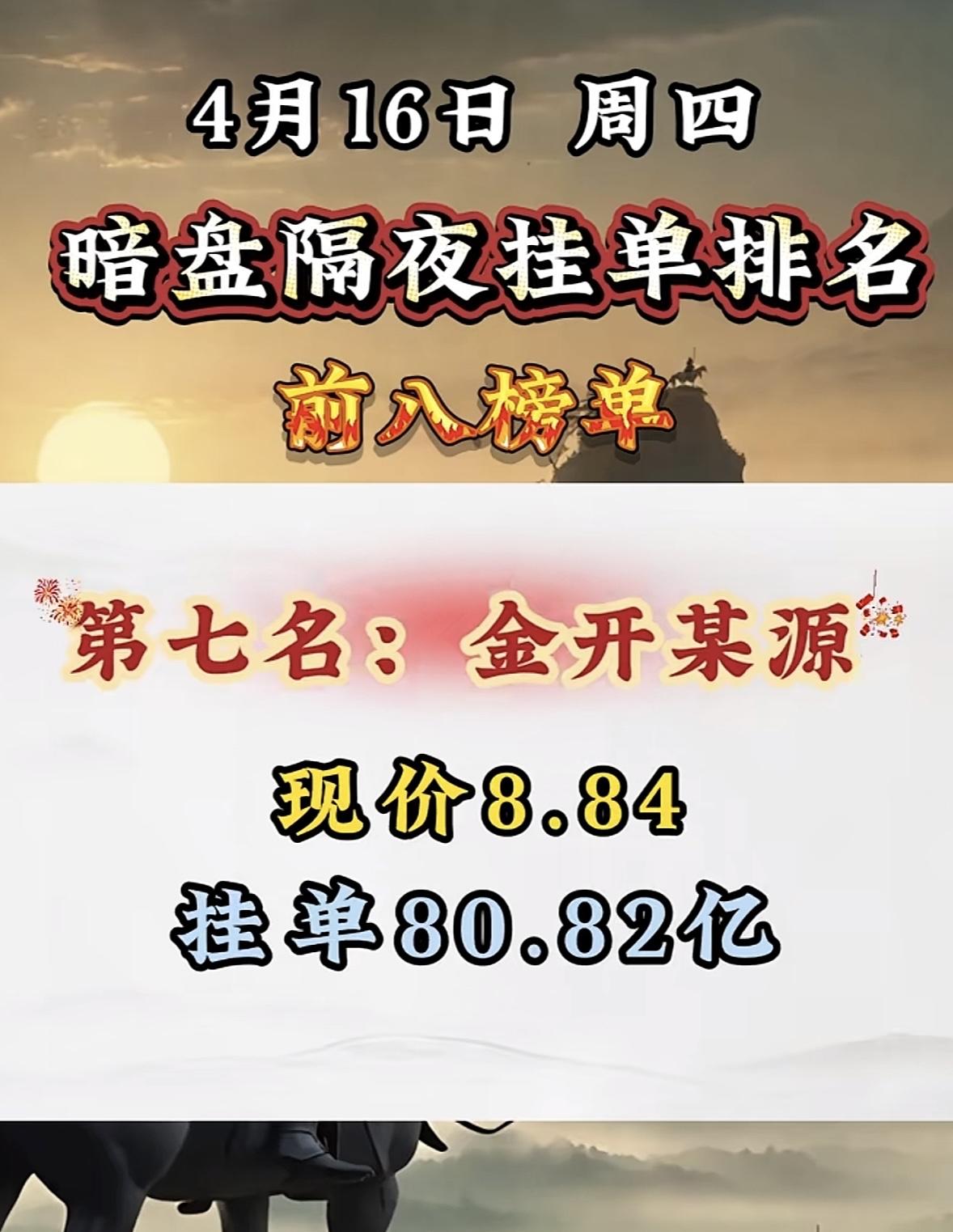 4月16日暗盘隔夜挂单排行榜出炉 4月16日暗盘隔夜挂单排名揭晓,金开某源强势上榜,这可太让人兴奋了!回顾之前的排名,4月14日圣阳股份以52.08亿挂单居首,现价20.88;博云新材挂单48.60亿紧随其后,现价12.08。4月9日,杭钢股份挂单58.91亿,因其结合传统钢铁与新兴算力租赁等领域吸引资金;粤传媒挂单65.30亿,借短剧风口受关注;中工国际挂单79.33亿,受益于工程机械和一带一路概念。金开某源此次上榜,背后不知藏着怎样的投资逻辑,值得好好研究一番。