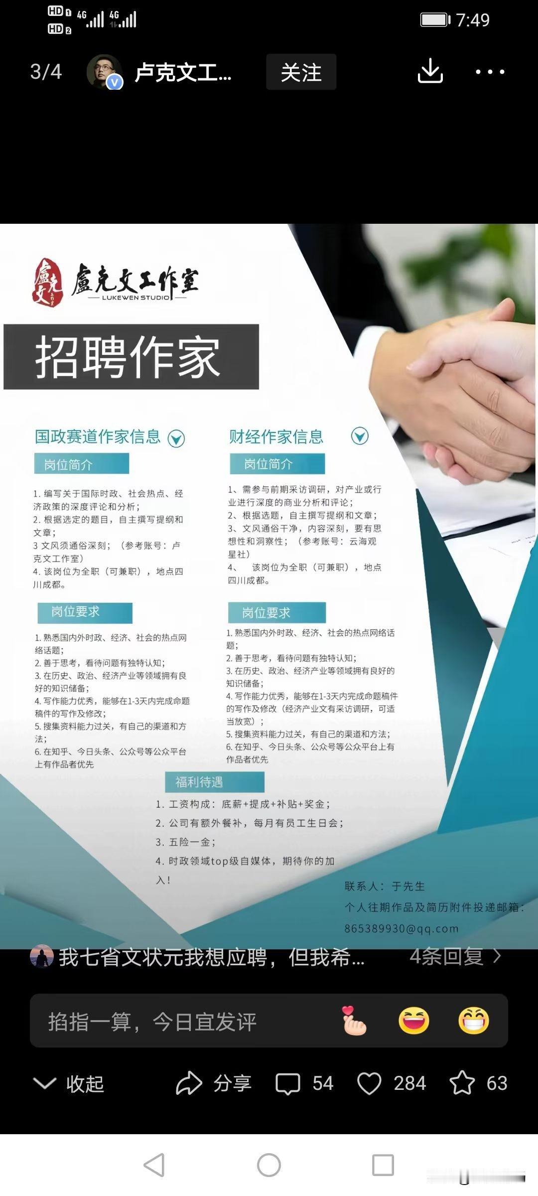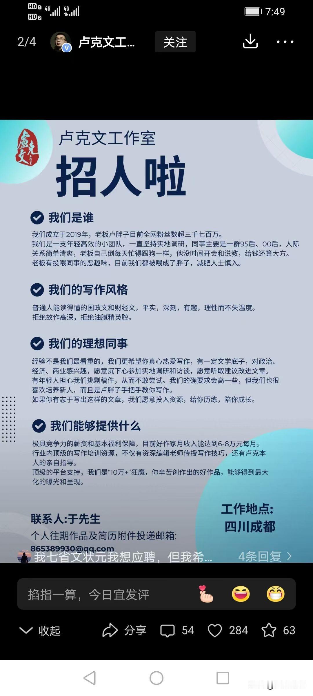 假如你要想成为超级大V,最好办法就是像卢克文一样,招聘一大批顶级写手在工作室,以工作室名义发图文出去,他们工作室图文质量为什么这么高?别人写手月薪就是6到8万,重赏之下必有勇夫。 我们是心情好才创作码字,他们是隔两三个小时一个作品,流水化作业,并且还是视频为主。所以,靠自媒体想挣钱的人,单打独斗的时代,早就是过去式了。 (图片来源于网络) 卢克文工作室 卢克文采访 普通人想当博主 写文博主