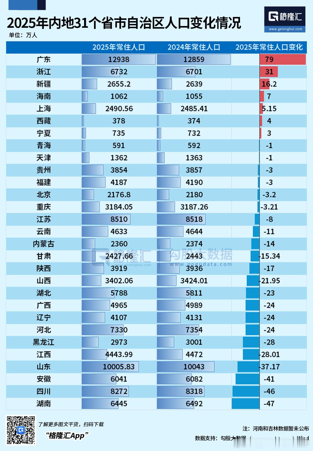2025年人口净流入的地区:广东、浙江、新疆、海南、上海、西藏、宁夏