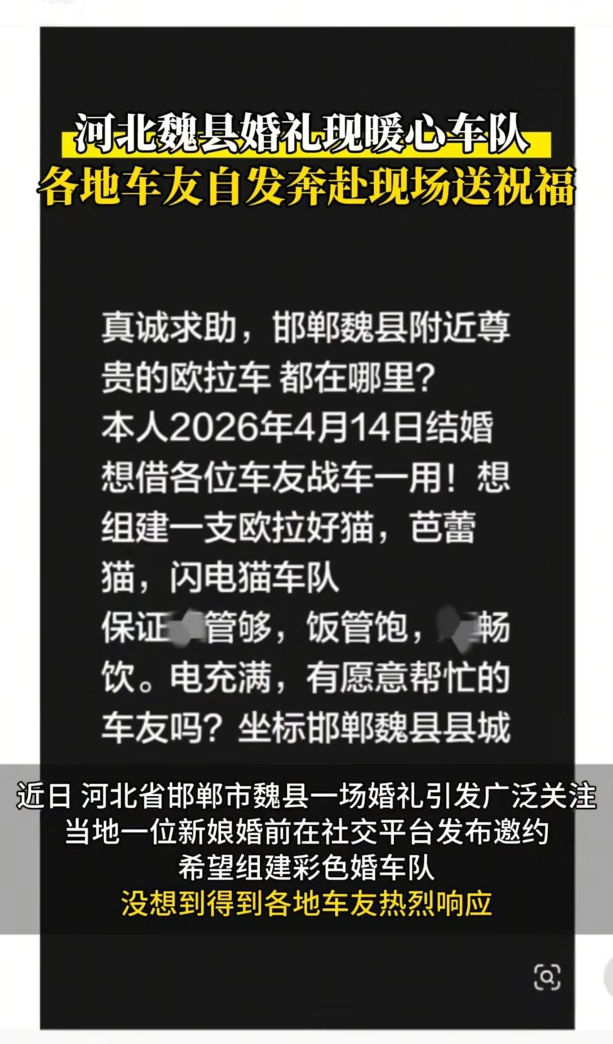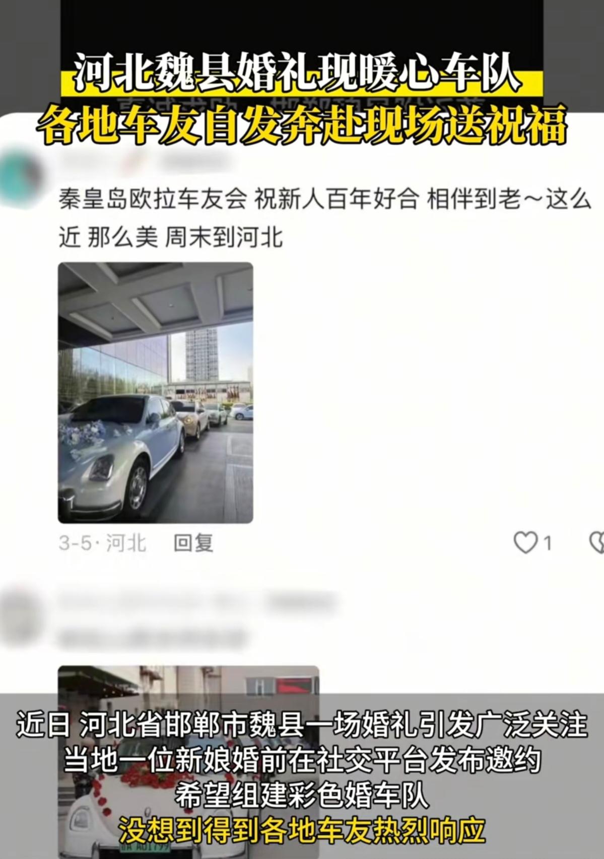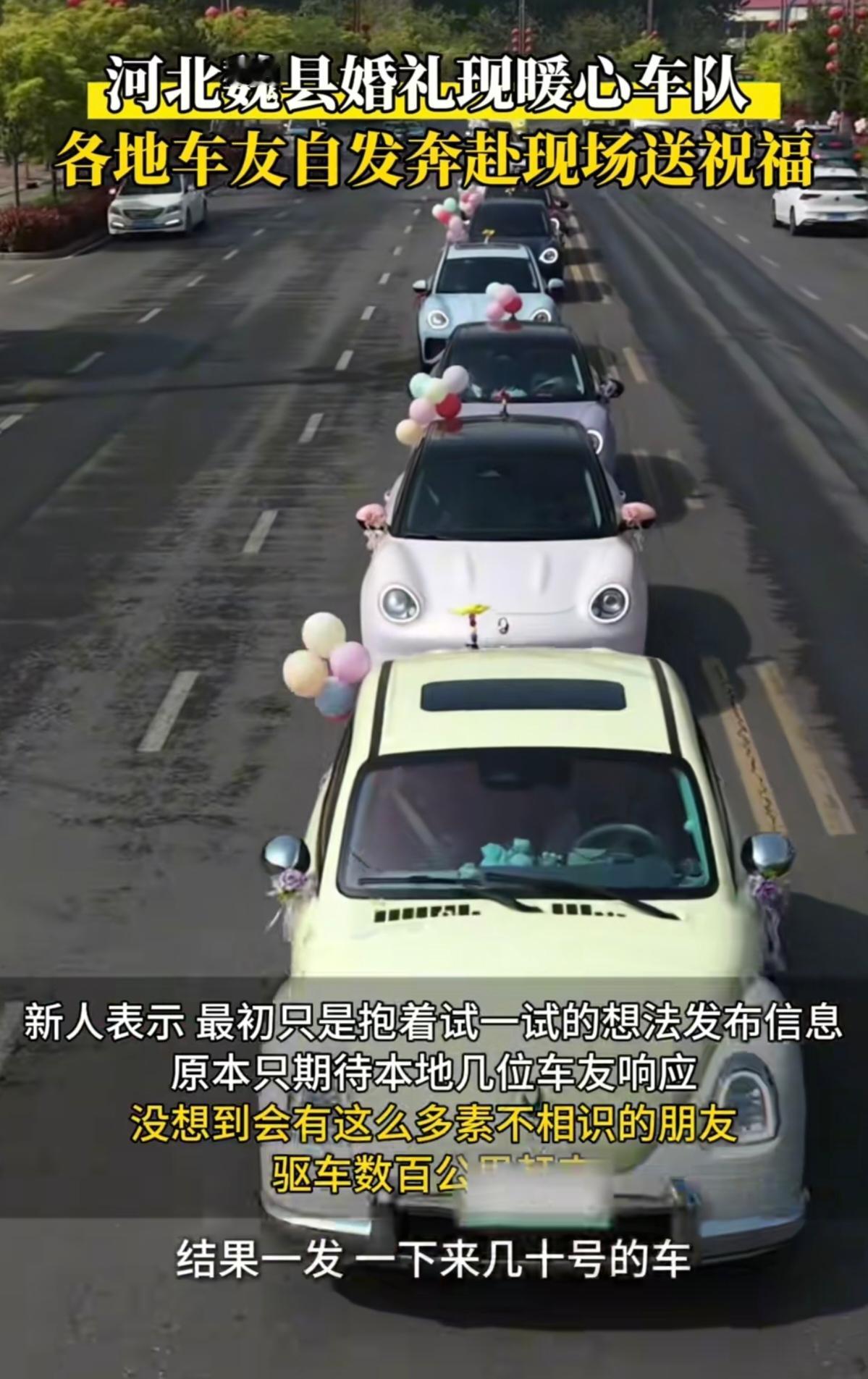 河北邯郸魏县街头,36辆欧拉车组成“七彩祥云”,背后竟是一场陌生人的千里奔赴! 4月14日清晨,邯郸魏县街头惊现奇景:36辆欧拉汽车排成长龙,好猫的圆润、芭蕾猫的优雅、闪电猫的凌厉,在晨光中交织成一道流动的彩虹。这可不是什么豪车租赁公司的杰作,而是来自全国各地的陌生车主,为一场婚礼自发集结的“善意车队”! 新娘婚前发帖求助,竟引来山东、河南、山西等地的车主驱车数百公里赴约,有人甚至从500公里外赶来。这场婚礼没有天价彩礼,没有奢靡排场,却让全网直呼:“这才是人间最动人的浪漫!” 新娘一句求助,点燃全国车主的善意之火。故事要从一个月前说起。准新娘婚前突发奇想,在社交平台发帖:“邯郸魏县附近欧拉车主们,我4月14日结婚,想借各位的车组队!烟管够、饭管饱、酒畅饮,电充满!” 起初,她只盼着能凑几辆本地车,没想到帖子如星火燎原,迅速引爆网络。车主们看到后,纷纷响应:“山西的来了!”“河南的报名!”“唐山的车已加满油!”一位车主直言:“为陌生人圆梦,这事儿太酷了!” 婚礼当天,36辆车从四面八方汇聚,车主们放下工作、调开行程,只为赴这场“陌生人的约定”。新娘站在车队前眼眶发红:“没想到一条帖子,竟能换来天南海北的真心。” 没有金钱堆砌,却有比豪车更珍贵的东西。这场婚礼,彻底颠覆了人们对“排场”的定义。按市场价,36辆新能源婚车租赁费至少1.44万元,而新娘仅凭“烟管够、饭管饱”的朴素承诺,换来36颗滚烫的心。 一位山西车主驱车6小时赶到,笑着说:“为别人的幸福跑一趟,值!”更戳心的是,车主们与新人素不相识,却愿为一条帖子跨越山海。这背后,藏着对真诚的信任,对美好的守护。网友感叹:“最动人的婚车队伍,不是豪车满阵,而是陌生人都在为你的幸福护航。”当物质主义盛行,年轻人却用行动证明:婚礼的仪式感,从不在金钱多少,而在心意的重量。 这场婚礼,恰是传统与现代的完美融合。新娘用“七彩祥云”替代豪车,既保留了中式婚礼的热闹排场,又注入新时代的创意与温度;车主们的奔赴,既延续“十里八乡来帮忙”的乡土情谊,又通过互联网实现跨地域联动。正如2026年春运期间,沪陕高速上婚车被60多辆陌生车自发陪跑;四川米粉集结数百辆小米车助阵婚礼…… 这些案例勾勒出新时代图景:年轻人正用温度与创意,重新定义仪式感。而邯郸婚礼的特别之处,更在于它折射出社会变迁——当“天价彩礼”“婚车攀比”渐失市场,年轻人开始回归情感本质。新娘敢公开求助,车主愿放下一切奔赴,这种双向信任,恰是社会文明提升的缩影。 在“别和陌生人说话”的警惕声中,这场婚礼却上演了最纯粹的信任。车主们为何愿为陌生人奔赴?一位参与者道出心声:“看到求助时,觉得新娘很真诚,想帮她圆梦。” 这份信任,与去年“河北婚车被拦”事件形成鲜明对比——当有人借婚礼谋利,邯郸车主却用善意成全幸福。更深层的意义在于,它激活了中国人骨子里的互助精神。从临清公益接亲车队,到魏县跨省助阵,案例证明:互助基因从未消失,只待契机被点燃。这种自发形成的善意网络,正成为社会治理的温暖注脚。 36辆欧拉车驶过魏县街头的那一刻,不仅为新人留下难忘记忆,更给社会注入暖流。它告诉我们:在这个快节奏的时代,最珍贵的不是豪车名表,而是陌生人之间那份不期而遇的温暖。 当善意能跨越地域、突破圈层自由流动,社会便沐浴在人性光辉之中。这场婚礼的意义,不在于排场多炸街,而在于它证明——永远不要低估善良的号召力:一发光,就会有人追着光赶来。 愿这份跨越山海的善意,永远被温柔托举;愿每个真诚的求助,都能遇见愿意奔赴的人。因为,最高调的排场,永远是陌生人对你的温柔相待。