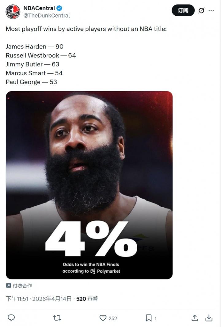 现役“0冠”球员季后赛胜场数TOP5: 1、哈登——90胜 2、威少——64胜 3、巴特勒——63胜 4、斯玛特——54胜 5、乔治——53胜 哈登年年进季后赛,这个胜场数也就上来了,但生涯至今,他只是在生涯早期,作为替补打进过一次总决赛,此后转战多地,再也无缘最高舞台。 排名第二对的威少也是一样,这哥俩的经历告诉很多后来者,总冠军着实是需要一些运气的,如果第一次打进总决赛,千万不要想着以后还有机会再来一次,因为这可能就是生涯唯一一次了,这次就得玩命。