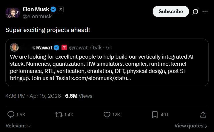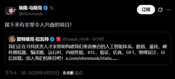 埃隆马斯克刚转发了一条招聘,说接下来会有“很令人惊喜的项目”。 招聘信息大意是特斯拉正在寻找顶尖工程师,一起打造自研的一体化AI技术栈(从底层到应用全覆盖),涉及数值计算、模型量化、硬件仿真、芯片设计、芯片仿真与调试等等。 马斯克说的惊喜项目,可能是下一代Dojo,甚至有可能是下一个英伟达,大家觉得呢? 电车出海 特斯拉
