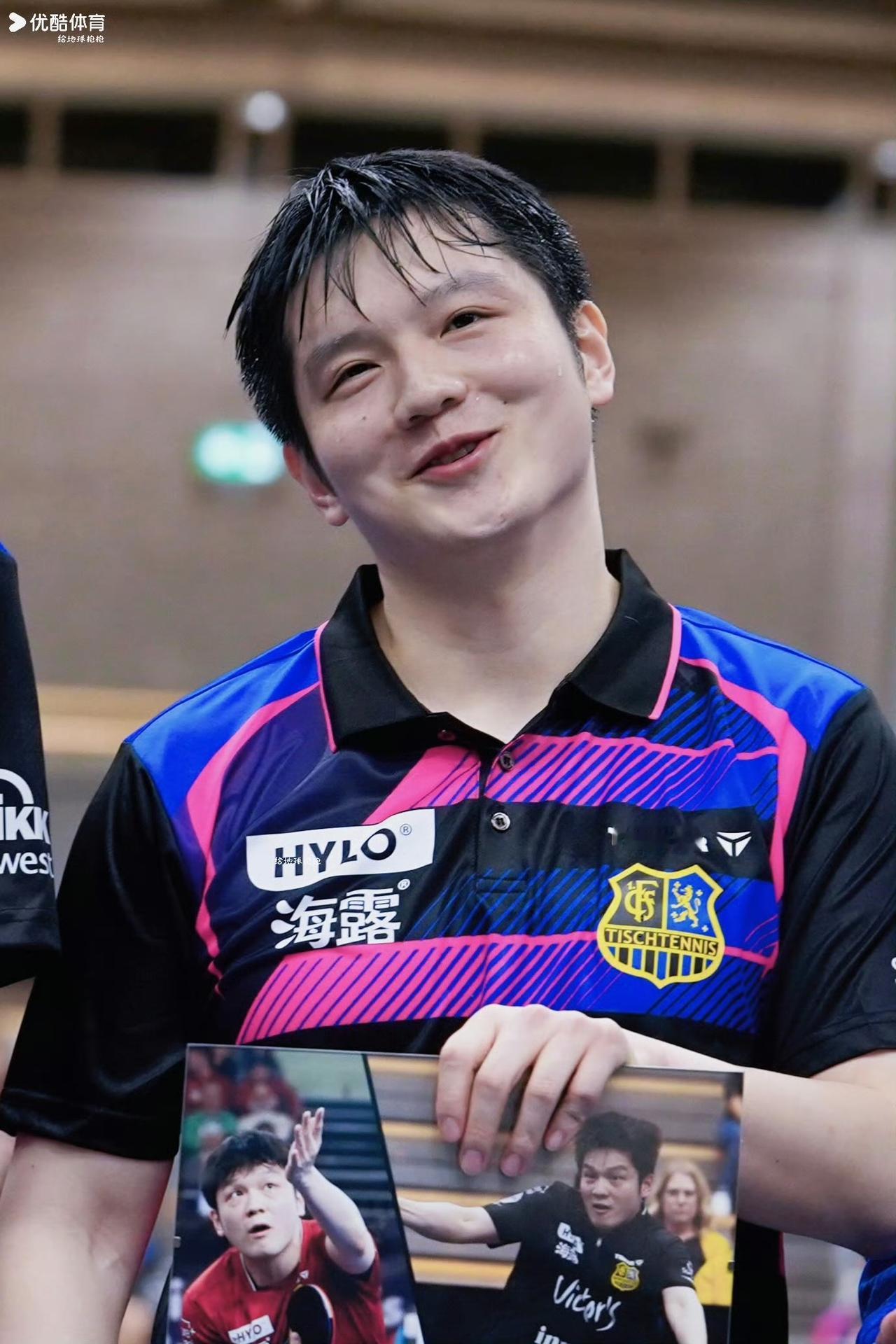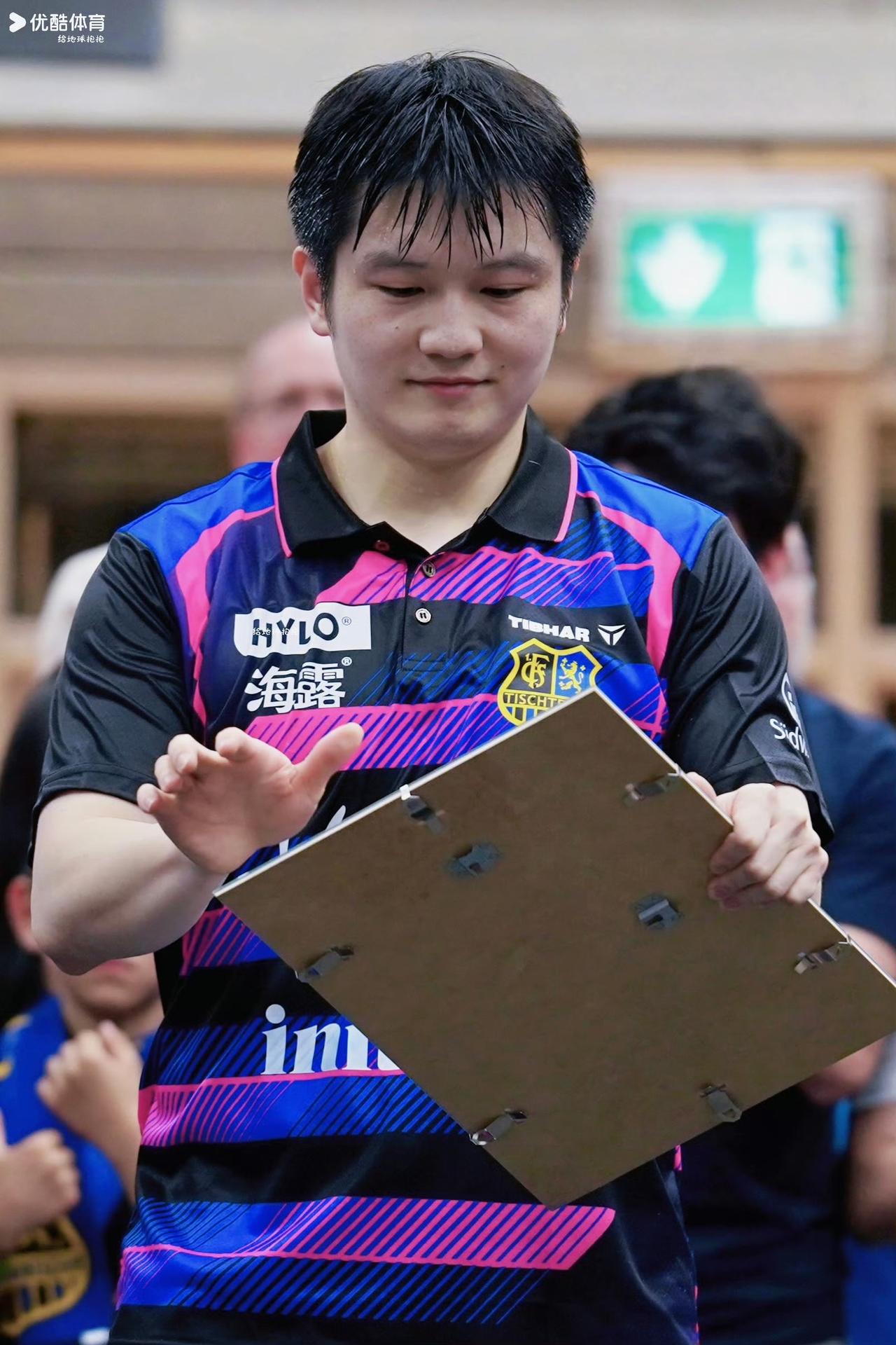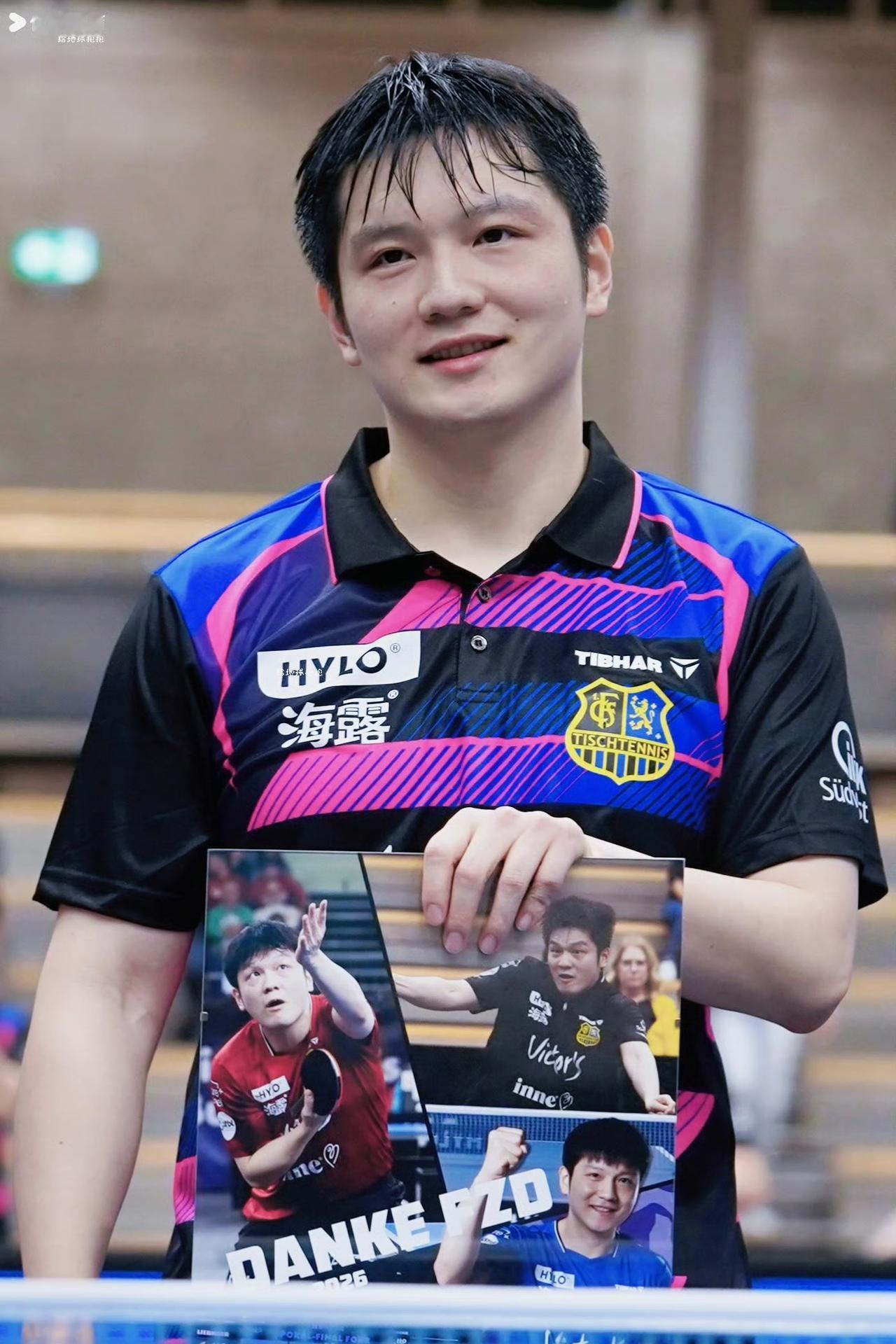 老爷爷送樊振东告别礼物的一幕, 现场10张温暖的照片… 在2026年4月16日德甲常规赛主场收官战(萨尔布吕肯对阵云达不莱梅)后的告别仪式上,俱乐部老板——一位白发老爷爷——向樊振东赠送了精心准备的礼物。礼物包含: 三张樊振东个人比赛照片,记录其在萨尔布吕肯的高光时刻; 三套不同配色的球队主场战袍,象征其身穿蓝色球衣征战的岁月; 一张球队全员合影,定格与队友并肩作战的情谊; 这份充满温情的告别礼承载着俱乐部对这位中国乒乓球巨星一年效力的珍视与敬意。 谢谢萨尔布吕肯队的告别仪式和礼物,也祝樊振东接下来的德甲之路,健康涨球,一帆风顺。