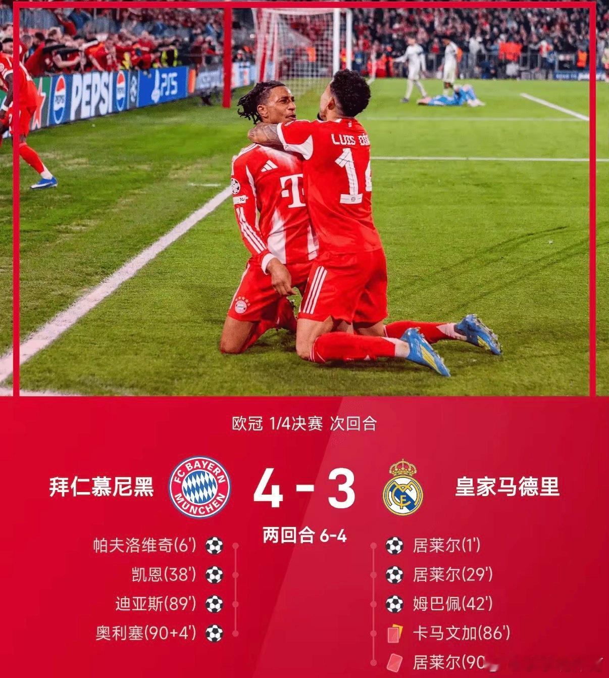 25/26赛季欧冠1/4决赛次回合,拜仁慕尼黑主场对阵皇家马德里。上半场,诺伊尔开场送大礼,居莱尔吊射空门建功,帕夫洛维奇迅速扳平;随后居莱尔直接任意球世界波完成双响,凯恩禁区内抽射破门,半场结束前姆巴佩单刀建功。下半场,诺伊尔多次救险,卡马文加86分钟两黄变一红被罚下,迪亚斯89分钟世界波绝杀,奥利塞补时锁定胜局,赛后居莱尔因质问裁判染红。最终,拜仁4-3皇马,总比分6-4淘汰对手晋级欧冠4强,将在半决赛遭遇巴黎圣日耳曼。拜仁vs皇马