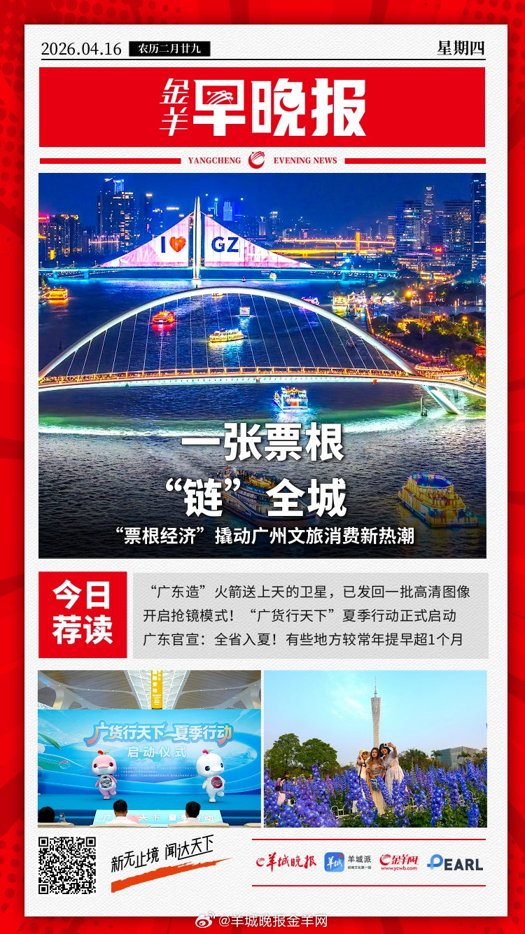 #金羊早晚报# 开启抢镜模式!“广货行天下”夏季行动正式启动;好快好清晰!“广东造”火箭送上天的卫星,已发回一批高清图像;多部门联合发布《口岸重点管控外来物种名录》,5月1日起实施;“全国销量第一”的柚汁,柚含量不到3%:我们喝的到底是什么?微短剧人均单日使用时长129分钟,短视频成瘾如何自救?张雪机车LOGO抄袭?设计公司回应系独立创作完成;4月29日火车票开售!大湾区两大环线全新亮相,五一欢乐启程;免费领取!“跟着赛事游广东”文旅护照正式发布;莫氏鸡煲走红后,佛山鸡煲近两周平台消费同比增长84%;一张票根“链”全城:“票根经济”撬动广州文旅消费新热潮;广东官宣:全省入夏!有些地方较常年提早超1个月;注意防御!广东大部或有强对流天气,18日起趋于减弱;附加赛前瞻:勇士伤病满营,快船主场期盼大胜; #樊振东英文告别主场球迷# 安赛龙宣布退役,那位中文十级的丹麦奥运冠军告别羽坛;《长安三万里》原班人马打造,追光动画电影《三国第一部:争洛阳》定档暑期;电影《登月》(第一部)终极预告海报双发,全景解锁嫦娥六号硬核探月征程;多国发表联合声明呼吁立即结束黎巴嫩冲突;#美国将退还超1万亿元关税# 美国海关将分阶段启动关税退款。#法国将不义之财归还被抢掠的中国##广交会增设智能穿戴等9大专区##80万开店倒闭又投40万开店小伙发声# 更多精彩报道,请扫码关注羊晚全媒体报道!