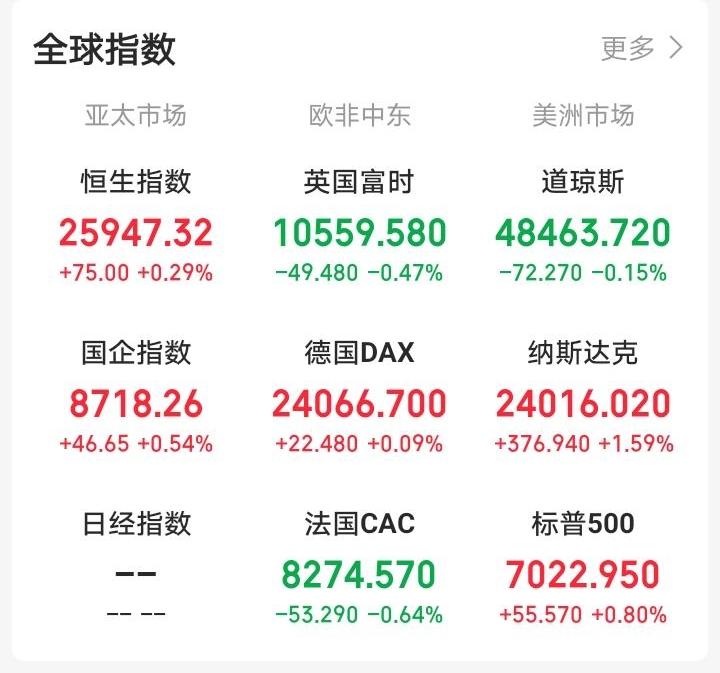 昨天晚上还想着全球市场大涨大A唯我独跌,全网看空,那么今天还会反人性上涨! 一觉醒来,外围上涨趋缓,跌多涨少。老美三大指数涨跌不一,富时期指连续收涨,三倍做多富时中国ETF收涨,纳斯达克中国金龙指数也是上涨的,氛围还算融洽。 隔夜,道指下跌0.15%,纳指收涨1.1.59%,标普500上涨0.80%,三倍做多富时中国ETF上涨0.03%,纳斯达克中国金龙指数上涨0.75%,富时A50期指连续上涨0.27%,欧非中东、美洲市场总体来看跌多涨少,索性跌幅不大!昨天外围普涨,大A独自下跌,那么今天外围走势偏弱,是不是大A反而会走强呢? 慧眼认为,今天大A会再次挑战全球市场,来个唯我独涨,完全是有可能的。大A昨天虽然是下跌的,但短线上涨趋势没有发生变化,因此慧眼认为今天大A会再次反人性上涨收阳线! 说实话,只要闲钱满仓持有高分红,没有退市风险的票,不大涨不卖,吃分红,其实是不用担心的,后续赚钱是没问题的!说白了就当存银行了就好,大家说是吧! 人最重要的是,要保持积极良好的心态,积极乐观的过好每一天。心有光,脚下有路,你远比自己想象的更坚韧,追光的人,终会光芒万丈。 理财有风险,投资需谨慎。大家一定要保持谨慎,做好风险控制。 点赞关注是对我最大的支持!