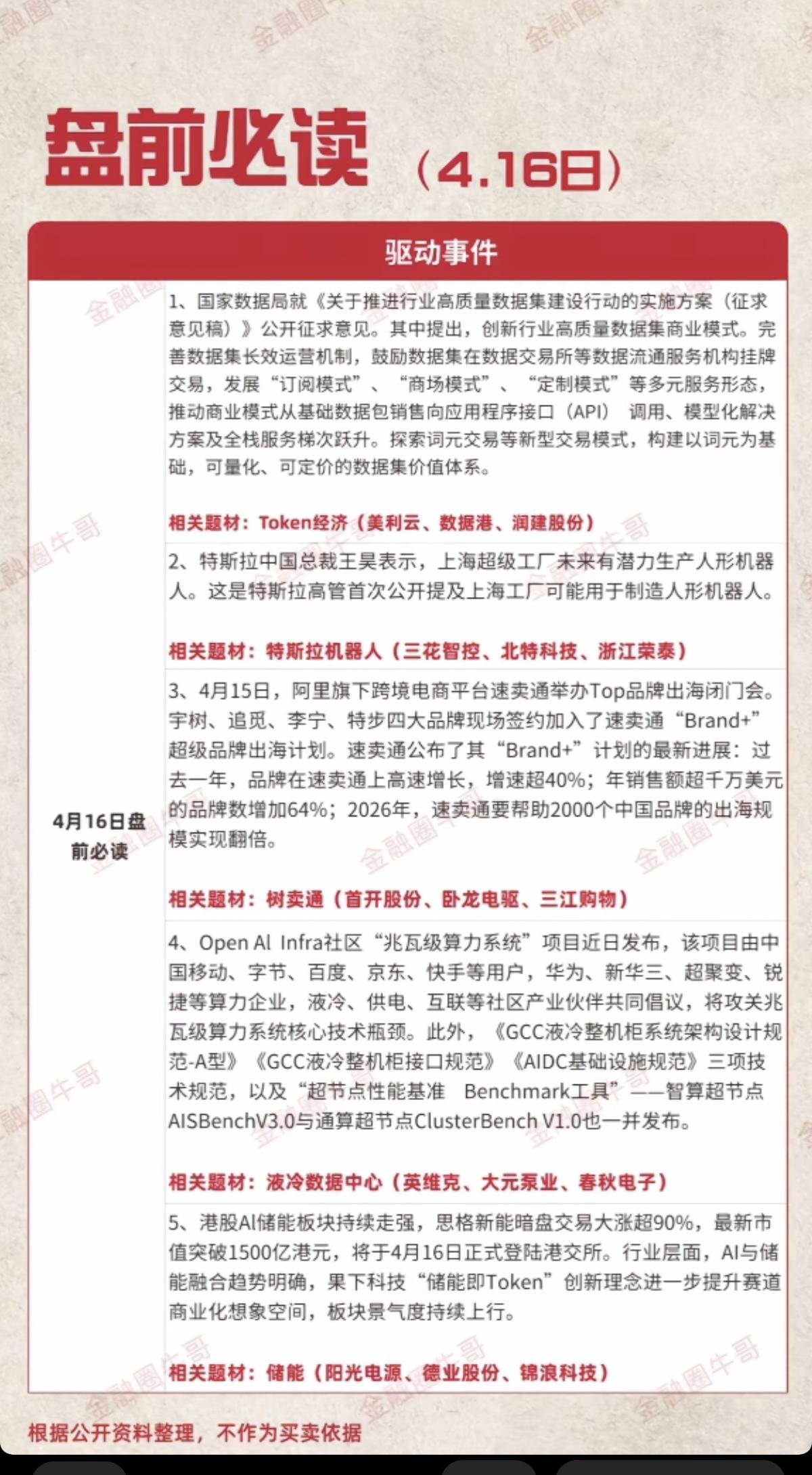4.16周四 财经热点信息汇总! 1.Token经济 2.特斯拉机器人,上海超级工厂 3.树卖通 4.液冷数据中心,算力 5.储能
