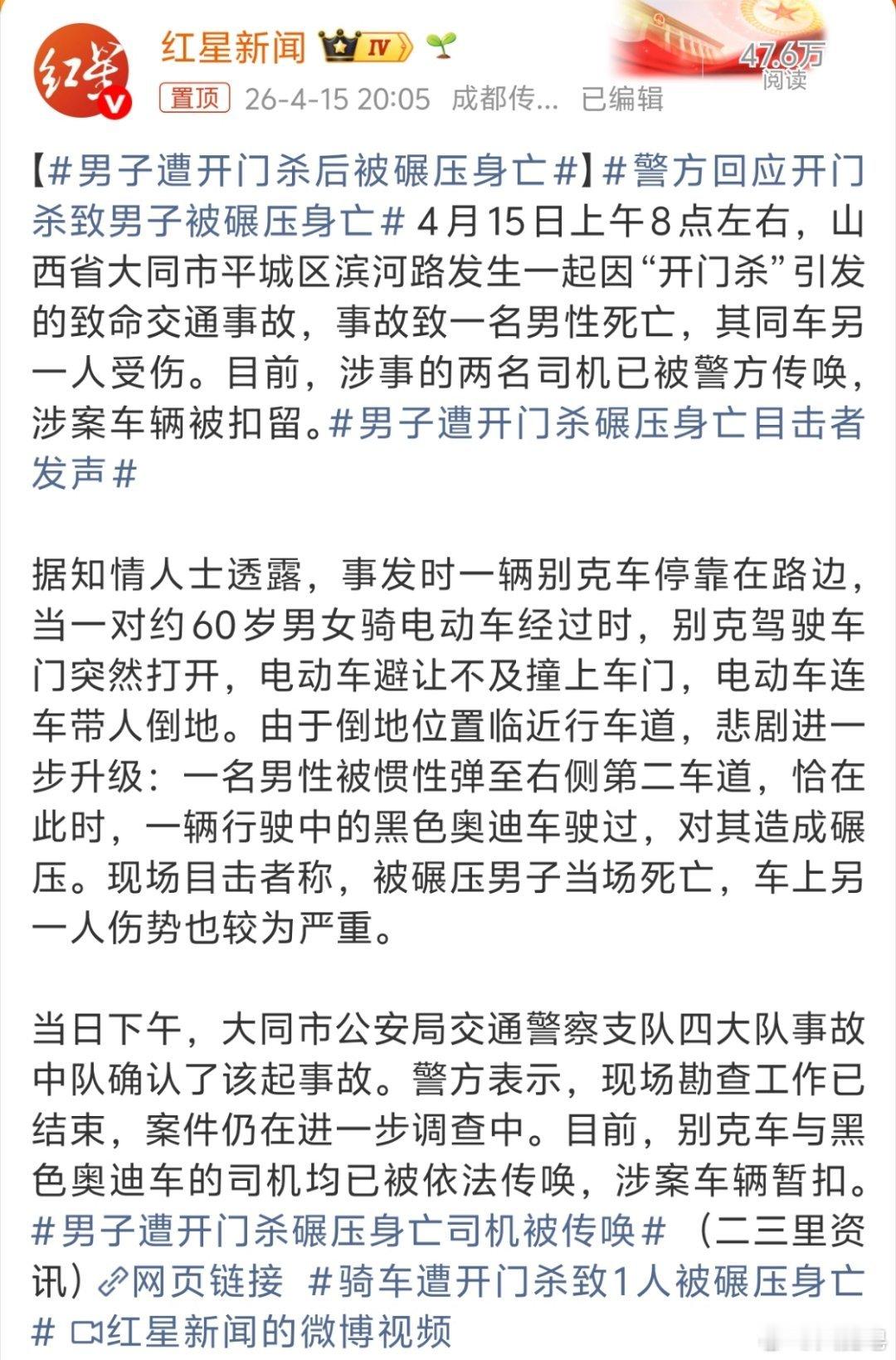 男子遭开门杀碾压身亡目击者发声 车都停到两边,非机动车没地方走,只能借道走到中间机动车道上。但是谁能想到突然间前车开门?谁又能想到右边突然间有辆车驶来。一切就是这么的巧……