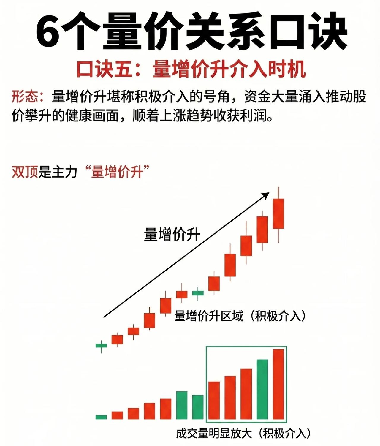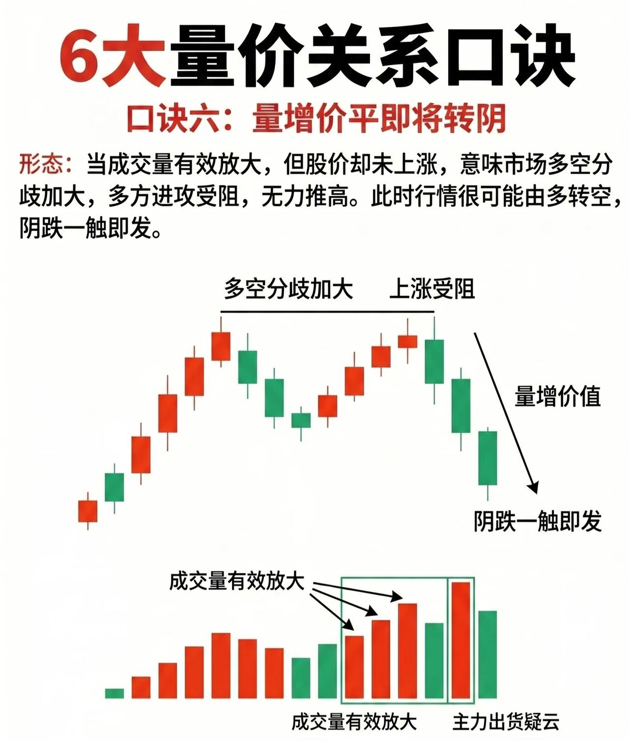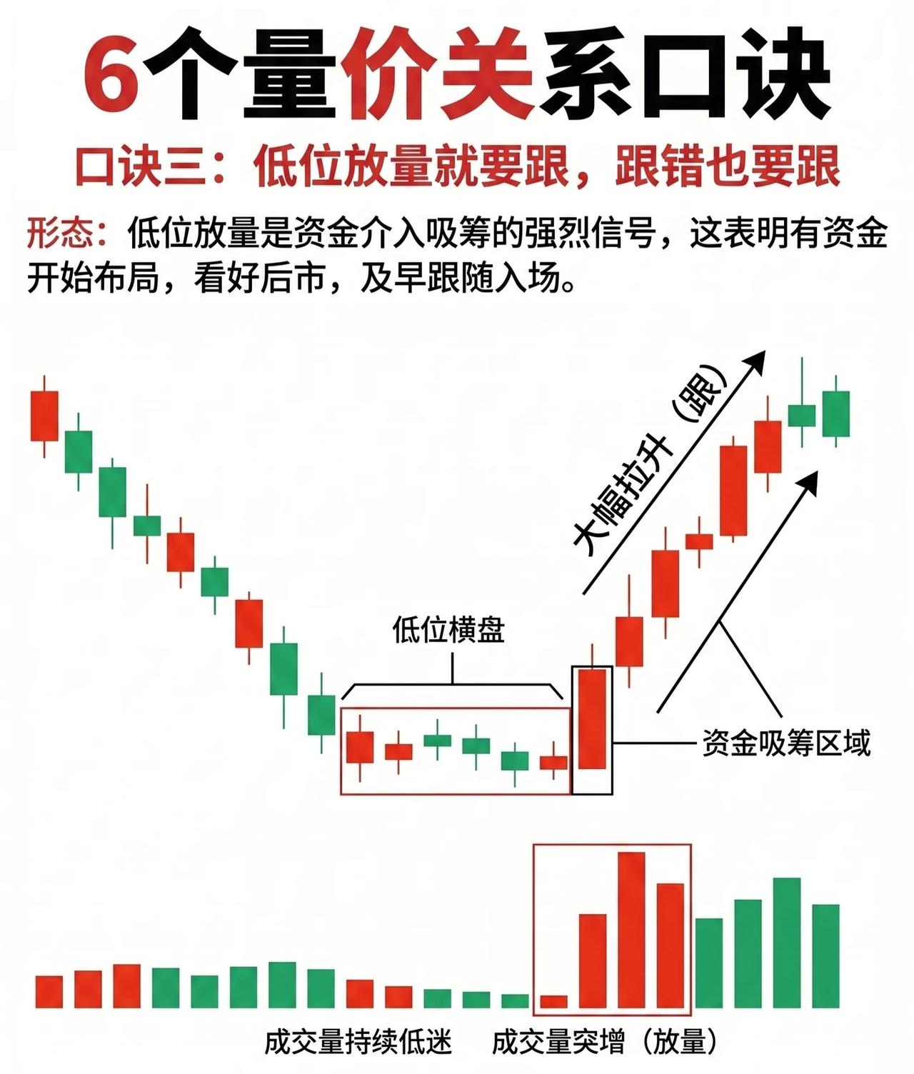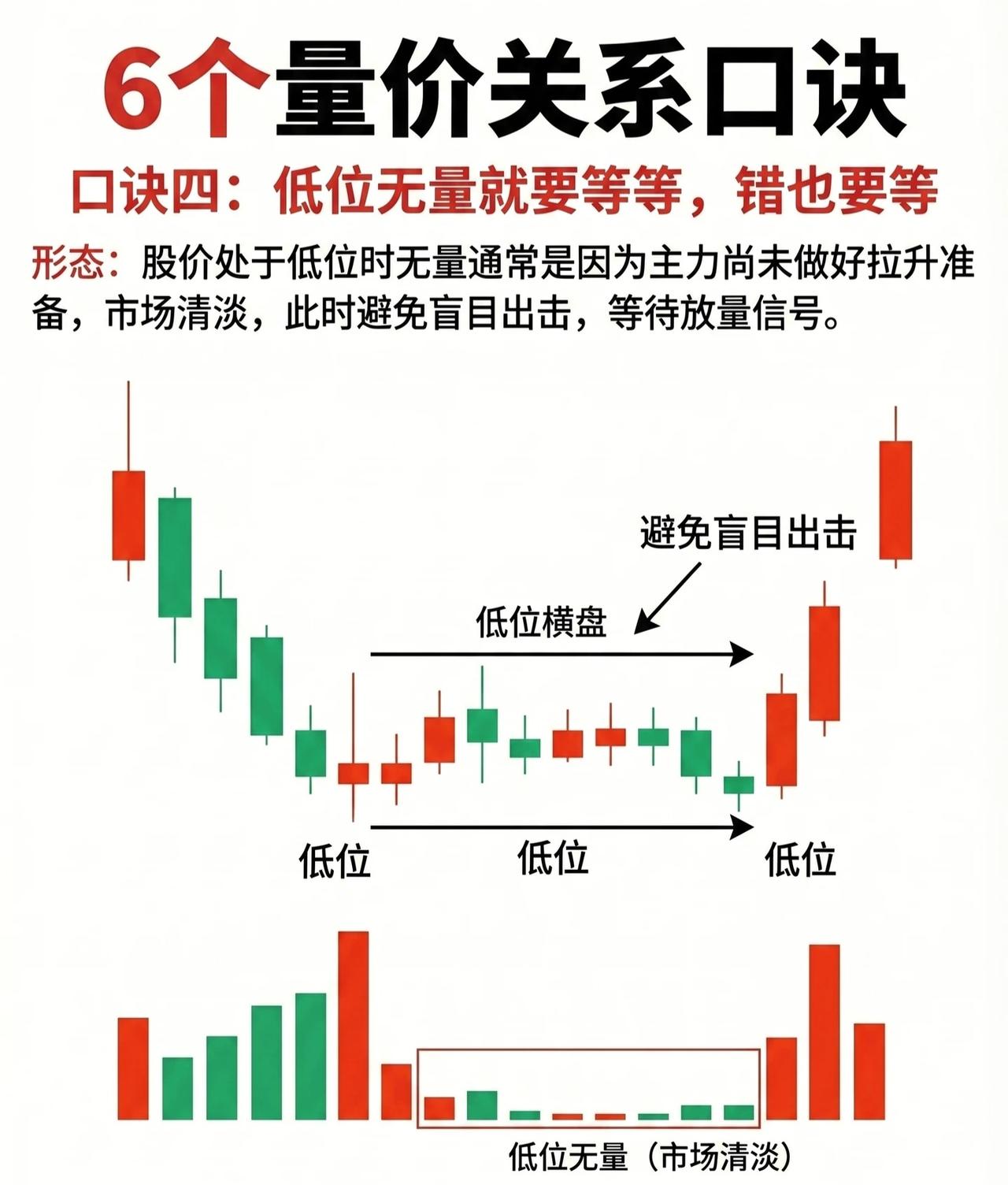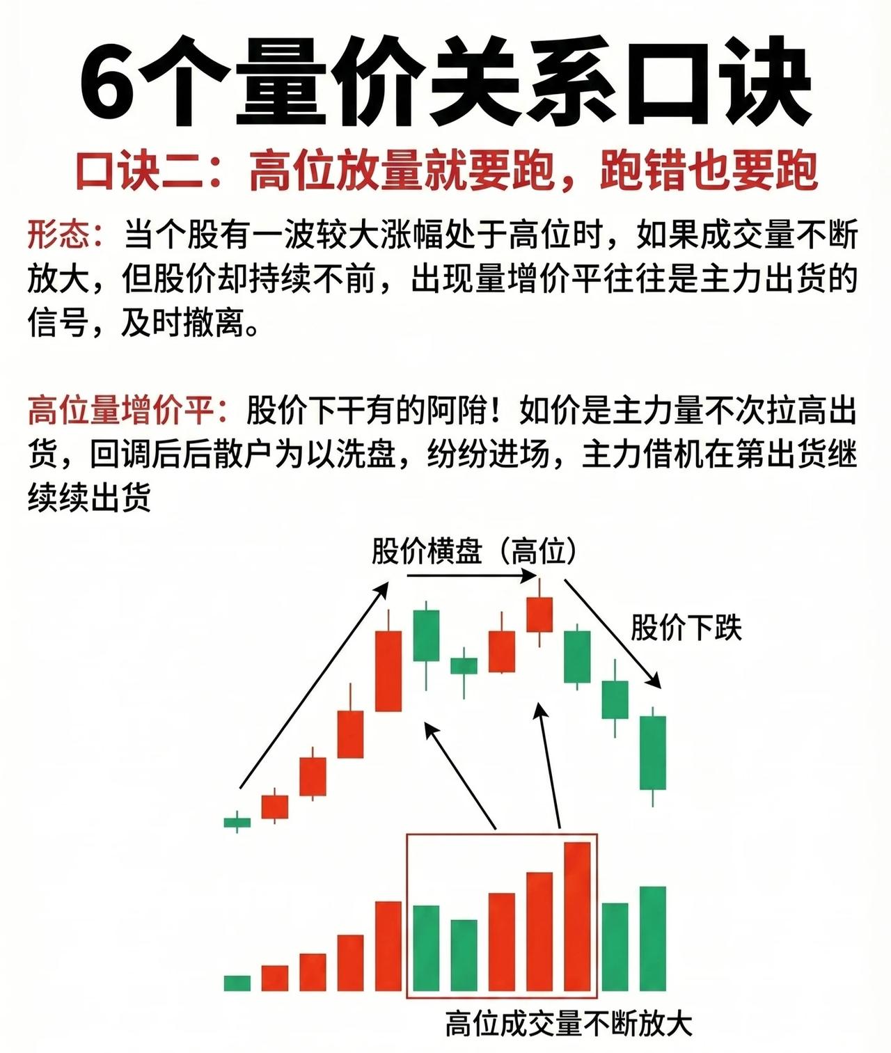 6大量价关系实战口诀(专业润色版) 口诀一:高位无量拿,拿错亦要拿 形态解析:当股价处于或接近历史高点区域时,若在此区间呈现无量横盘态势(成交量显著萎缩),则大概率属于上涨中继形态。 逻辑原理:无量横盘表明市场抛压极轻,主力资金或在暗中完成筹码布局,为后续拉升行情蓄势。此时需坚定持有,即便判断失误也应及时把握机会。 口诀二:高位放量跑,跑错也要跑 形态解析:个股经历一波较大涨幅后处于高位区间,若出现量增价平(成交量持续放大,但股价止步不前甚至横盘震荡),往往是主力出货的强烈信号。 逻辑原理:量增价平阶段,股价滞涨的背后是主力借机派发筹码,回调后散户易误判为洗盘而入场,主力则顺势持续出货。此时需果断撤离,避免深套。 口诀三:低位放量跟,跟错也要跟 形态解析:股价处于低位区域时,若出现放量(成交量突然大幅放大,突破前期低迷水平),则是资金介入吸筹的强烈信号。 逻辑原理:低位放量表明有主力资金开始布局,看好后市行情,投资者应及早跟随入场,捕捉后续拉升机会。 口诀四:低位无量等,错也要等 形态解析:股价处于低位区间时,若成交量持续低迷(无量横盘),通常是主力尚未完成拉升准备、市场交易清淡的体现。 操作策略:此时应避免盲目出击,耐心等待放量信号出现(资金介入的标志),再择机布局。 口诀五:量增价升,积极介入时机 形态解析:量增价升(成交量显著放大,同时股价持续攀升)堪称积极介入的号角,是资金大量涌入推动股价健康上行的典型形态。 操作策略:此时应顺着上涨趋势果断介入,依托量价齐升的动能收获利润。 口诀六:量增价平,即将转阴 形态解析:当成交量有效放大,但股价却未上涨(量增价平),意味着市场多空分歧加剧,多方进攻受阻、无力推高股价。 趋势预判:此时行情极易由多转空,阴跌行情一触即发,需提前做好风险防控。 核心逻辑总结 量价关系是技术分析的核心维度,通过“成交量”与“股价位置/趋势”的联动关系,可识别主力意图(吸筹、出货、洗盘、拉升),从而制定对应的买卖策略。记住:高位看量能(无量持股、放量离场),低位看量能(放量跟进、无量观望),趋势中看量价配合(量增价升介入、量增价平转阴)。