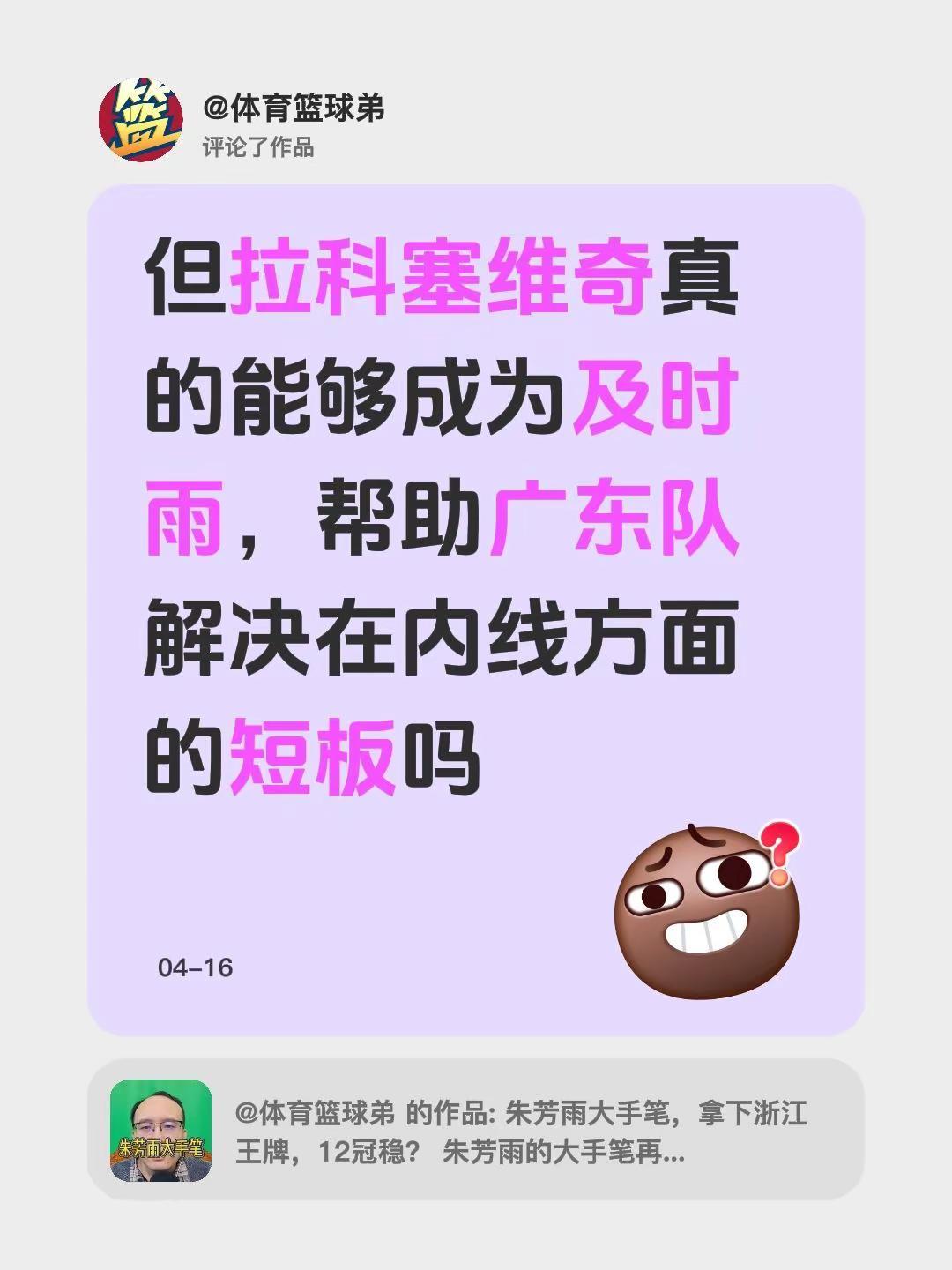 我评论了@体育篮球弟 的作品:但拉科塞维奇真的能够成为及时雨,帮助广东队解决在内线方面的短板吗