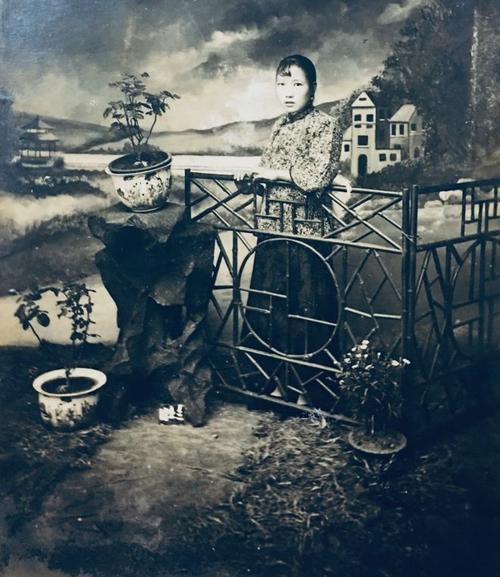 这是一张20世纪20-30年代民国时期照相馆拍摄的女性肖像照,该女性上身是碎花斜襟大袖衫,下搭深色长裙,是当时“上衣下裙”的主流穿搭。 她倚靠在栏杆、正视镜头,神情端庄略带拘谨,是当时女性首次面对镜头的典型状态。