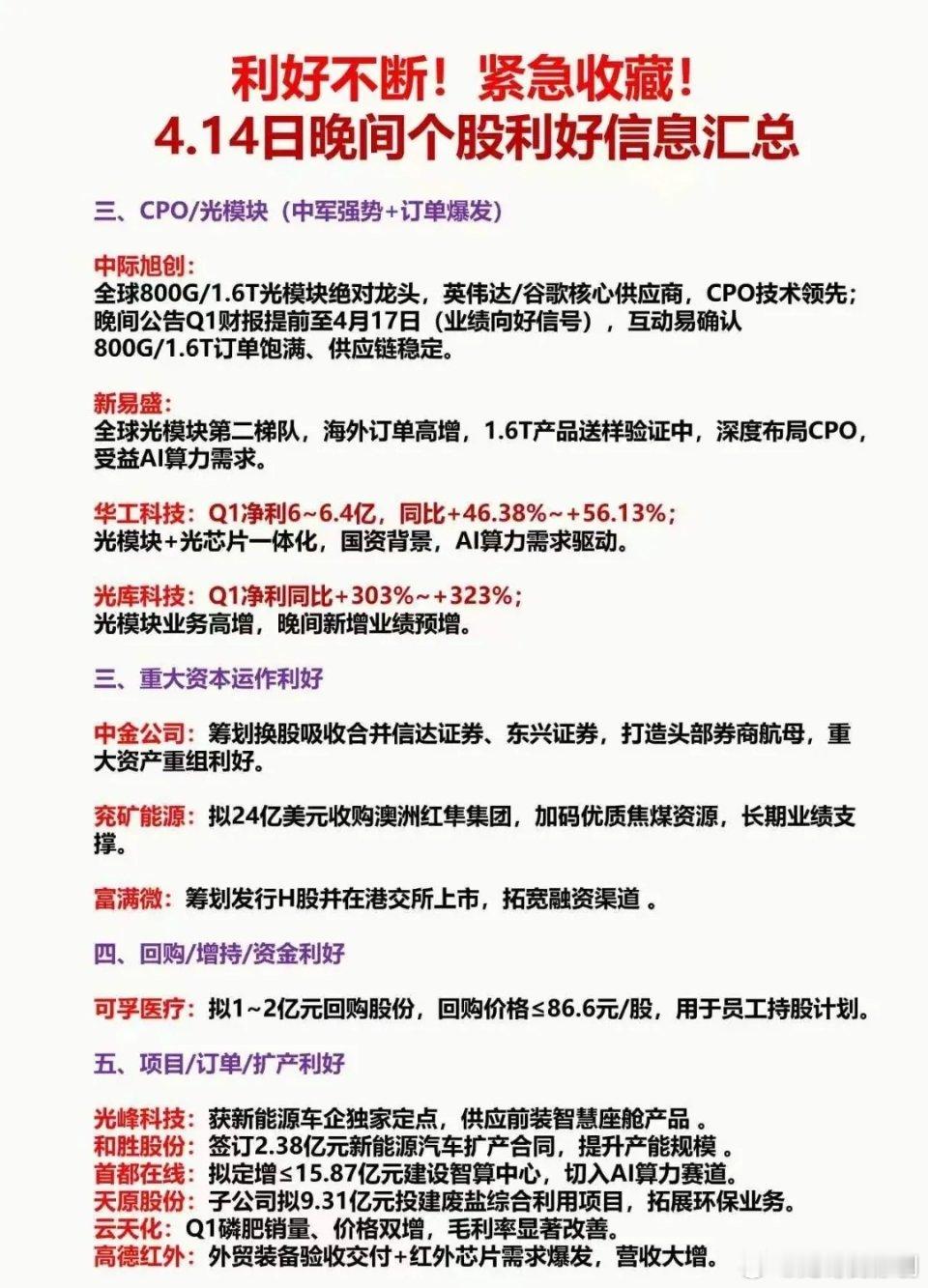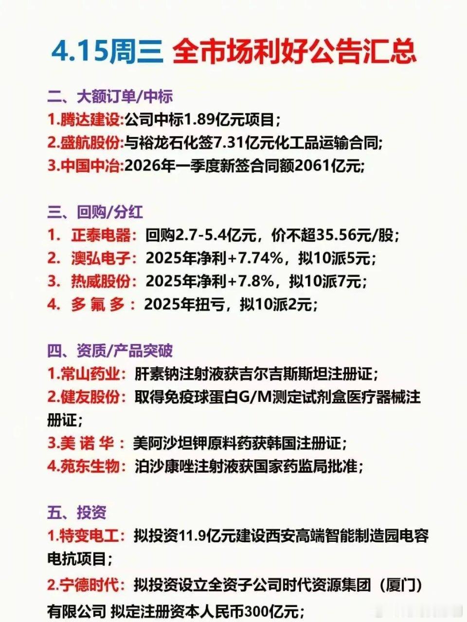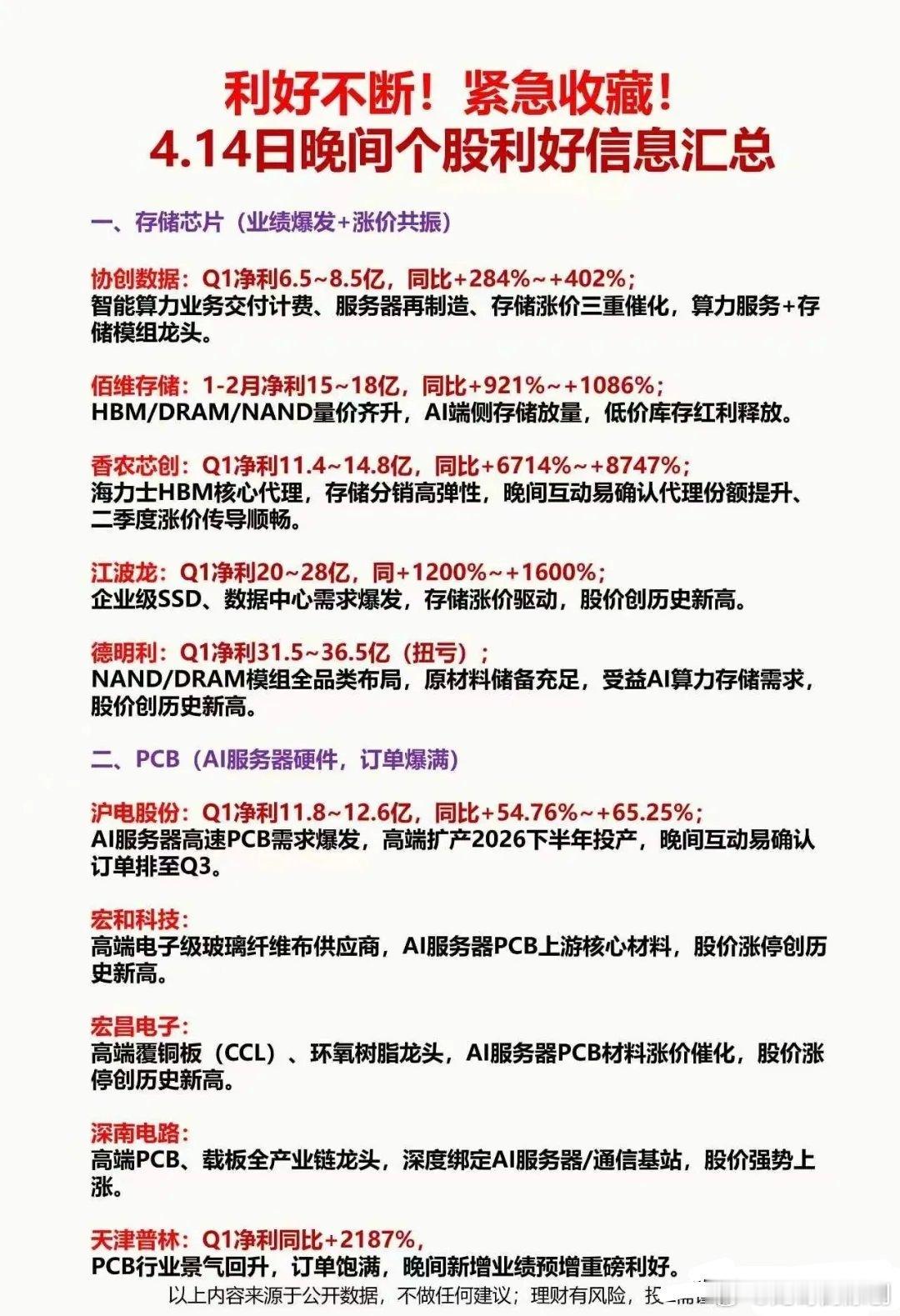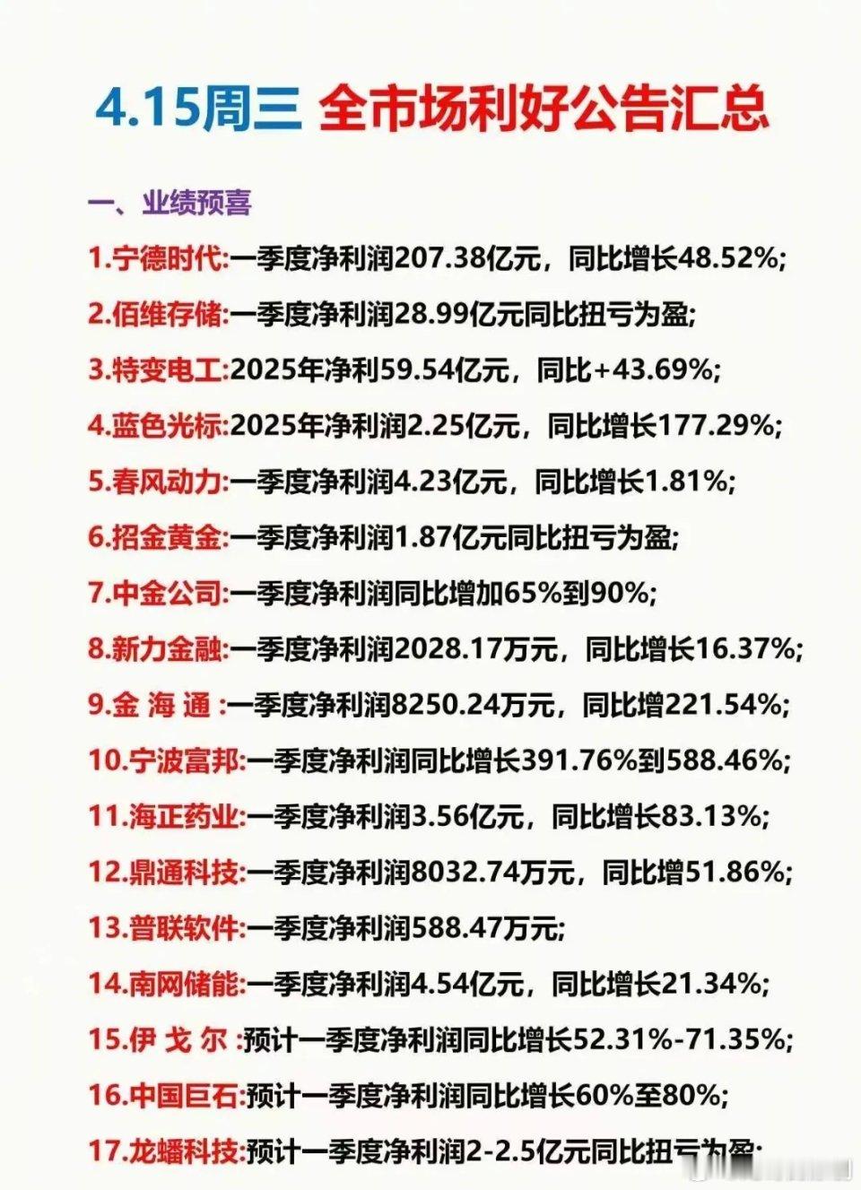 4.15盘前必读!利好炸场!AI算力+创新药主线全梳理。兄弟们们!最新全市场利好公告+热门赛道龙头已全部汇总!业绩预喜潮来袭:宁德时代一季净利207.38亿大增48.52%,佰维存储、招金黄金扭亏为盈,中金预增65%-90%;大额订单、回购分红、重磅投资接连落地,利好扎堆爆发!AI算力彻底引爆:浪潮350亿订单排至2027Q2,工业富联280亿订单排至2028,头部企业订单爆满,高端算力一卡难求,主线景气度拉满!创新药迎黄金机遇:列入新型支柱产业+业绩拐点+出海BD近600亿,叠加AACR+ASCO大会催化,头部药企+细分赛道龙头全覆盖!昨夜AI硬件集体爆发:存储、PCB、CPO/光模块业绩炸裂,协创数据增402%、佰维存储增1086%,AI上下游全线开花!踏准节奏抓主线,吃肉不踏空!点赞+评论扣178,后台私信回复 龙头,直接领取核心标的名单!祝大家持仓日日飘红,投资顺利,财源滚滚来💰