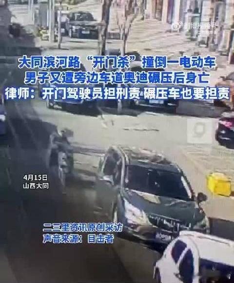 男子遭开门杀碾压身亡目击者发声开门杀引发连环事故,电动车避让倒地后遭后方车辆碾压致一死一伤,两名涉事司机已被传唤。随意开门忽视路况,后方车辆避让不及,本可避免的悲剧因一时疏忽酿成,出行务必多观察,守规则才能保安全。