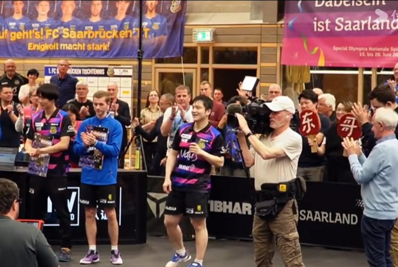 萨尔布吕肯最后一个主场,球队3-1战胜了云达不莱梅队,樊振东独取2分建功。 赛后为即将离队的球员举行告别仪式,樊振东成为观众和镜头齐集的焦点。 离开国内核心赛事,小胖仍然过得很充实,愿阳光帅气的你不负热爱,不负坚持,所有努力都有最好的回报。