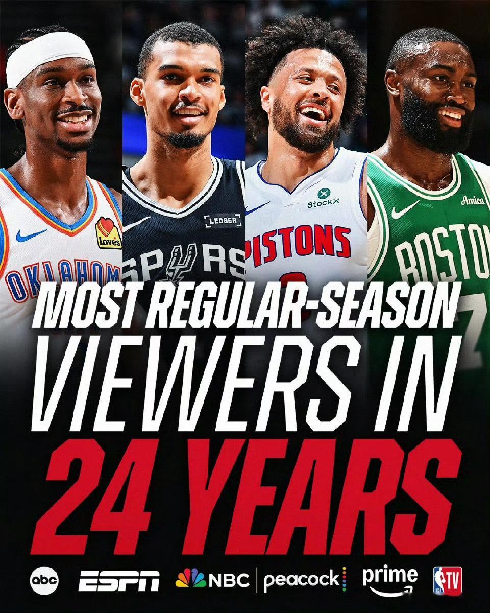 NBA官方:本赛季有1.7亿人口通过全美频道观看比赛,这是最近24年来的最高纪录NBA