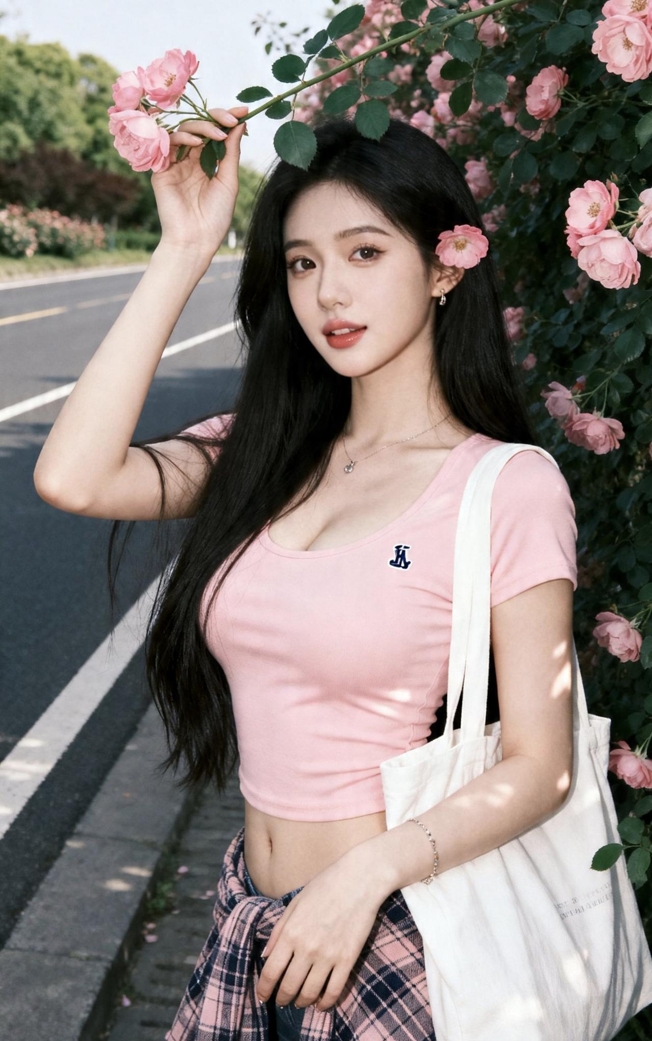 《蔷薇与少女》 风把初夏揉成粉,漫过墙垣 你站在花影里,成了最软的诗篇 黑瀑般的长发,垂落星光点点 指尖轻拈蔷薇,便牵住了一整个春天 粉衫熨帖着青春的曲线 腰腹的风,载着未染尘的甜 白帆布包盛着阳光的碎片 格纹衫系着少年气的闲散 一朵花别在发间,把温柔别进眉眼 抬眼时,撞碎了镜头里的流年 蔷薇在侧,风在耳边 你一笑,便让人间都软了眉眼 不必追着时光匆匆向前 此刻的花与你,皆是人间绝艳 一步一摇,是青春的舒展 一颦一笑,是岁月最温柔的答卷 蔷薇年年开,少女岁岁鲜 这一帧定格的,是永不褪色的甜 风会记得,花会记得 你与蔷薇,共赴的这场人间盛宴 粉嫩蔷薇花写真 蔷薇氛围感写真 蔷薇人像照 春日蔷薇少女 蔷薇自拍大片 花园蔷薇少女 仲夏蔷薇写真