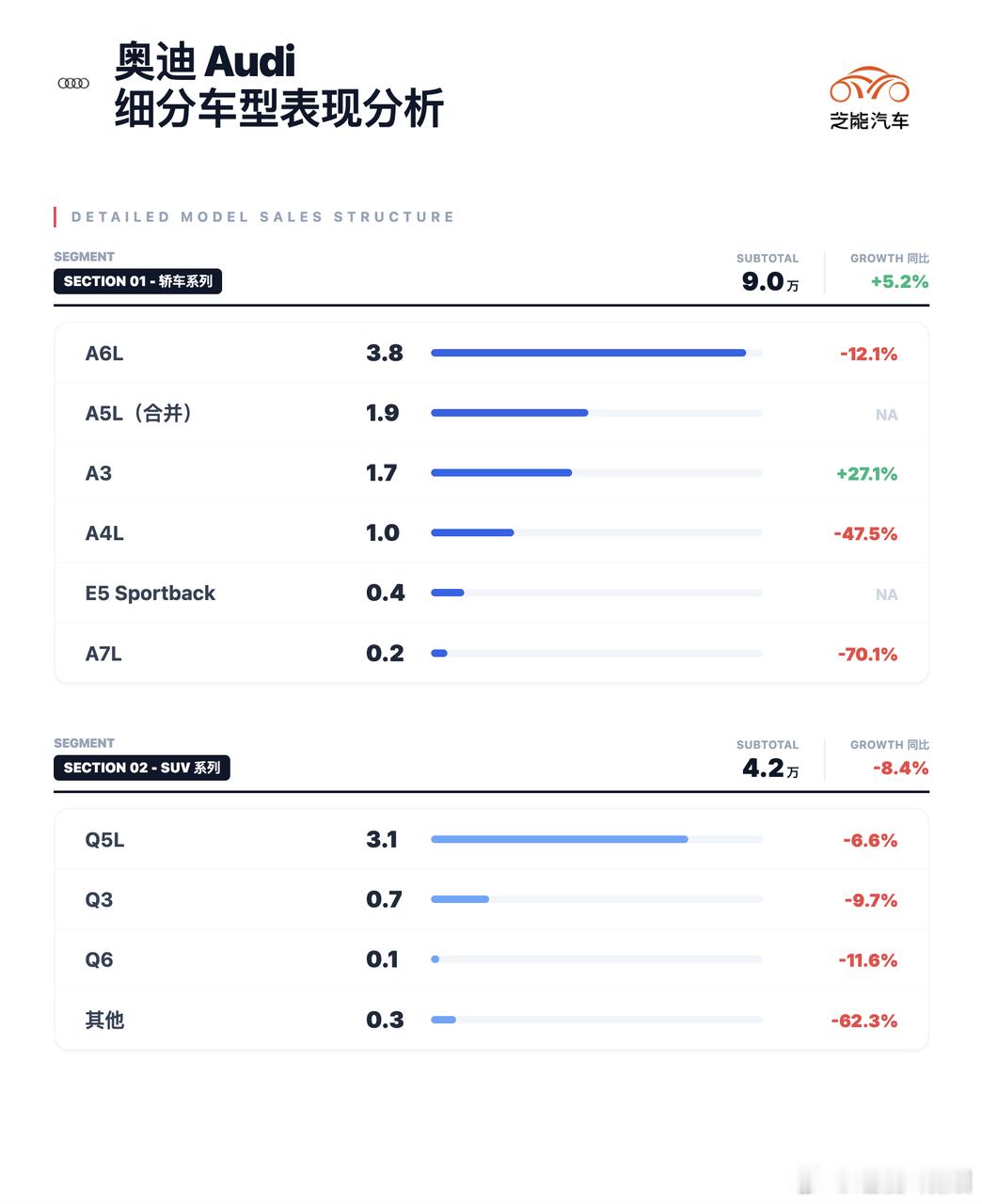 BBA 分化显著,奥迪小幅上行,成为一线豪华里为数不多的正向表现品牌,轿车产品支撑明显,SUV 端承压。宝马、奔驰均出现不同程度下滑,后者调整压力尤为突出。