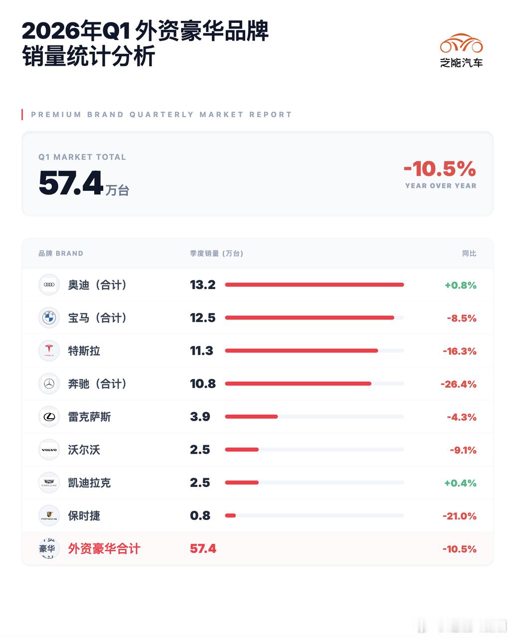 2026 年一季度,车企普遍发力出口与高端化,但外资豪华品牌整体表现疲软,市场大盘有所回落。