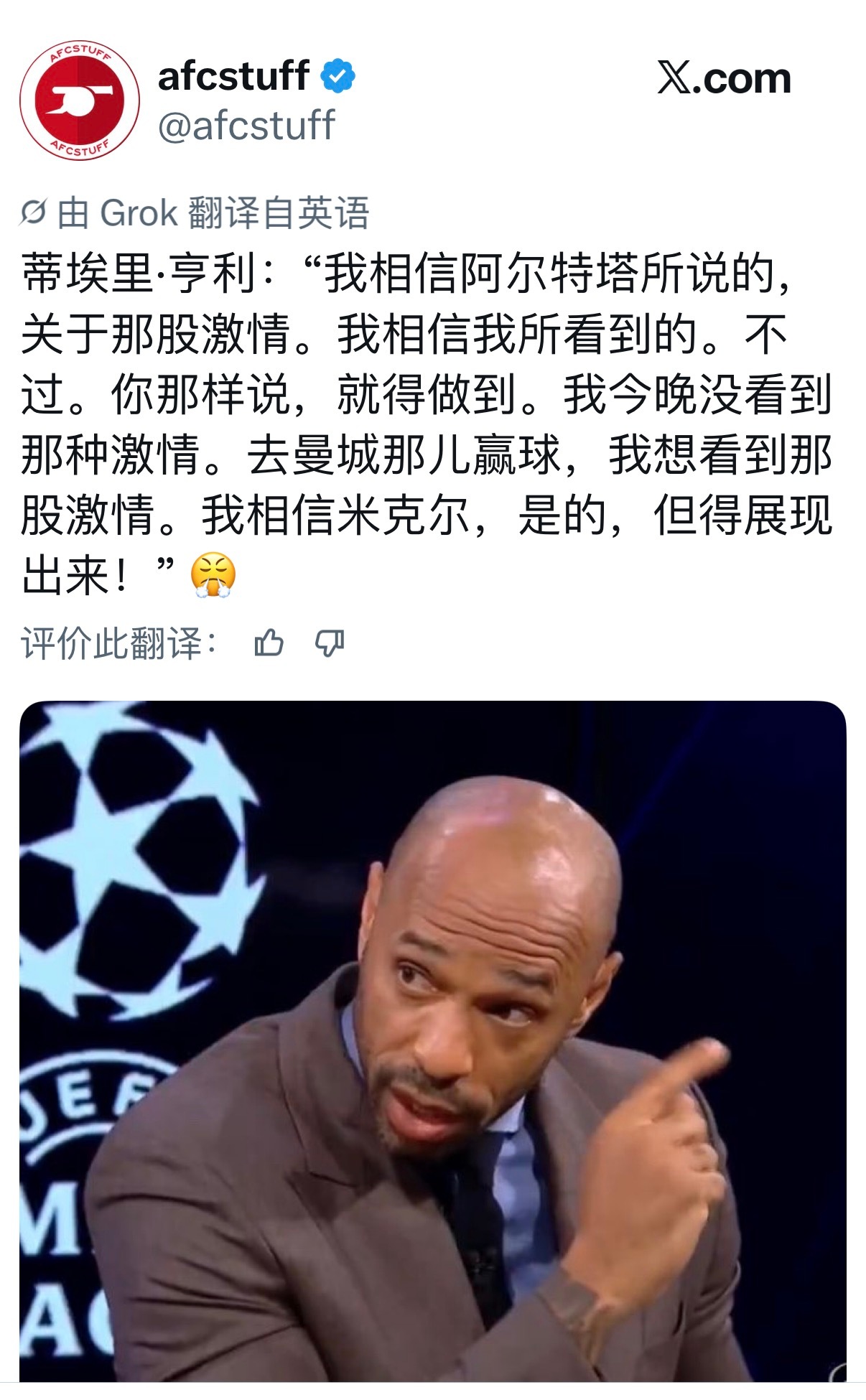 亨利说这场没看见那股fire,希望能在周末的伊蒂哈德看到。