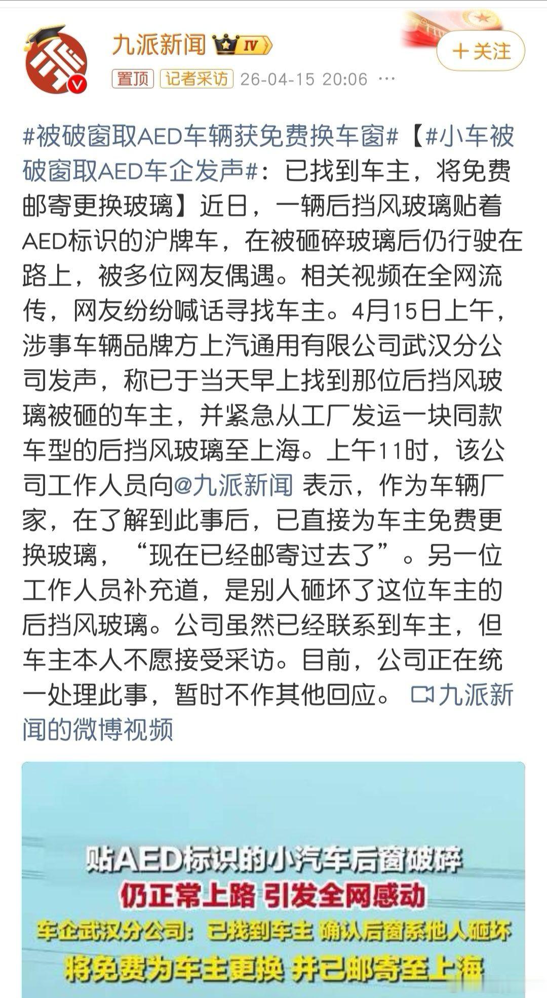 被破窗取AED车辆获免费换车窗就事论事,这次车企的反应很快,上汽通用抓住了这次曝光的机会。 对于双方的善举,我愿意点赞!👍